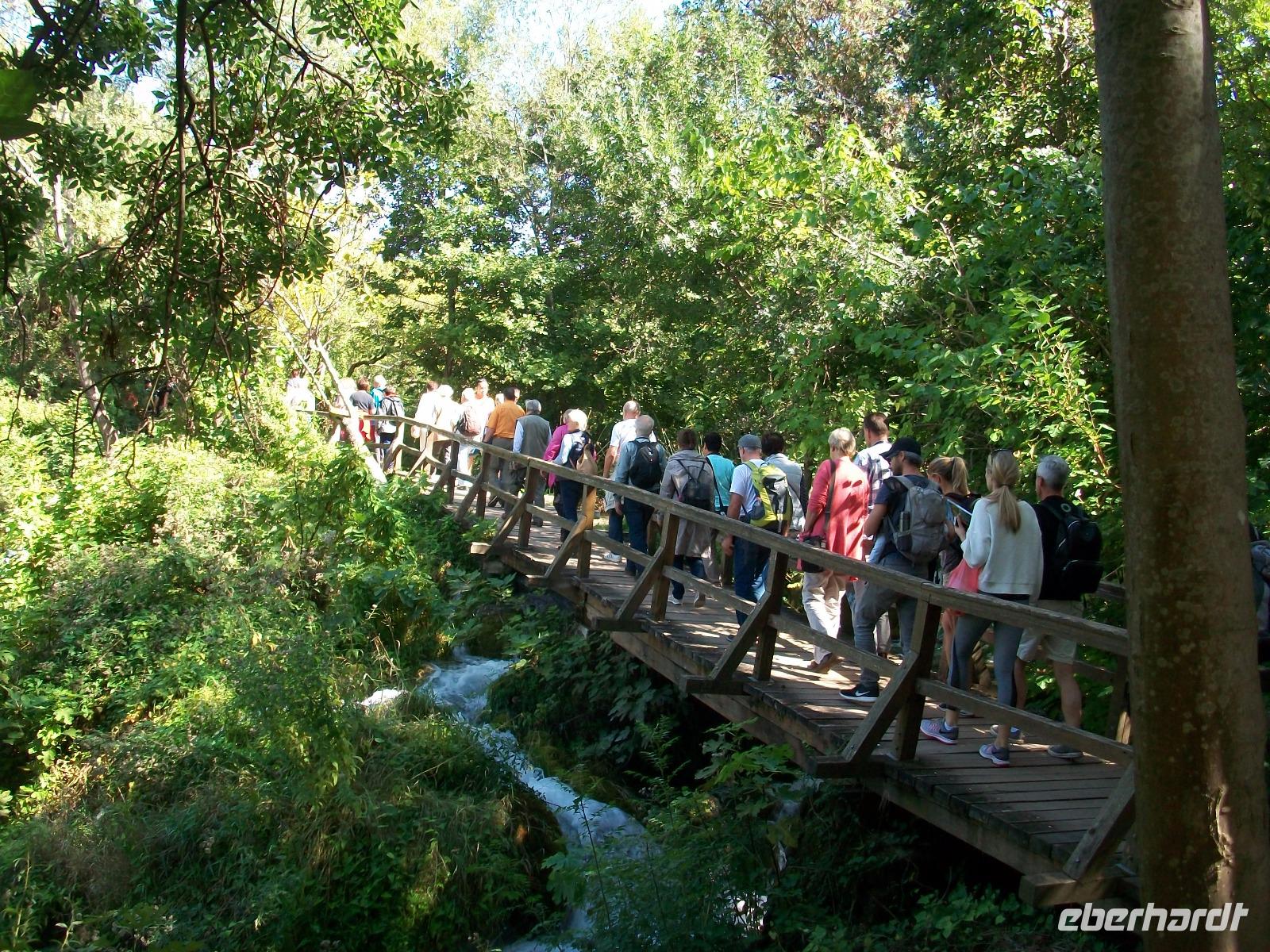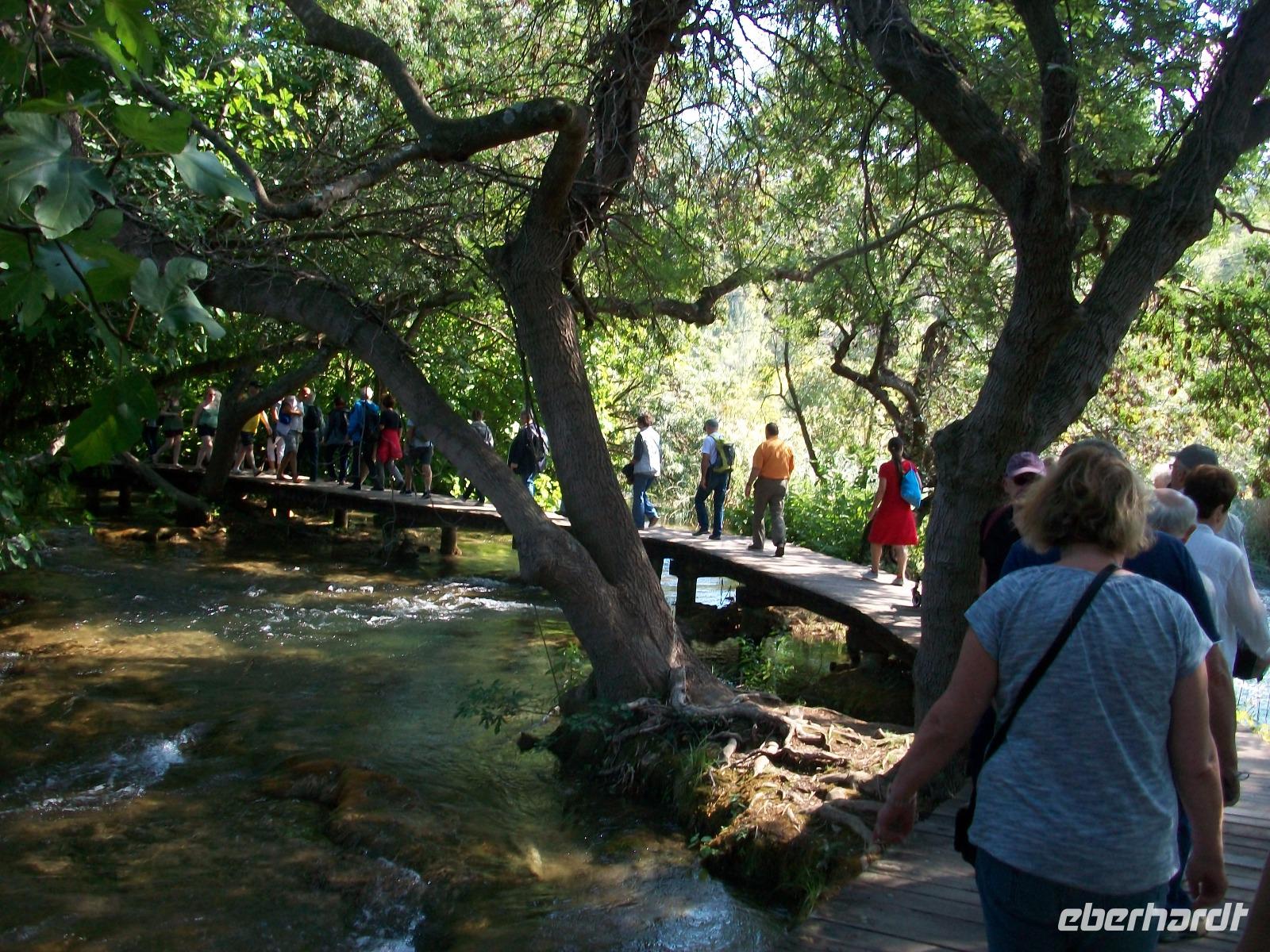 Hier werden wir von Dijana erwartet; mit ihr beginnen wir den Spaziergang um den Skradinski Buk, dem meistbesuchten Wasserfall dieses Nationalparks. Unser Weg führt uns einmal herum, über Knüppeldämme überqueren wir das rauschende Nass und unten angelangt halten wir den Atem an; die Wassermassen kommen uns direkt entgegen und da wir auf einer Brücke stehen, verschwinden sie buchstäblich unter unseren Füßen. Ein ganz großes Erlebnis!