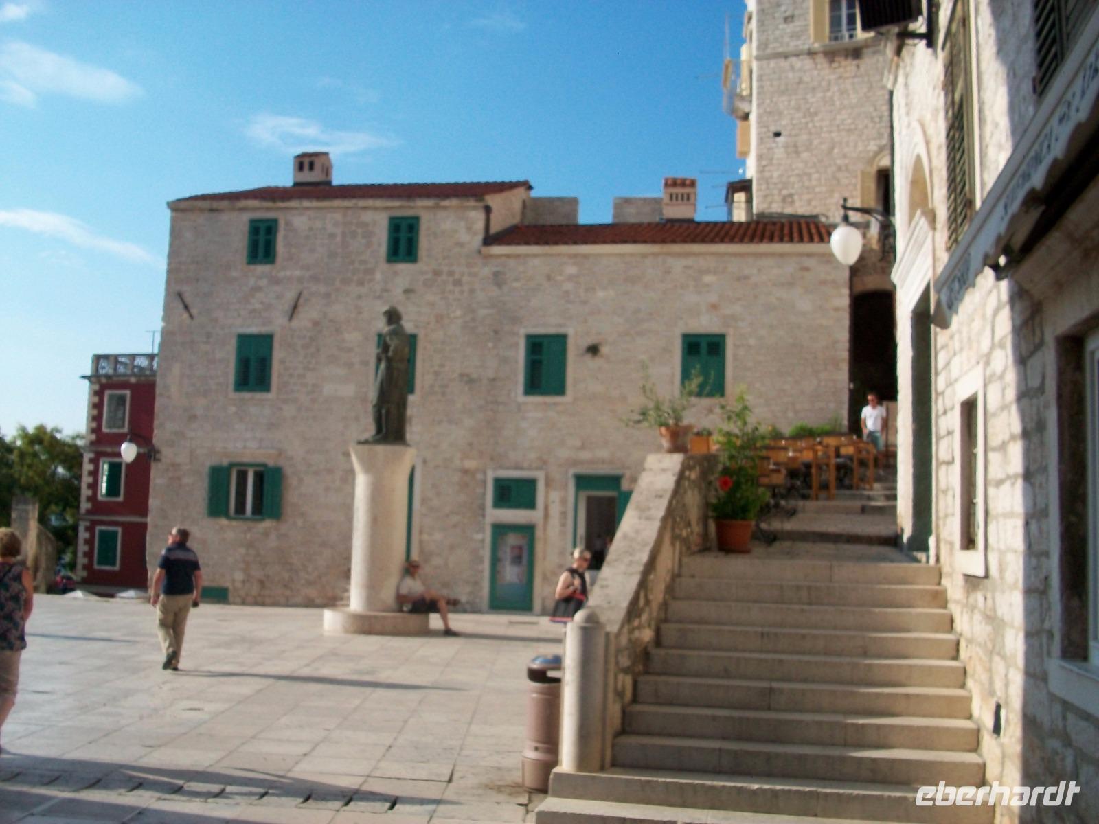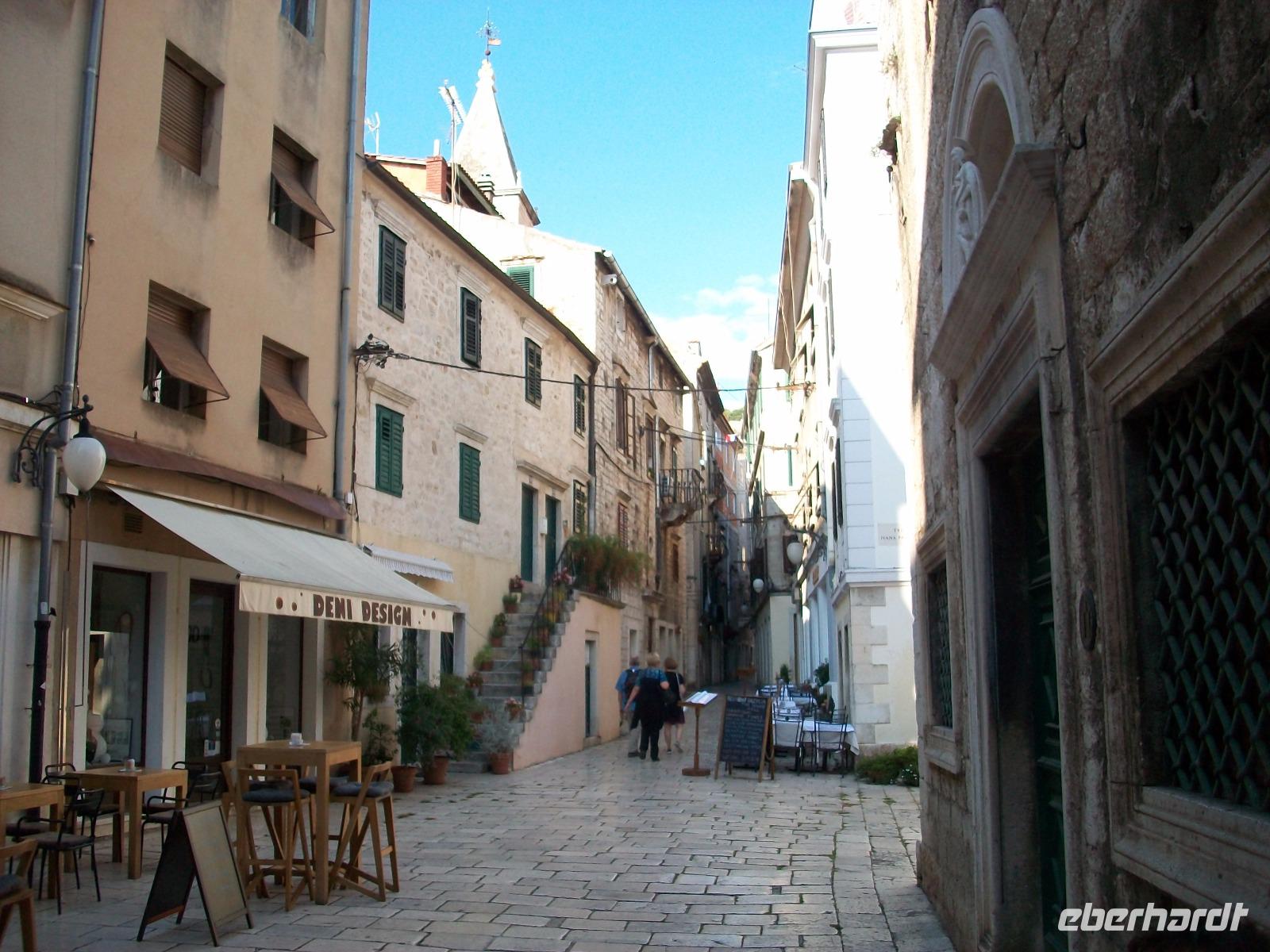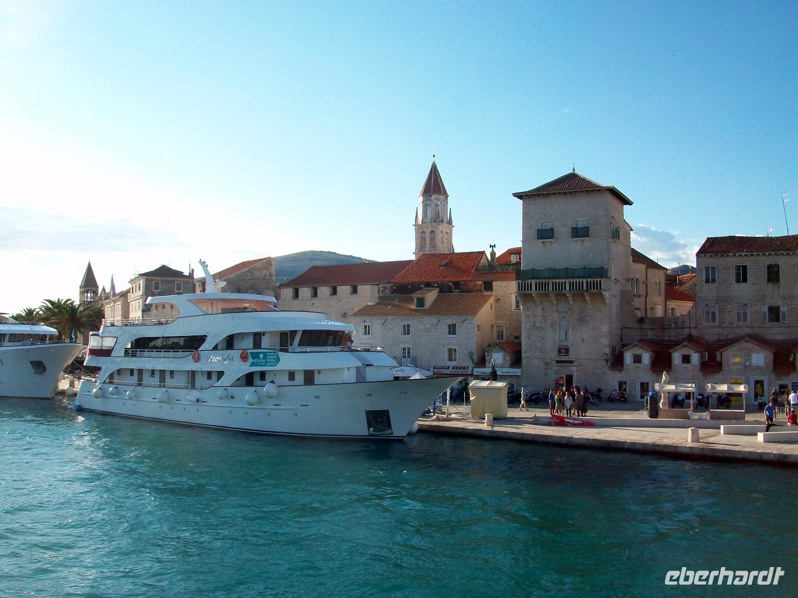 Dann führt uns der Weg hinunter an die Küste und entlang malerischer Buchten und verträumter Inseln erreichen wir Trogir. Mit Dijana gehen wir jetzt auf eine Zeitreise und drehen das Rad der Zeit gleich um einige Jahrhunderte zurück. Trogir blieb uns beinahe im Originalzustand erhalten und so streifen wir durch einsame Gässchen, über belebte Plätze und genehmigen uns nach der Führung einen Kaffee auf der schönen und sonnendurchfluteten Promenade.