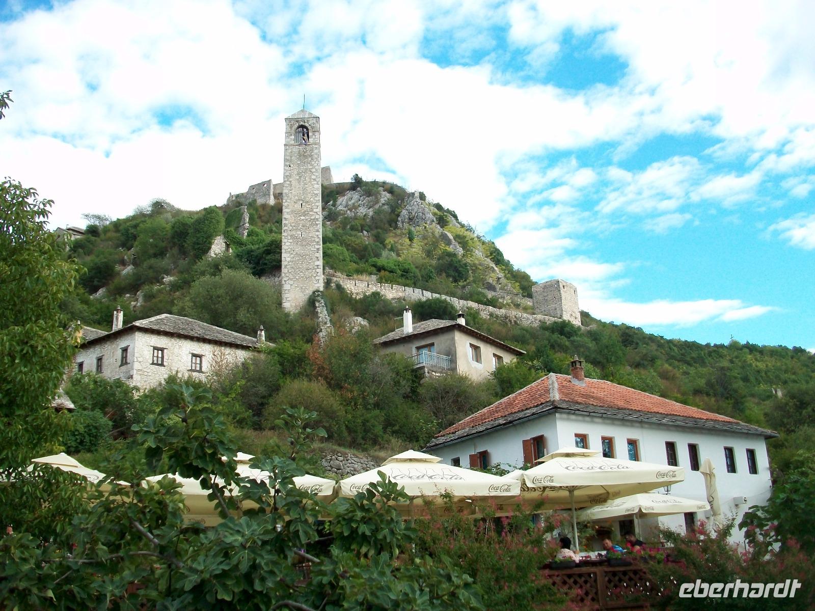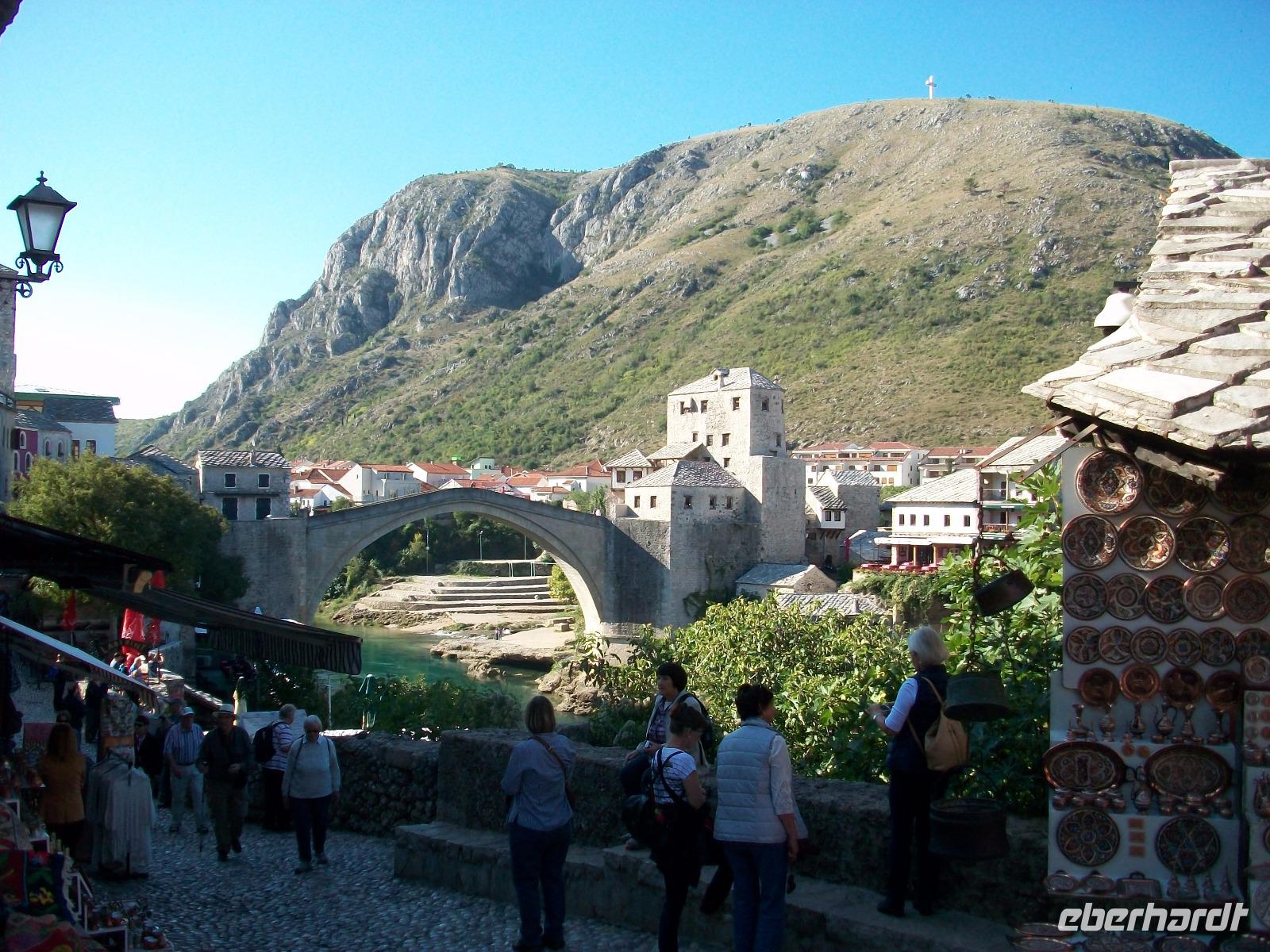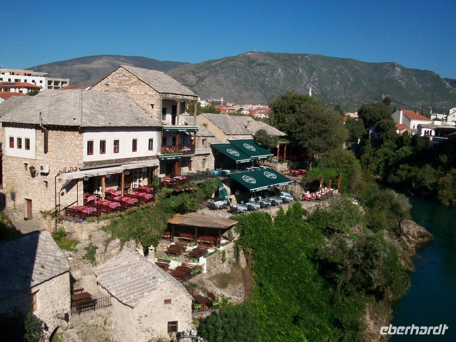 Am Nachmittag setzen wir die Fahrt fort; entlang der Küste und des Biokovo - Gebirges geht es in die Herzegowina, zuvor überschreiten wir problemlos die Grenze zu Bosnien und sind bald im fruchtbaren Tal der Neretva angelangt. Besonders malerisch schlängelt sich der Fluss beim Ort Pocitelj durch die Berge, diesem Türkischen Dorf wie es oft genannt wird, statten wir selbstverständlich einen Besuch ab. Steil steigen die Häuser am Hang hinauf, hier gibt es eine Moschee, ein ehemaliges Badehaus, es ist heute ein Café, und sehr viel morgenländisches Flair. Gerade als wir aus dem Bus steigen ruft der Muezzin die Gläubigen zum Gebet. Wir steigen bergan und werfen oben von der Festung einen Blick hinunter auf die Häuser und den Fluss, ein schönes Erlebnis fast am Ende des Tages. Eine gute halbe Stunde sind wir dann noch unterwegs ehe wir unser sehr schönes Hotel in Mostar erreichen.