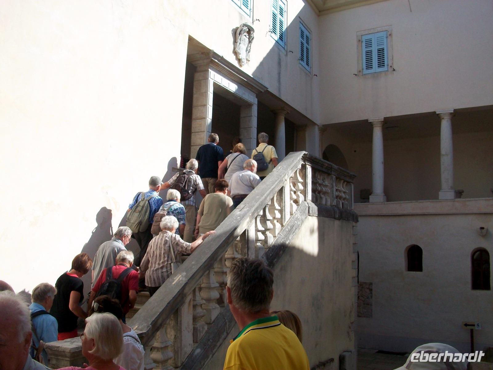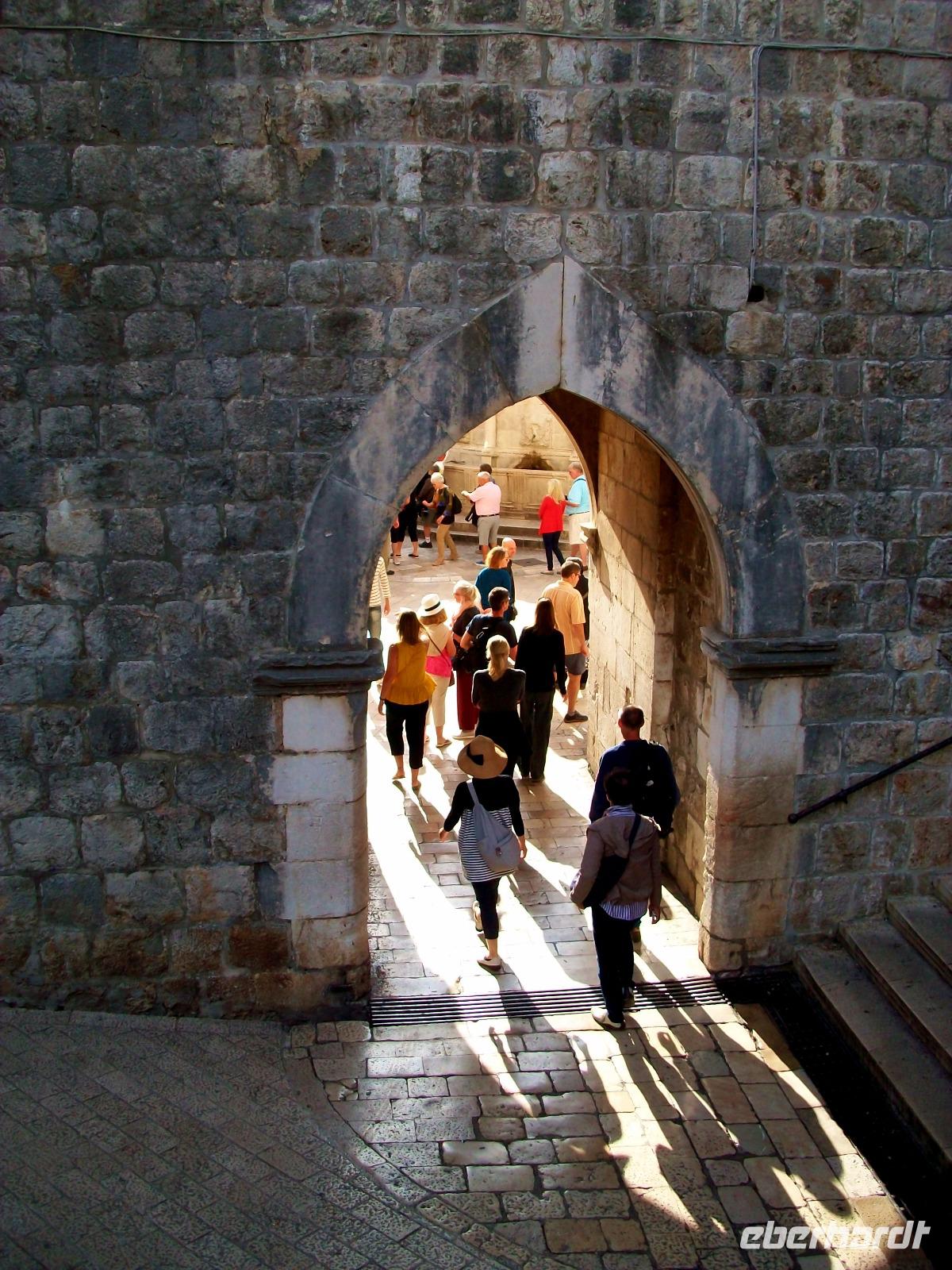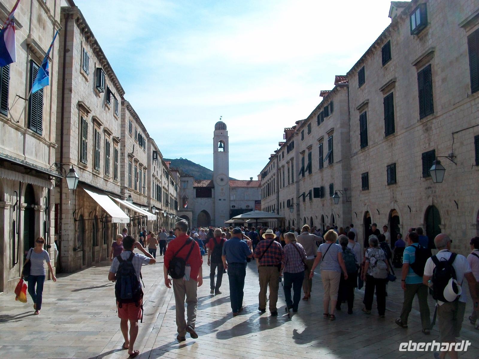 Ein Kreuzfahrer hat angelegt und somit gibt es einigen Trubel in der Stadt, aber Ivana unsere Führerin, meistert die Situation professionell. Über die Zugbrücke gelangen wir durch die Stadtmauer zu Stradun, Hauptfußgängerzone zu allen Zeiten. Am großen Onofriobrunnen erfahren wir etwas zur Geschichte um wenig später hinter die altehrwürdigen Mauern des Franziskanerklosters mir der uralten Apotheke zu verschwinden. Dann geht es weiter über die Gassen und Plätze der Stadt; wir lernen den Uhrturm kennen, das ehemalige Zollhaus schwenken in den Alten Hafen ein und beenden die Führung am einstigen Machtzentrum der Stadt, dem Rektorenpalast. Gegenüber liegt die Kathedrale und nachdem Ivana ihre wissenswerte Führung beendet hat, besteht die Chance im Inneren dieses Gotteshaus den Tizian und andere Kunstschätze zu bewundern.