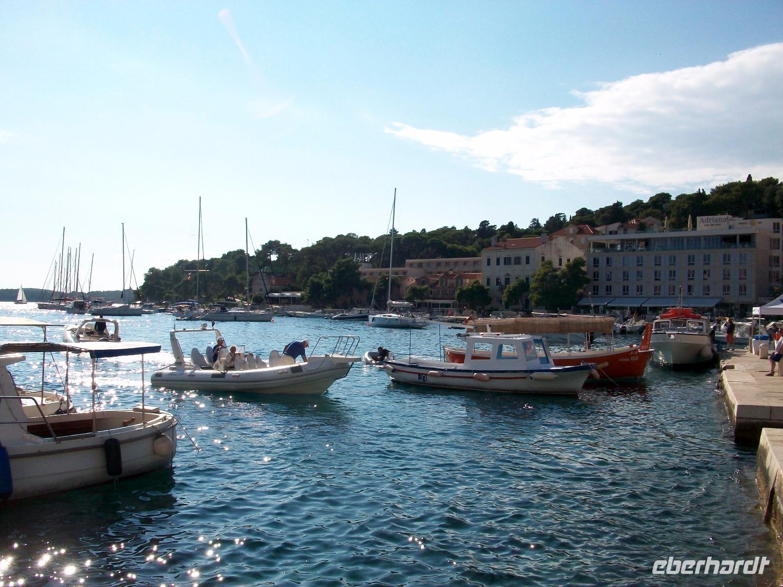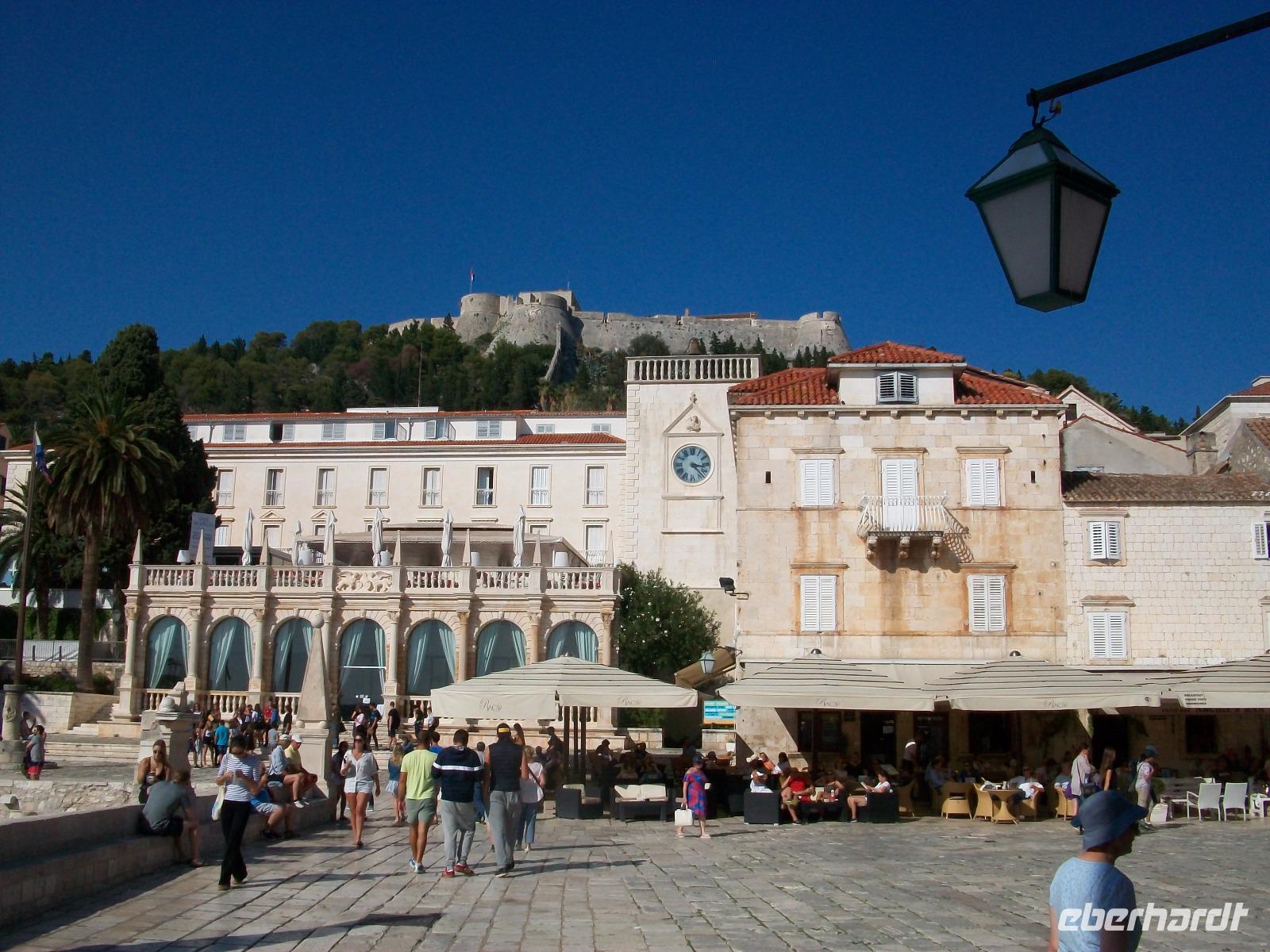 Durch einen Tunnel gelangen wir zur anderen Inselseite und zum Ort Hvar selbst. Die zeitigere Fähre brachte und etwas mehr Freizeit um später noch mit einer Führung den reizvollen Ort intensiv zu erkunden. Danach fahren wir zu unserem Hotel und nach dem leckeren Abendessen gönnen wir uns noch einen Spaziergang ins abendlich beleuchtete Hvar mit den heimlichen, engen Gassen, dem schön angeleuchteten Arsenal und gönnen uns einen Blick auf die Promenade an welcher zahlreiche Jachten festgemacht haben die leicht auf den Wellen schaukeln.
