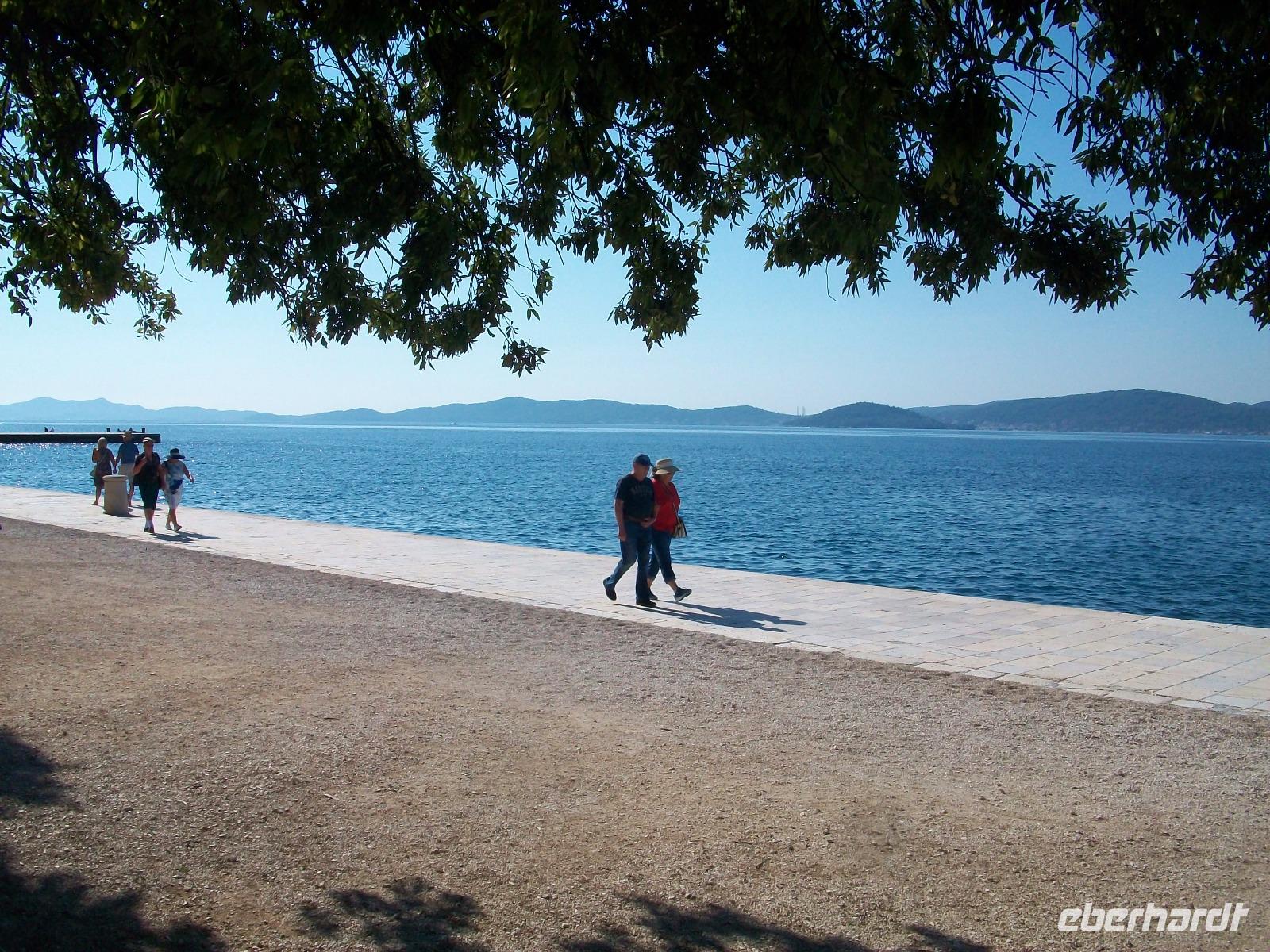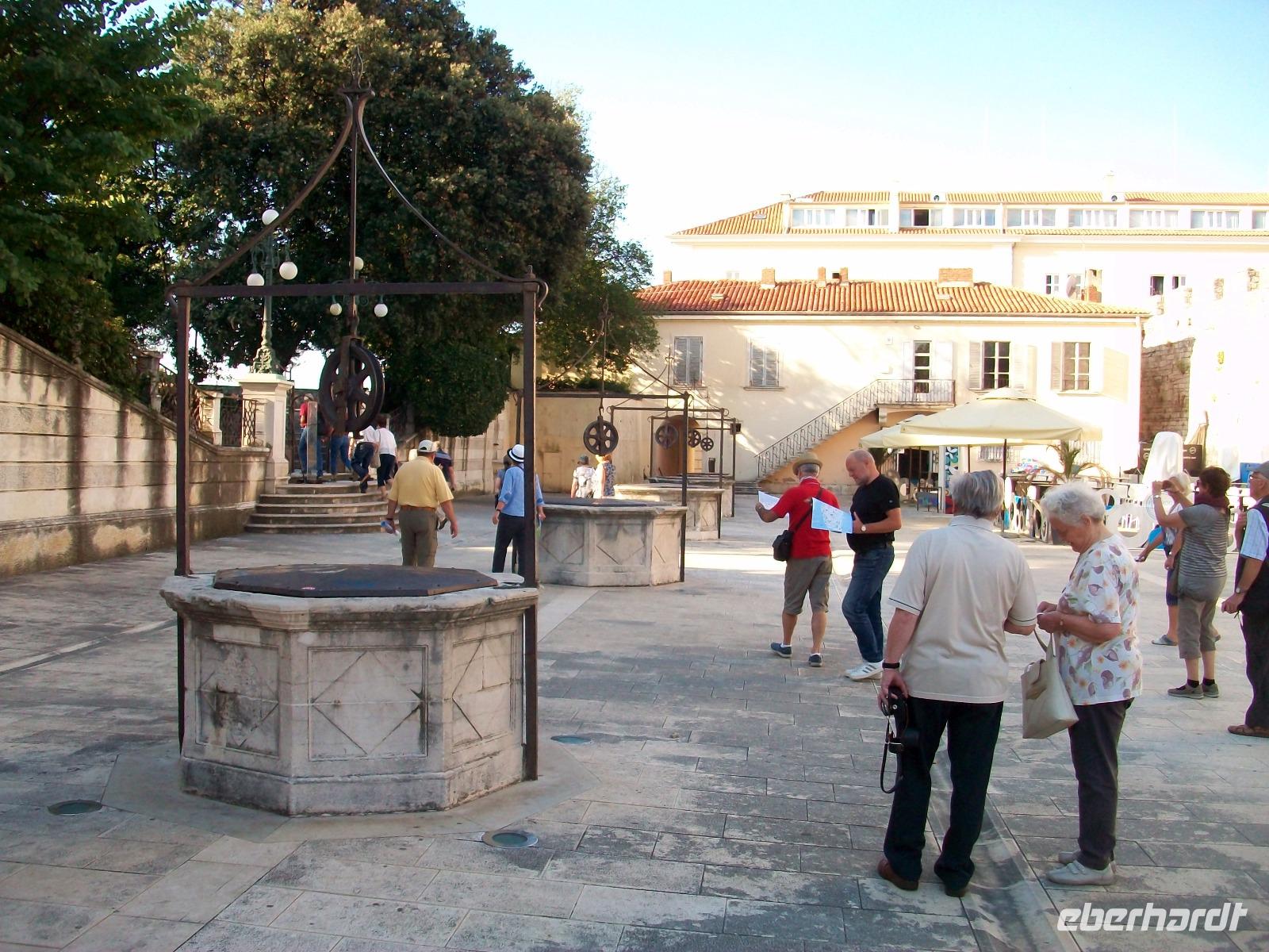 28.9.2017. Auch heute werden wir von der Sonne verwöhnt! Am Vormittag wollen wir noch eine sehenswerte Stadt besuchen die uns einiges an Historie zeigen wird. Wir gelangen vom Hotel nach Zadar und hier, am Hafen, erwartet uns die Führerin. Zadar hatte im 2. Weltkrieg schwere Zerstörungen zu erleiden, vieles davon ist aber wieder aufgebaut und so beginnen wir den Weg durch die Stadt der verschiedenen Stile. Zuerst werfen wir einen Blick auf das Landtor mit dem venezianischen Löwen. Vorbei am Platz der Fünf Brunnen die eigentlich Zisternen sind, schauen wir auf die Außenfassade der Siomonskirche. Dann geht es zum Hauptplatz mit Rathaus, Wache und Loggia, hier herrscht ein munteres Leben. Über die Fußgängerzone bummeln wir nun zum dem Platz wo es gleich mehrere Bauwerke der verschiedenen Zeitepochen zu bestaunen gibt. Auf den Überresten des Forum Romanums erhebt sich die Rotunde der Donatskirche und dahinter befindet sich die Kathedrale mit dem alles überragenden Glockenturm. Dann führt uns der Weg noch zur äußersten Spitze der Halbinsel, hier machen die Wellen der Adria Musik auf der Meeresorgel, noch ein besonderes Erlebnis dieses Tages.