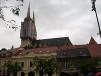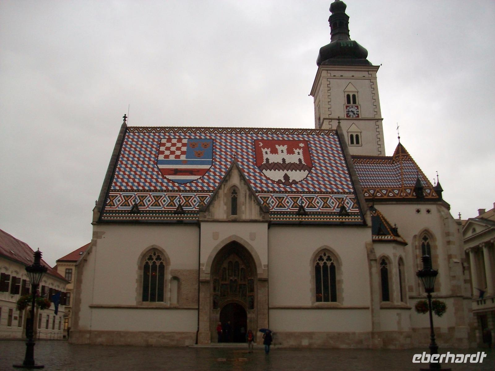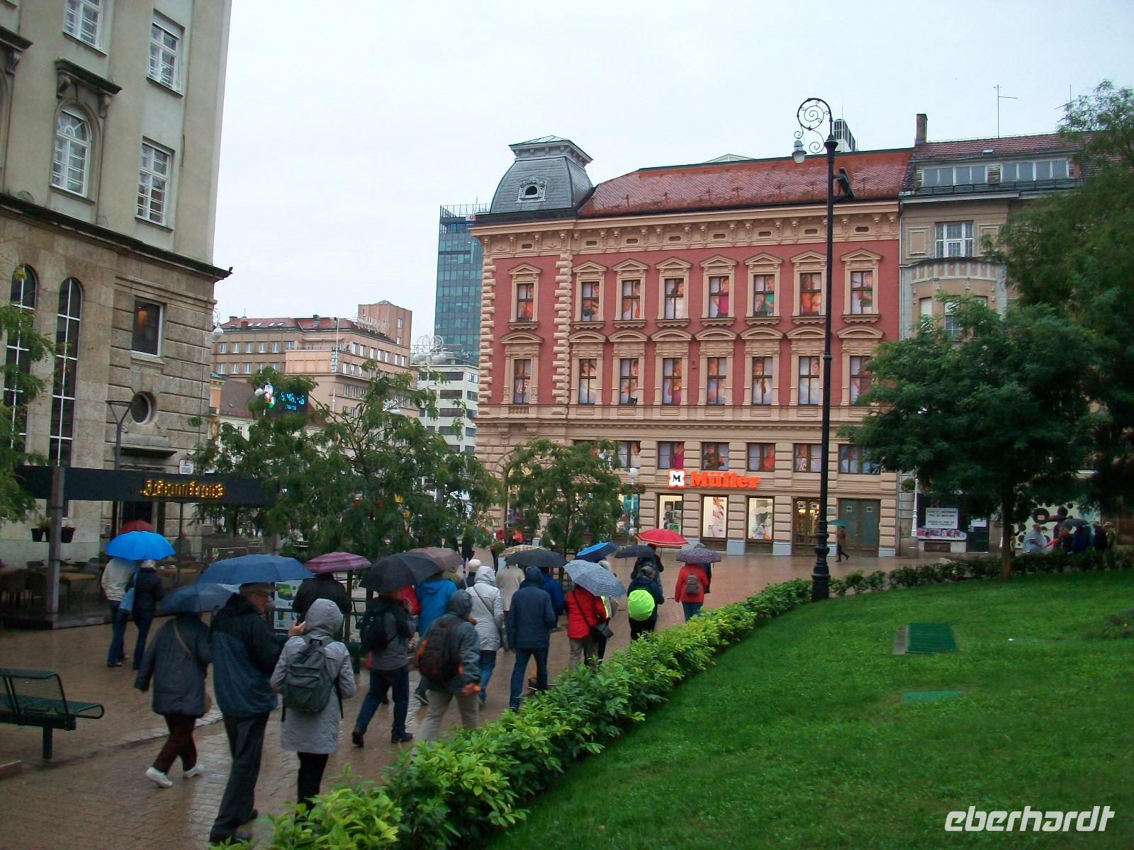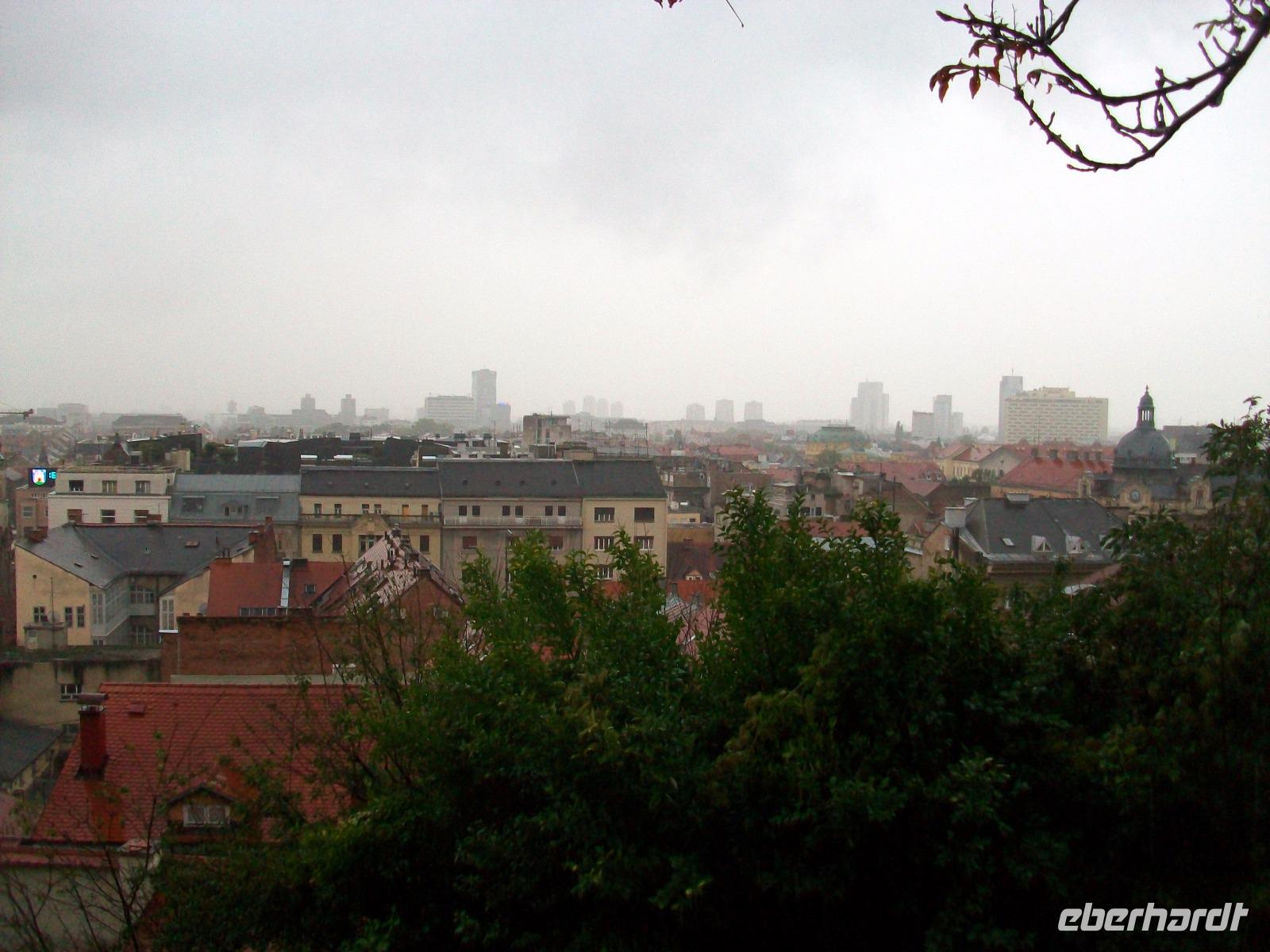 Danach gelangen wir zur Kathedrale und hoffen dass es Petrus nicht mehr so kräftig regnen lässt, vorerst scheint es so. Wir schauen in diese mächtige Kirche hinein um danach einen Bummel in der Oberstadt zu unternehmen. Das ist nun der älteste Teil von Zagreb; durch das Steintor gelangen wir hinauf zum Markusplatz, hier wird die Politik des Landes gemacht. Dann genehmigen wir uns am Aussichtspunkt noch einen Blick auf die Stadt, er ist heute nicht so reizvoll, auch weil es Petrus nun wieder kräftiger regnen lässt. Es bleibt dabei als wir unten am Jelacicplatz anlagen, hier sind wir alle patschnass und somit entschließen wir uns den Bus gleich zu bestellen, die Freizeit fällt leider buchstäblich ins Wasser, schade!