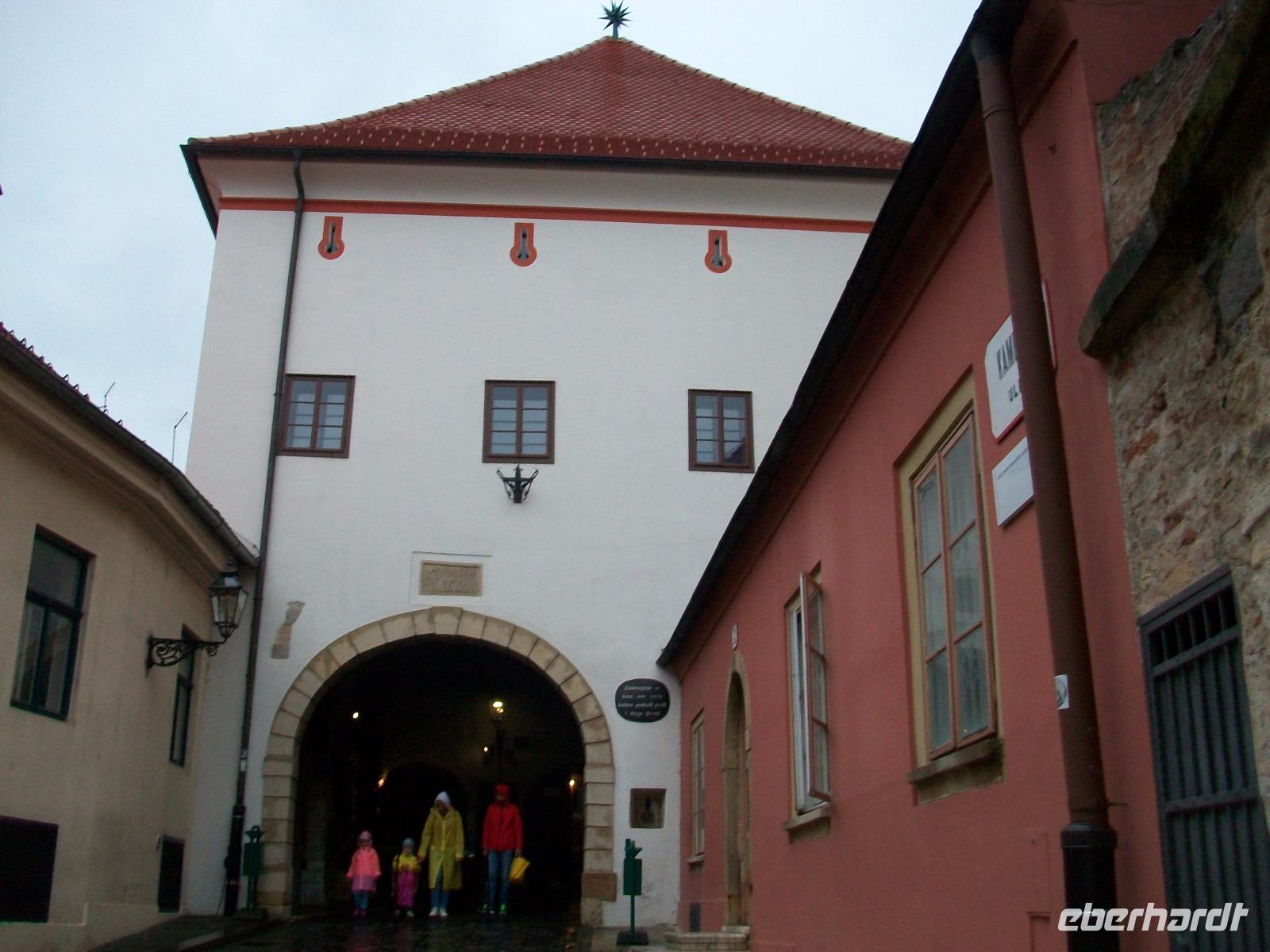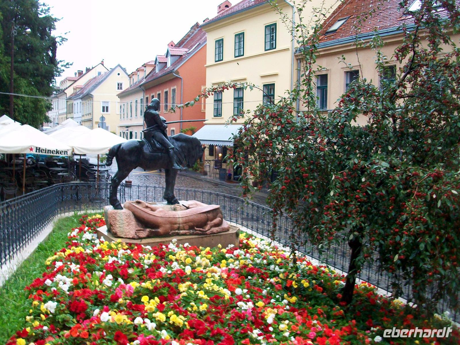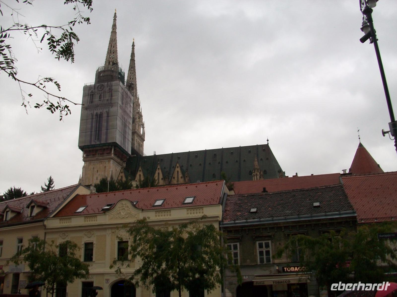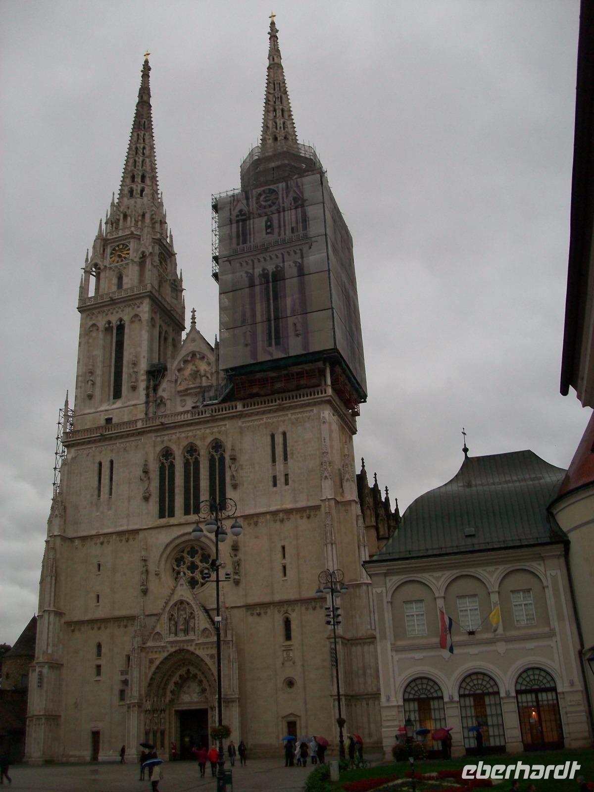 Danach gelangen wir zur Kathedrale und hoffen dass es Petrus nicht mehr so kräftig regnen lässt, vorerst scheint es so. Wir schauen in diese mächtige Kirche hinein um danach einen Bummel in der Oberstadt zu unternehmen. Das ist nun der älteste Teil von Zagreb; durch das Steintor gelangen wir hinauf zum Markusplatz, hier wird die Politik des Landes gemacht. Dann genehmigen wir uns am Aussichtspunkt noch einen Blick auf die Stadt, er ist heute nicht so reizvoll, auch weil es Petrus nun wieder kräftiger regnen lässt. Es bleibt dabei als wir unten am Jelacicplatz anlagen, hier sind wir alle patschnass und somit entschließen wir uns den Bus gleich zu bestellen, die Freizeit fällt leider buchstäblich ins Wasser, schade!