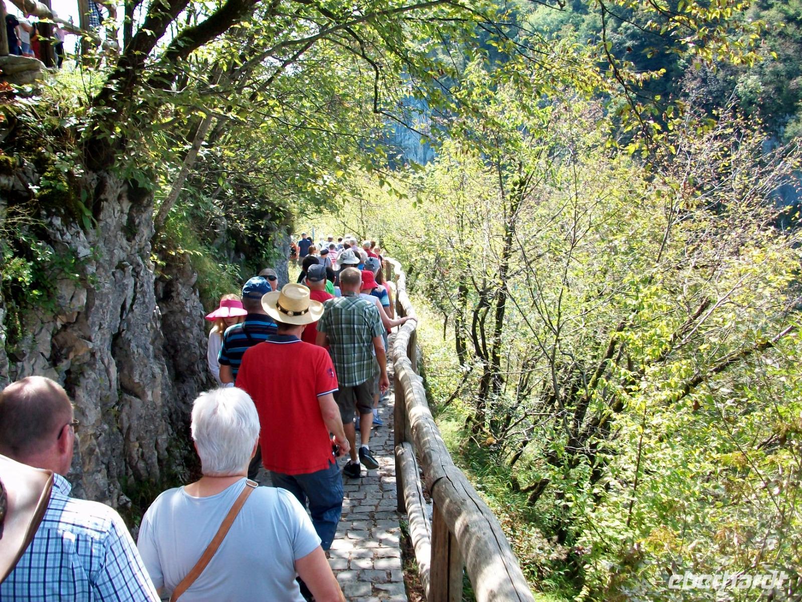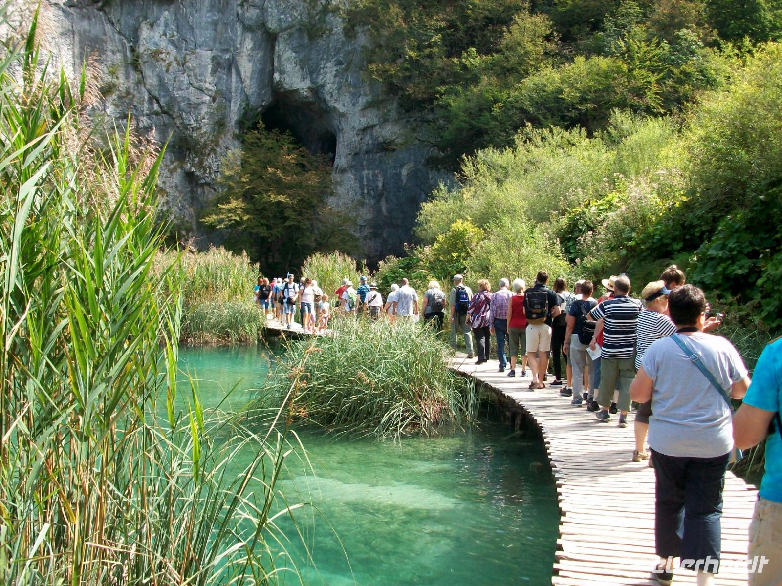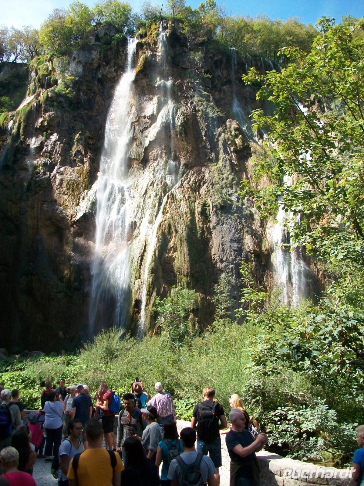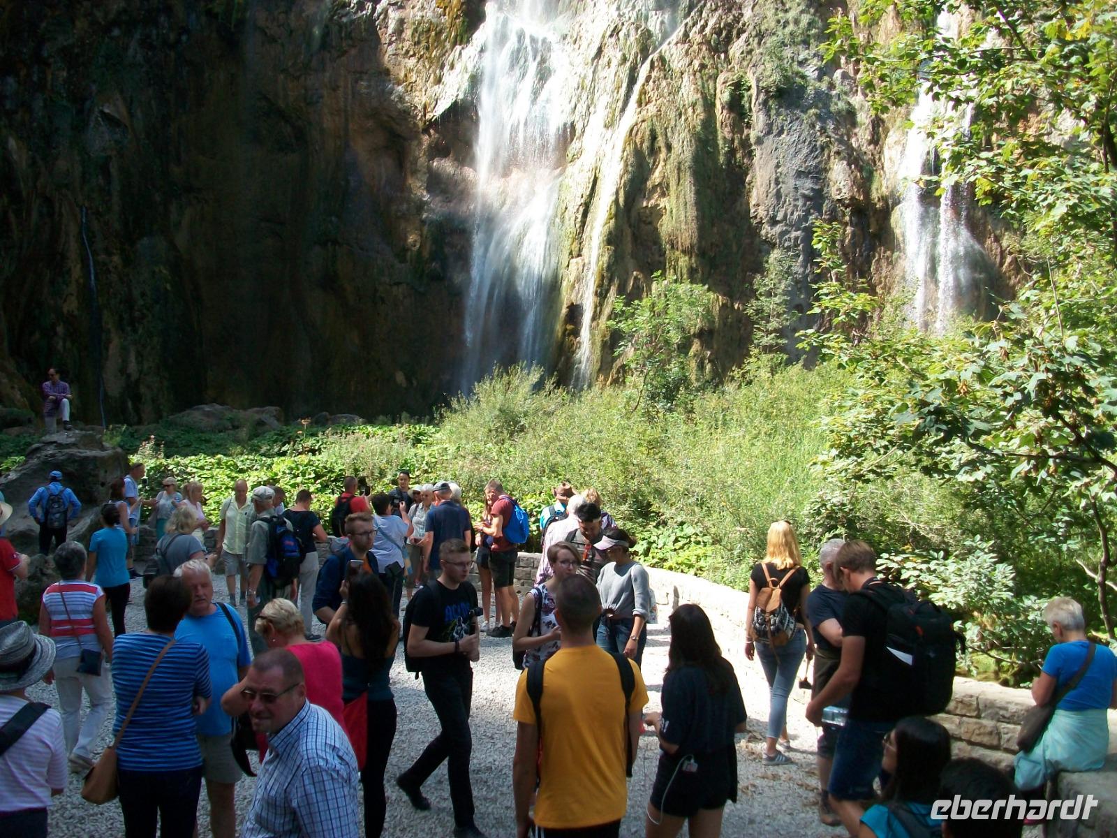 10.9.2018. Nach der quirligen Hauptstadt wollen wir uns an diesem Tag ein schönes Stück Natur anschauen. Mein erster Blick aus dem Fenster zeigt mir dass es auch heute schönes Wetter geben wird und somit starten wir gegen neun mit Vorfreude auf dieses besondere Ereignis. Unser Weg führt uns zunächst über die Autobahn die wir beim Ort Karlovac aber schon wieder verlassen. Dann geht es über Land und vom Bus aus sehen wir die dünnbesiedelte und dennoch faszinierende Gegend. Gegen Mittag treffen wir an unserem Ziel ein; hier gönnen wir uns zunächst einen kleinen Mittagsimbiss und dann geht es hinein in den Park. Schon von oben sehen wir den Großen Wasserfall und wir halten den Atem an welch ein gigantisches Schauspiel sich vor unseren Augen abspielt. Der Weg hinunter führt uns an den Fuß des Falles, auch hier ist er ein Ereignis. Beim Hinuntergehen sahen wir schon die türkisblaue Farbe der Seen, und als wir an den Ufern entlanggehen, erscheint uns diese Farbe fast unwirklich. Auf den verbindenden Knüppeldämmen kommen wir ganz nah an die Kaskaden heran; die Wege führen immer aufwärts bis wir den Koziaksee erreicht haben. Hier legen wir nun ungewollt eine Pause ein denn wir müssen auf das Schiff warten welches uns hinüber zum anderen Ufer bringen wird. Als wir es schließlich betreten können wird die Überfahrt zum Genuss, langsam gleiten die Ufer am Boot vorbei.