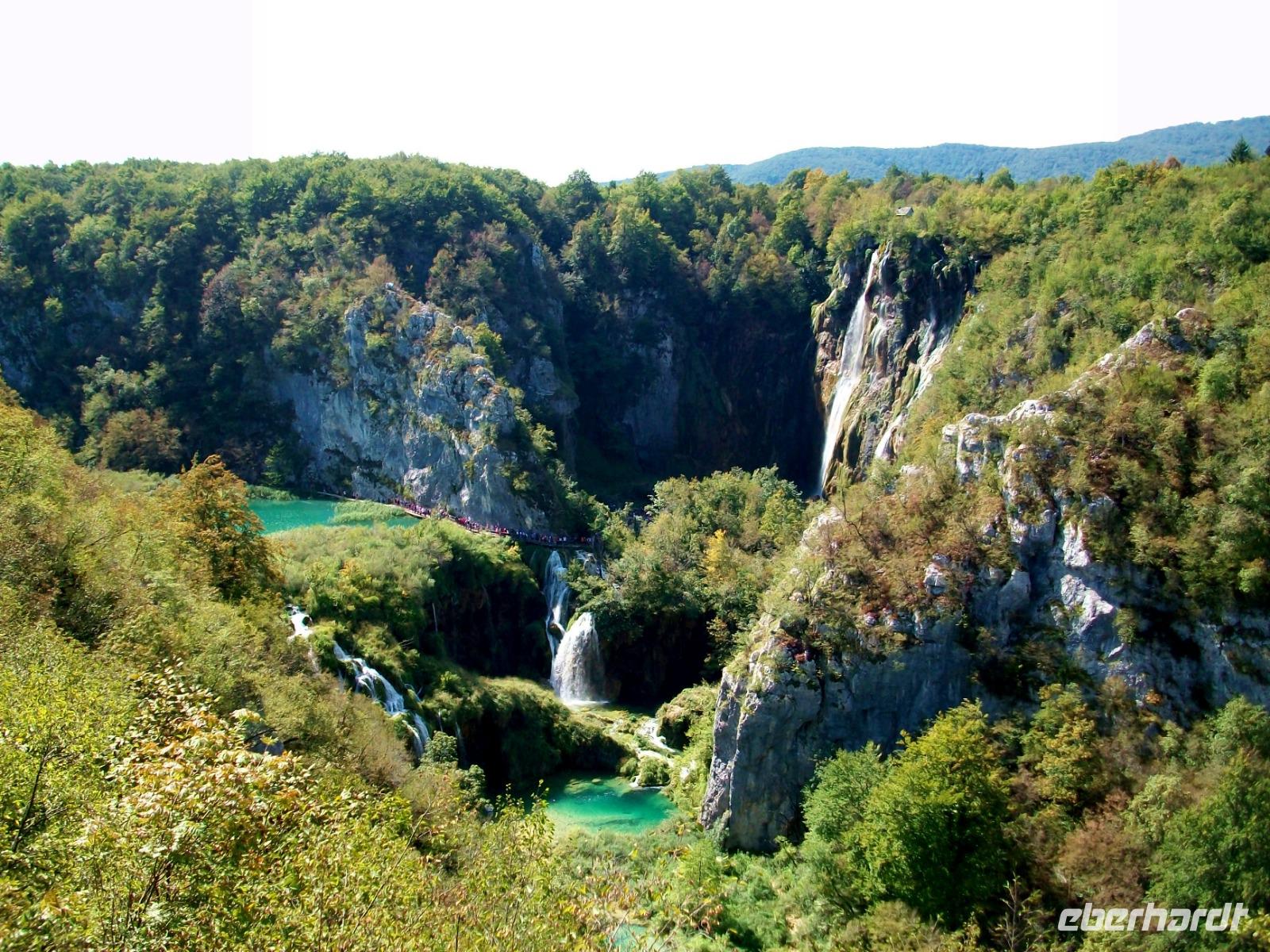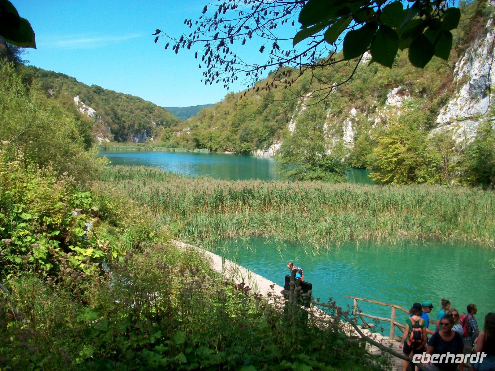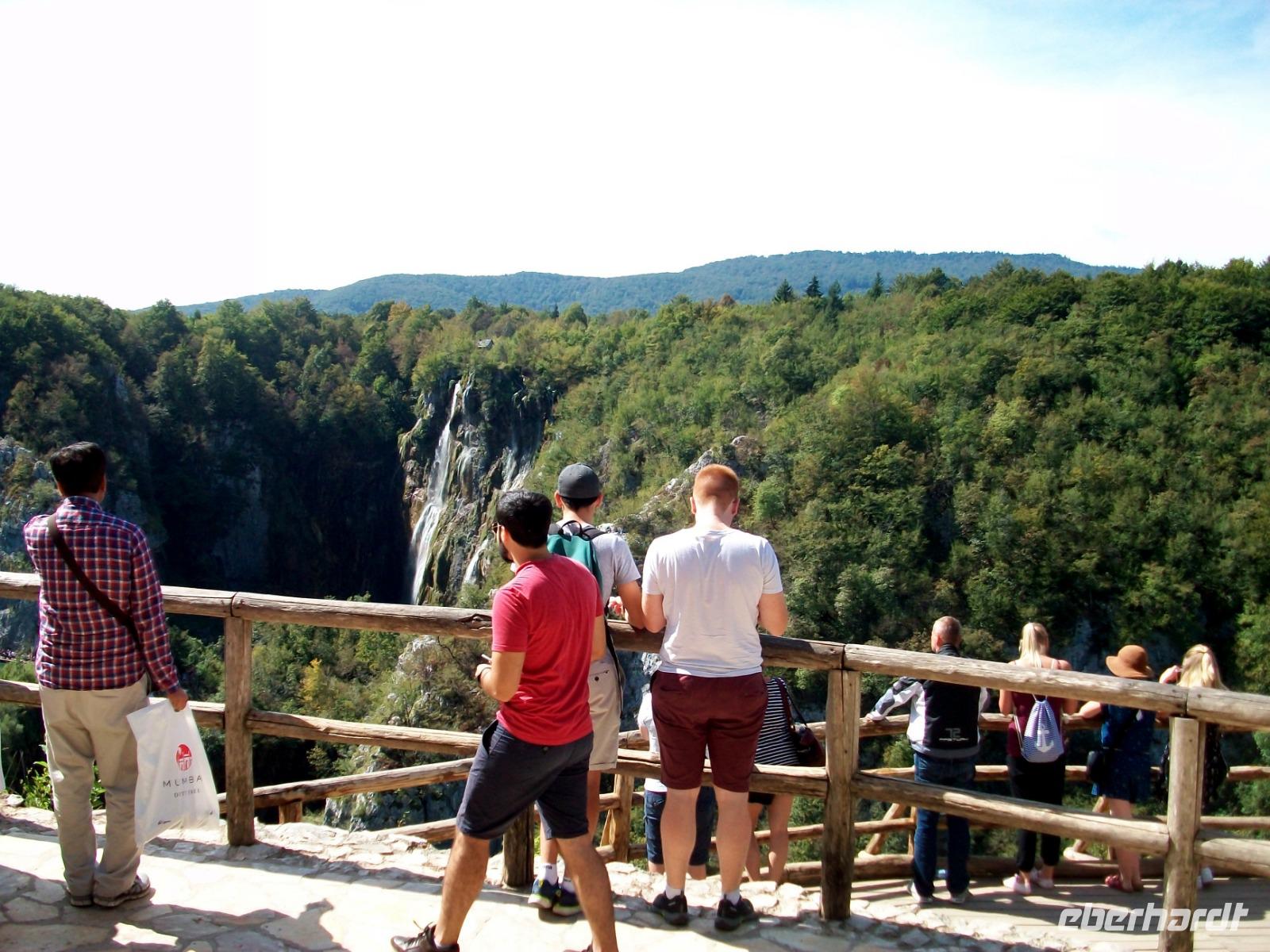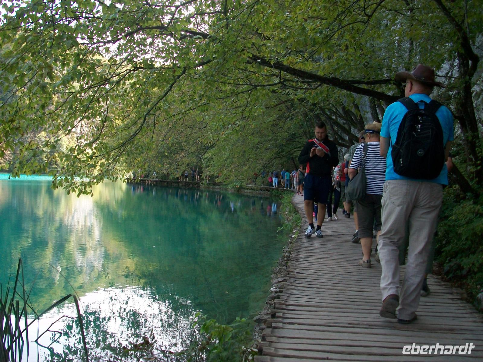 10.9.2018. Nach der quirligen Hauptstadt wollen wir uns an diesem Tag ein schönes Stück Natur anschauen. Mein erster Blick aus dem Fenster zeigt mir dass es auch heute schönes Wetter geben wird und somit starten wir gegen neun mit Vorfreude auf dieses besondere Ereignis. Unser Weg führt uns zunächst über die Autobahn die wir beim Ort Karlovac aber schon wieder verlassen. Dann geht es über Land und vom Bus aus sehen wir die dünnbesiedelte und dennoch faszinierende Gegend. Gegen Mittag treffen wir an unserem Ziel ein; hier gönnen wir uns zunächst einen kleinen Mittagsimbiss und dann geht es hinein in den Park. Schon von oben sehen wir den Großen Wasserfall und wir halten den Atem an welch ein gigantisches Schauspiel sich vor unseren Augen abspielt. Der Weg hinunter führt uns an den Fuß des Falles, auch hier ist er ein Ereignis. Beim Hinuntergehen sahen wir schon die türkisblaue Farbe der Seen, und als wir an den Ufern entlanggehen, erscheint uns diese Farbe fast unwirklich. Auf den verbindenden Knüppeldämmen kommen wir ganz nah an die Kaskaden heran; die Wege führen immer aufwärts bis wir den Koziaksee erreicht haben. Hier legen wir nun ungewollt eine Pause ein denn wir müssen auf das Schiff warten welches uns hinüber zum anderen Ufer bringen wird. Als wir es schließlich betreten können wird die Überfahrt zum Genuss, langsam gleiten die Ufer am Boot vorbei.