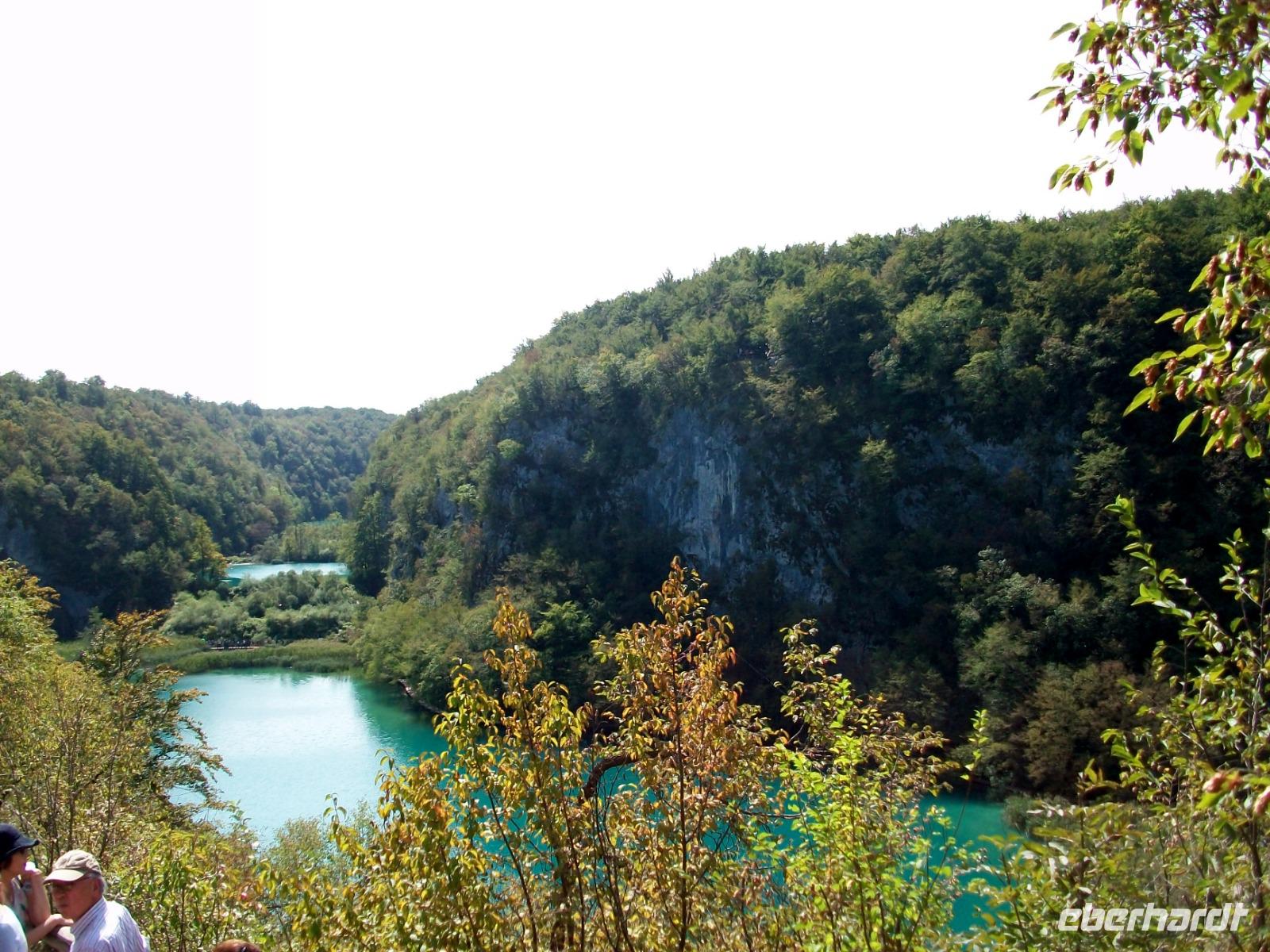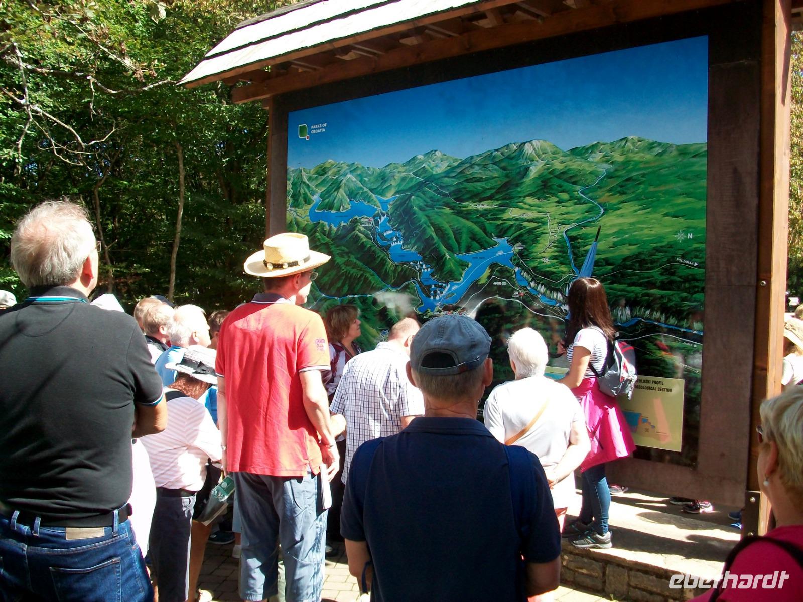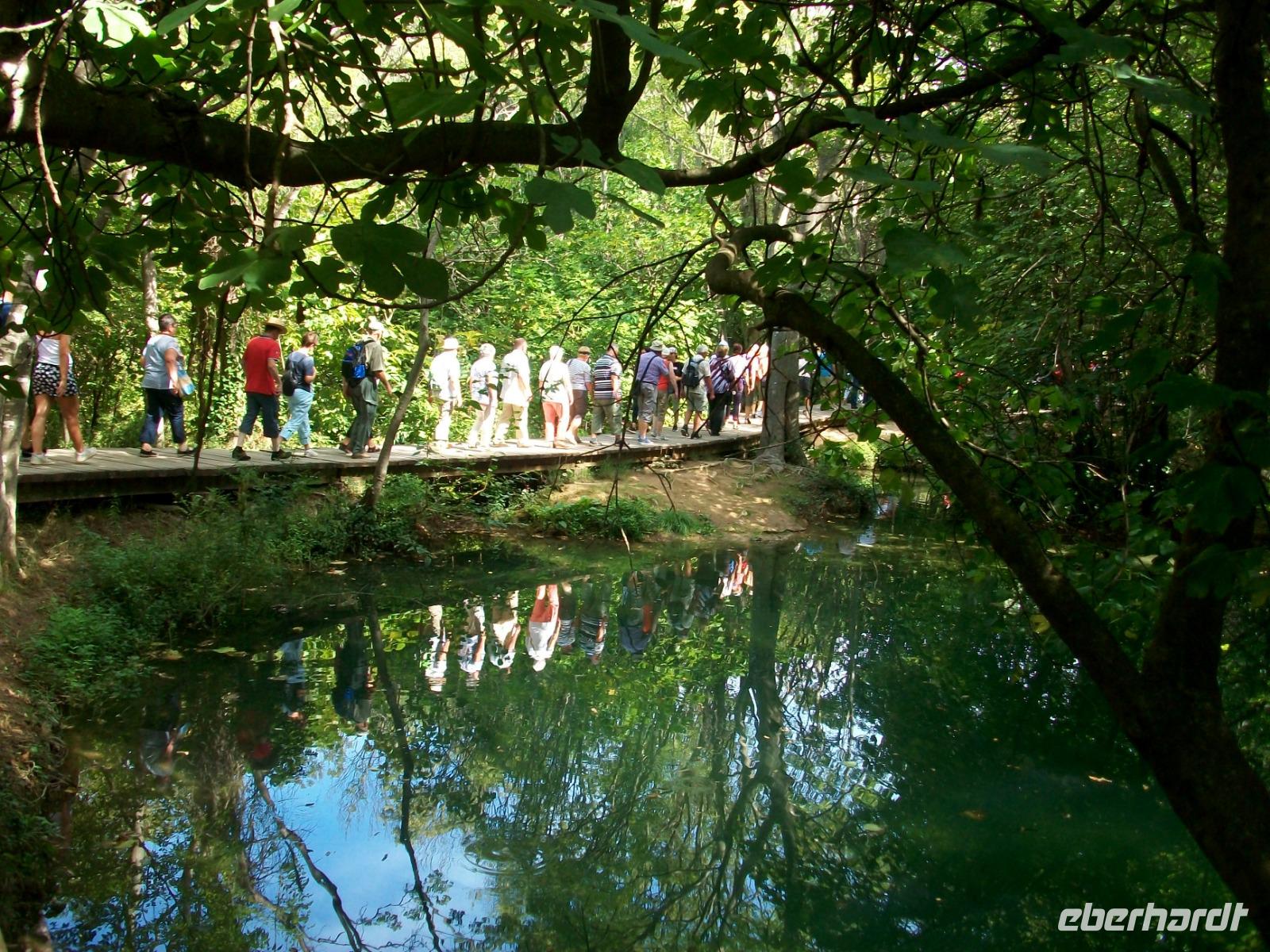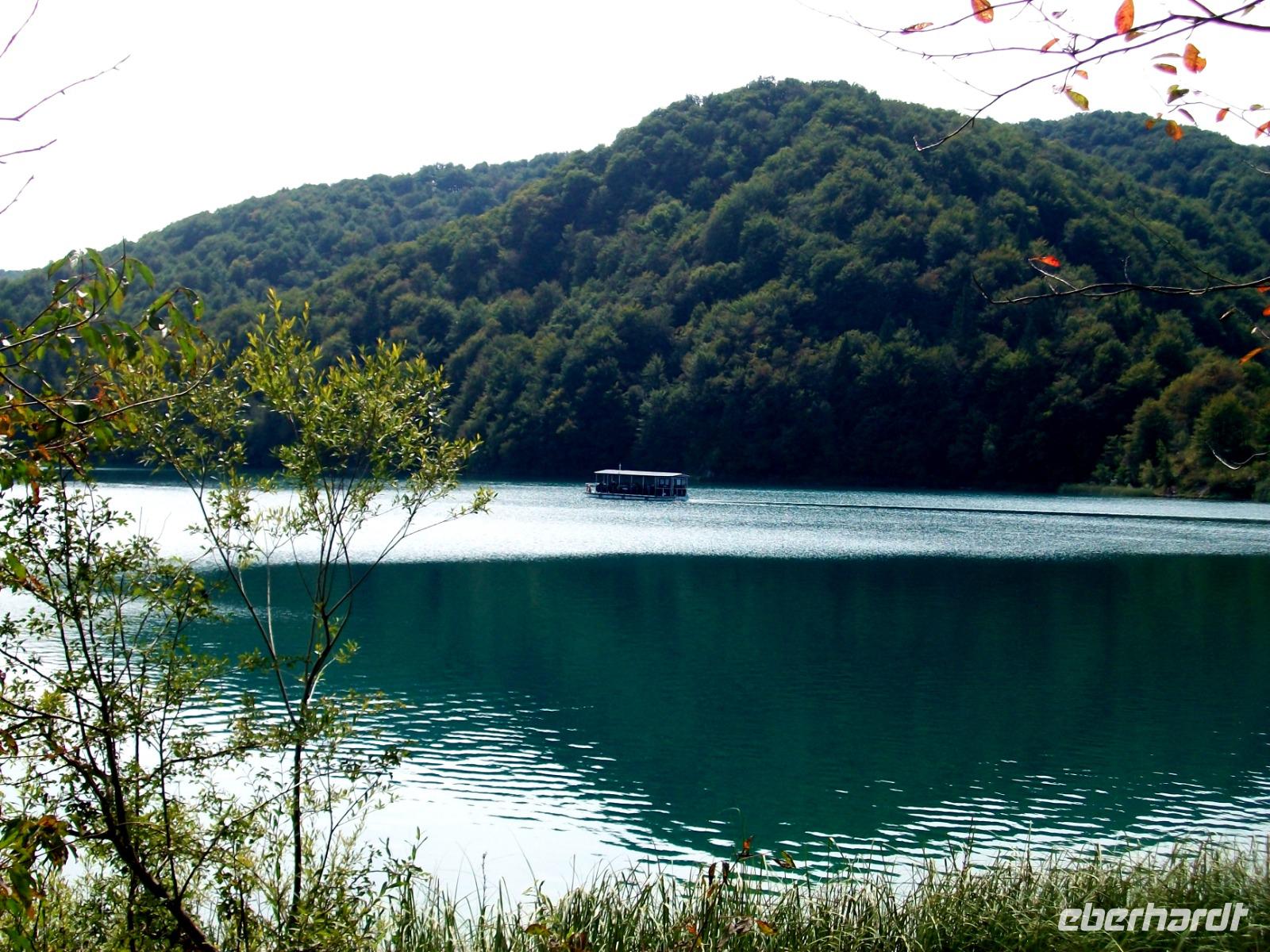 10.9.2018. Nach der quirligen Hauptstadt wollen wir uns an diesem Tag ein schönes Stück Natur anschauen. Mein erster Blick aus dem Fenster zeigt mir dass es auch heute schönes Wetter geben wird und somit starten wir gegen neun mit Vorfreude auf dieses besondere Ereignis. Unser Weg führt uns zunächst über die Autobahn die wir beim Ort Karlovac aber schon wieder verlassen. Dann geht es über Land und vom Bus aus sehen wir die dünnbesiedelte und dennoch faszinierende Gegend. Gegen Mittag treffen wir an unserem Ziel ein; hier gönnen wir uns zunächst einen kleinen Mittagsimbiss und dann geht es hinein in den Park. Schon von oben sehen wir den Großen Wasserfall und wir halten den Atem an welch ein gigantisches Schauspiel sich vor unseren Augen abspielt. Der Weg hinunter führt uns an den Fuß des Falles, auch hier ist er ein Ereignis. Beim Hinuntergehen sahen wir schon die türkisblaue Farbe der Seen, und als wir an den Ufern entlanggehen, erscheint uns diese Farbe fast unwirklich. Auf den verbindenden Knüppeldämmen kommen wir ganz nah an die Kaskaden heran; die Wege führen immer aufwärts bis wir den Koziaksee erreicht haben. Hier legen wir nun ungewollt eine Pause ein denn wir müssen auf das Schiff warten welches uns hinüber zum anderen Ufer bringen wird. Als wir es schließlich betreten können wird die Überfahrt zum Genuss, langsam gleiten die Ufer am Boot vorbei.