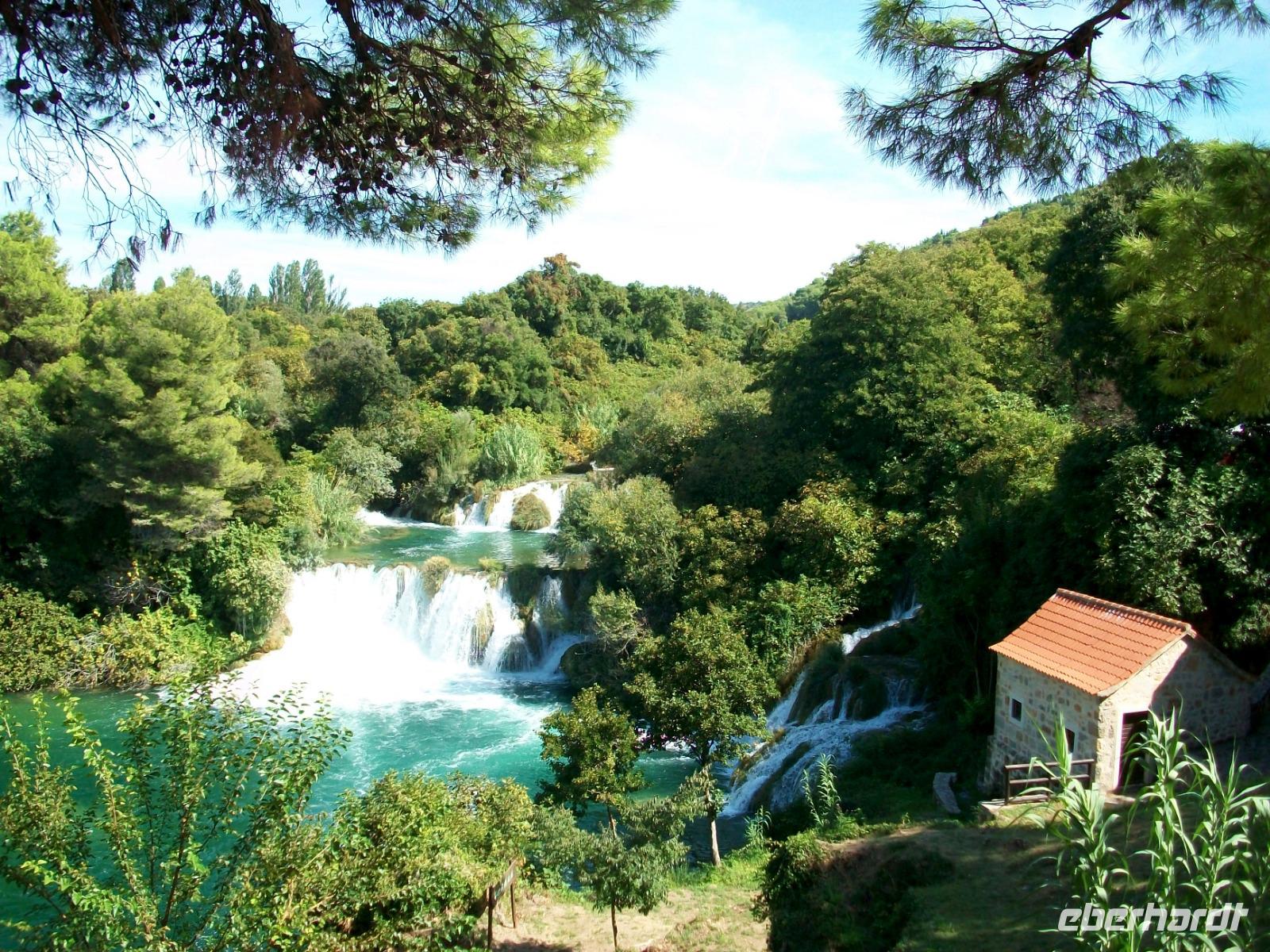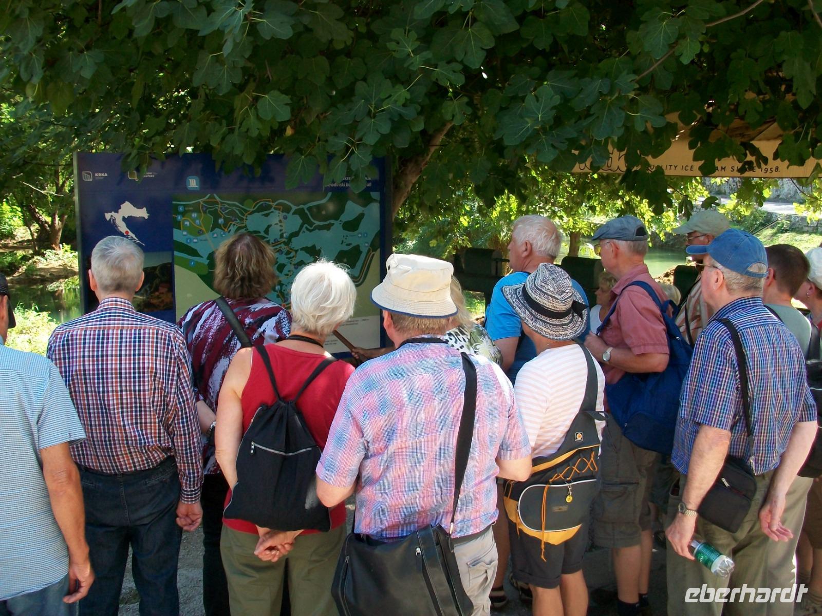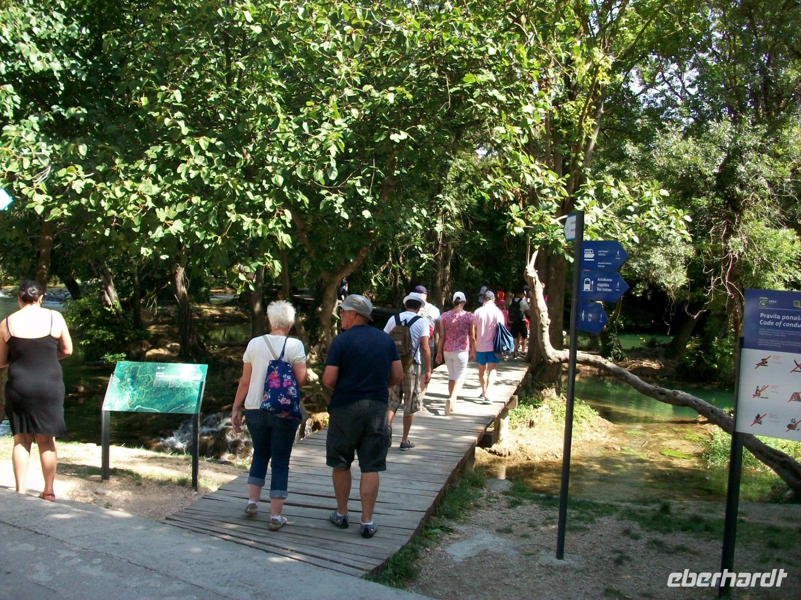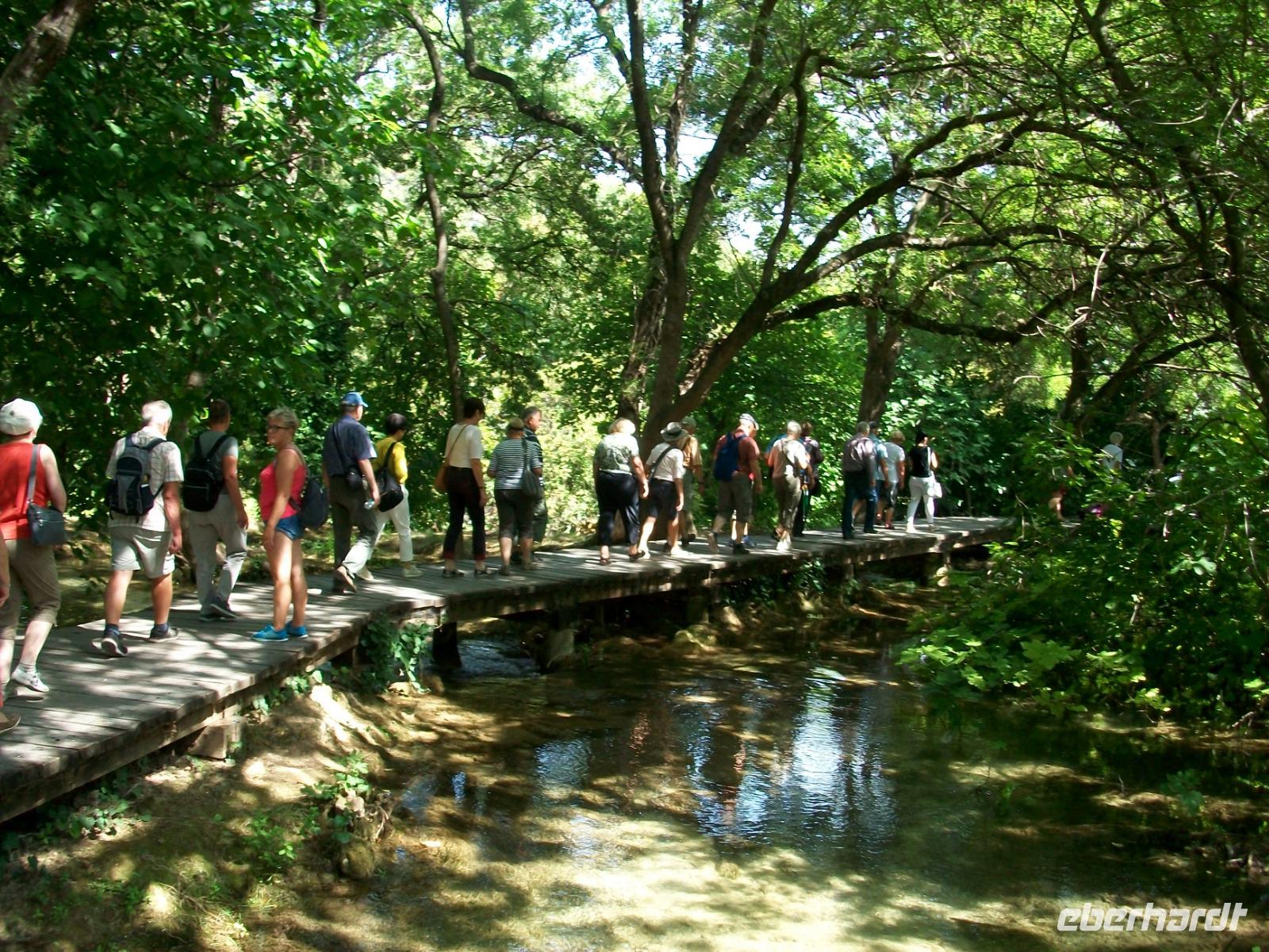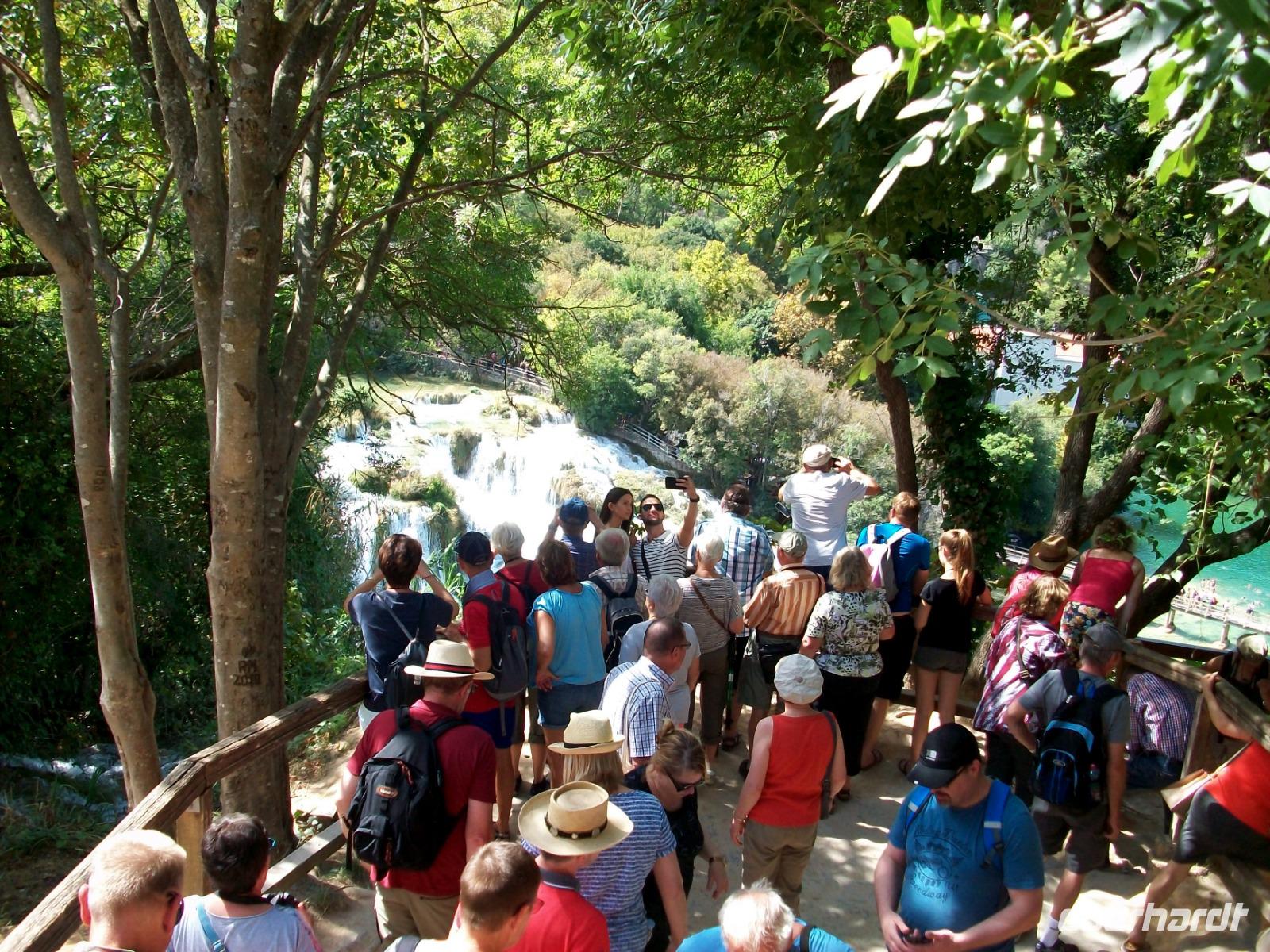 11.9.2018. Heute starten wir etwas früher, unser Weg führt uns an diesem Tag hinunter an die Adria, doch vorher möchten wir uns einen weiteren schönen Nationalpark anschauen. Wir gelangen zunächst durch das Gebiet der Lika; es ist das dünnbesiedelte Hinterland welches durchaus seinen Reiz hat. Entlang des Flusses Zrmanja kommen wir dem Meer immer näher das bald auf der rechten Seite zu sehen ist. Ein Stückchen Autobahn bringt uns dann in die Nähe von Šibenik und von hier schwenken wir links ab in Richtung des Flusses Krka. Hier wartet schon Marica, sie wird uns in den nächsten guten zwei Stunden eine phantastische Natur zeigen. Der Fluss hat sich hier im Karst sein Bett gegraben, seinen Verlauf nimmt die Krka über zahlreiche Terrassen, mehrere Wasserfälle bildend. Der größte und schönste ist der Skradinski Buk, ihn werden wir nun umrunden. Aus allen Ecken strömt uns das Wasser entgegen, es rauscht und gurgelt so dass wir wie gebannt dieses Naturwunder betrachten.