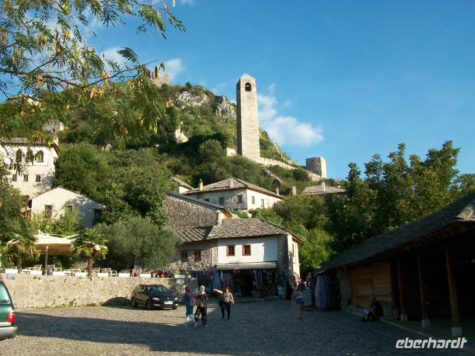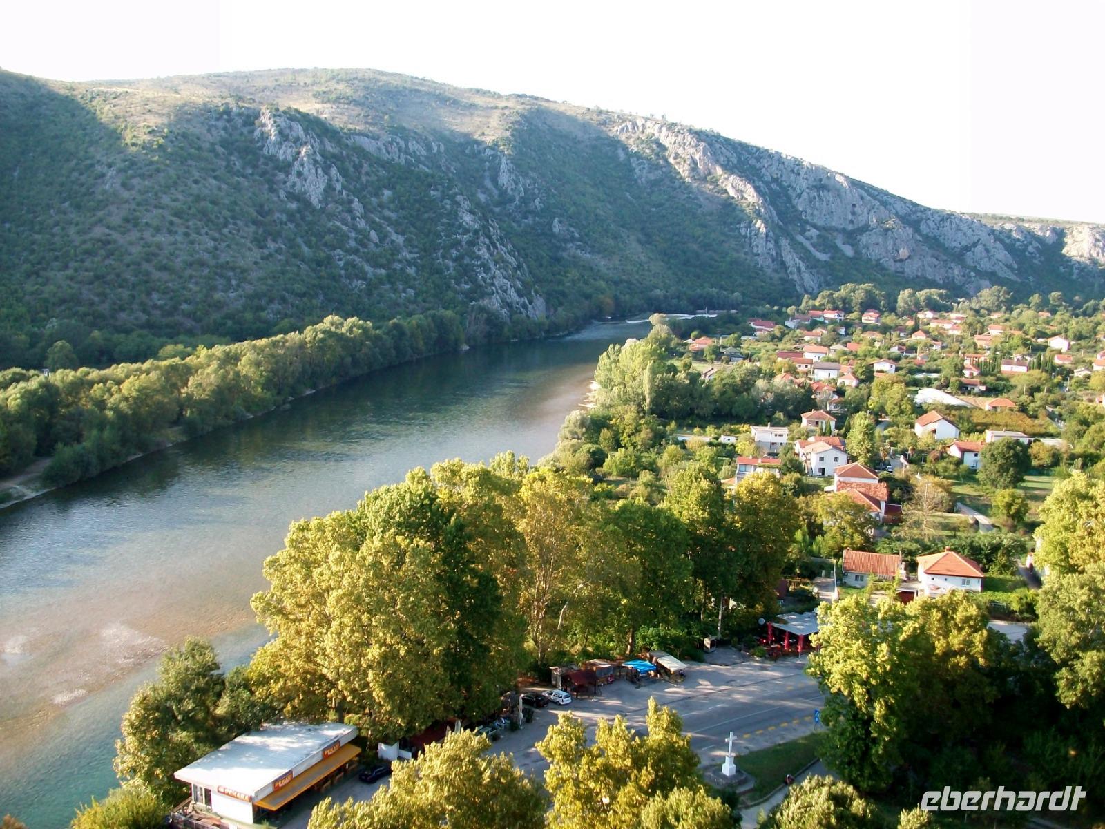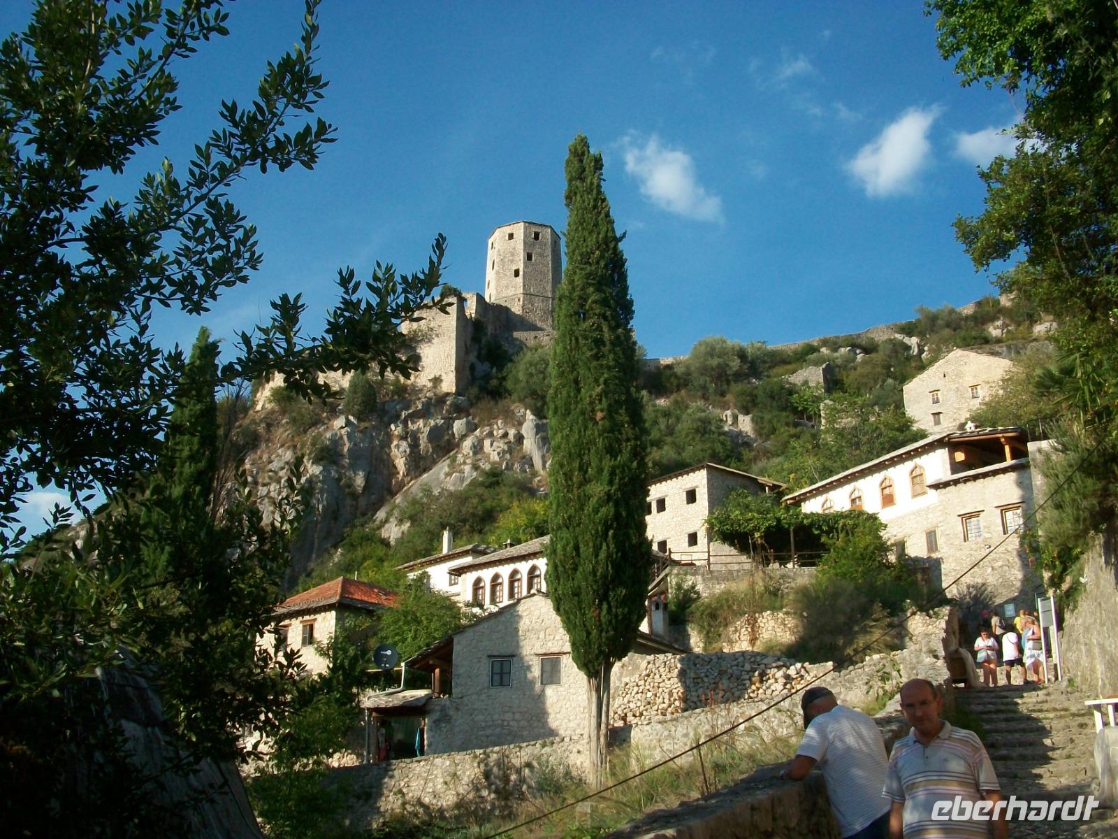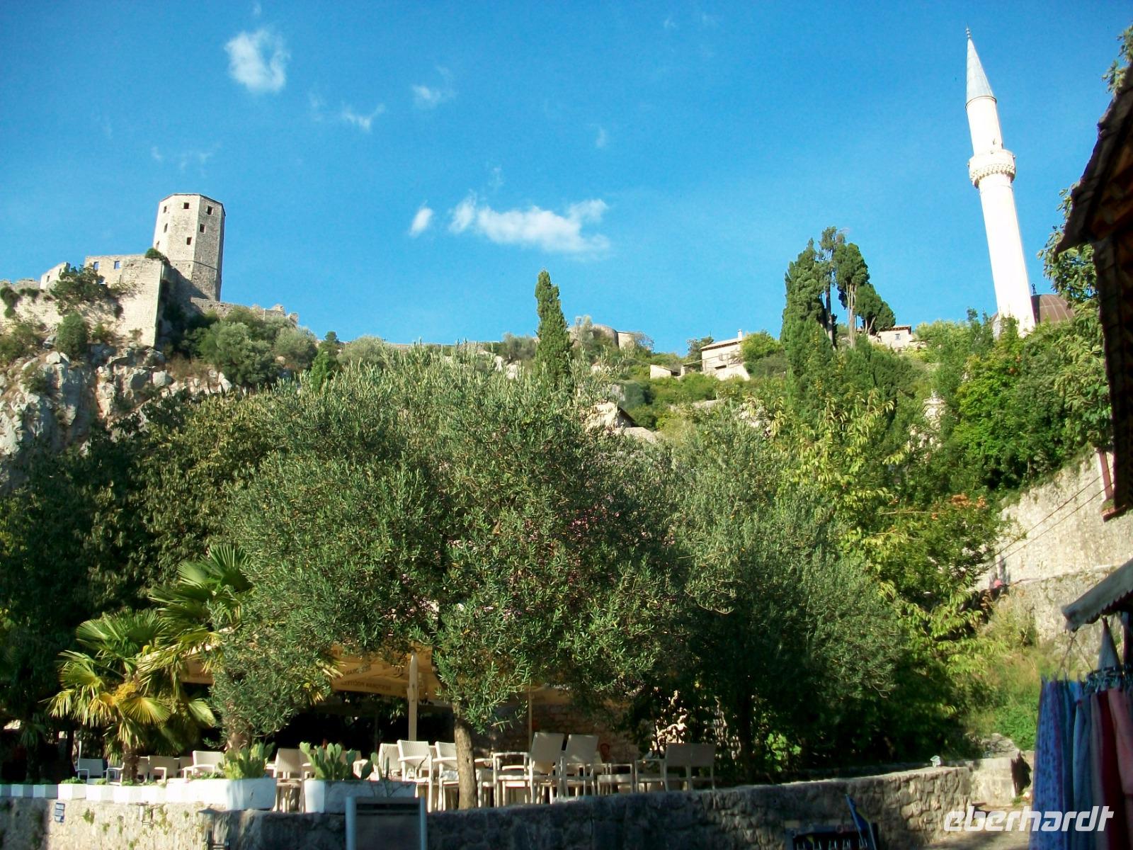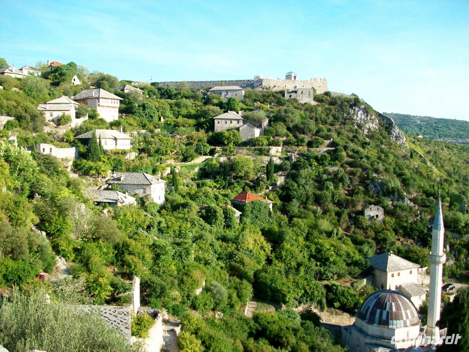 Nach dem Grenzübertritt gelangen wir bald an die Neretva und von Fern sehen wir schon osmanische Architektur auf unserem Weg: es ist der Ort Pocitelj. Die Nachmittagssonne bescheint dabei eine wirklich reizende Szenerie. Beim Spaziergang hinauf zur Festung breitet sich ein wunderschönes Panorama vor unseren Augen aus; tief unten schlängelt sich der Fluss durchs Tal, beiderseits sind die türkischen Häuser zu sehen und in der Mitte thront das spitze Minarett der Moschee. Hier sind wir nun im Morgenland angelangt; die osmanische Herrschaft drückte dieser Gegend ihren Stempel auf und das macht den Besuch der Herzegowina so reizvoll.