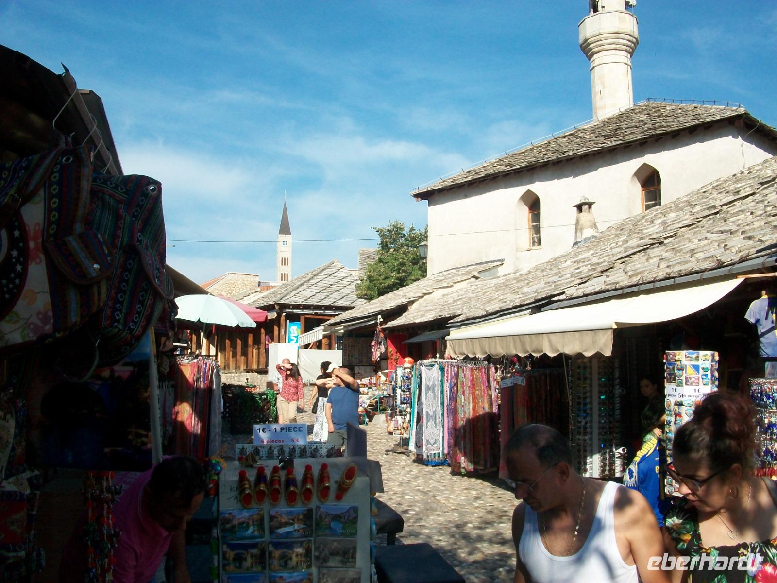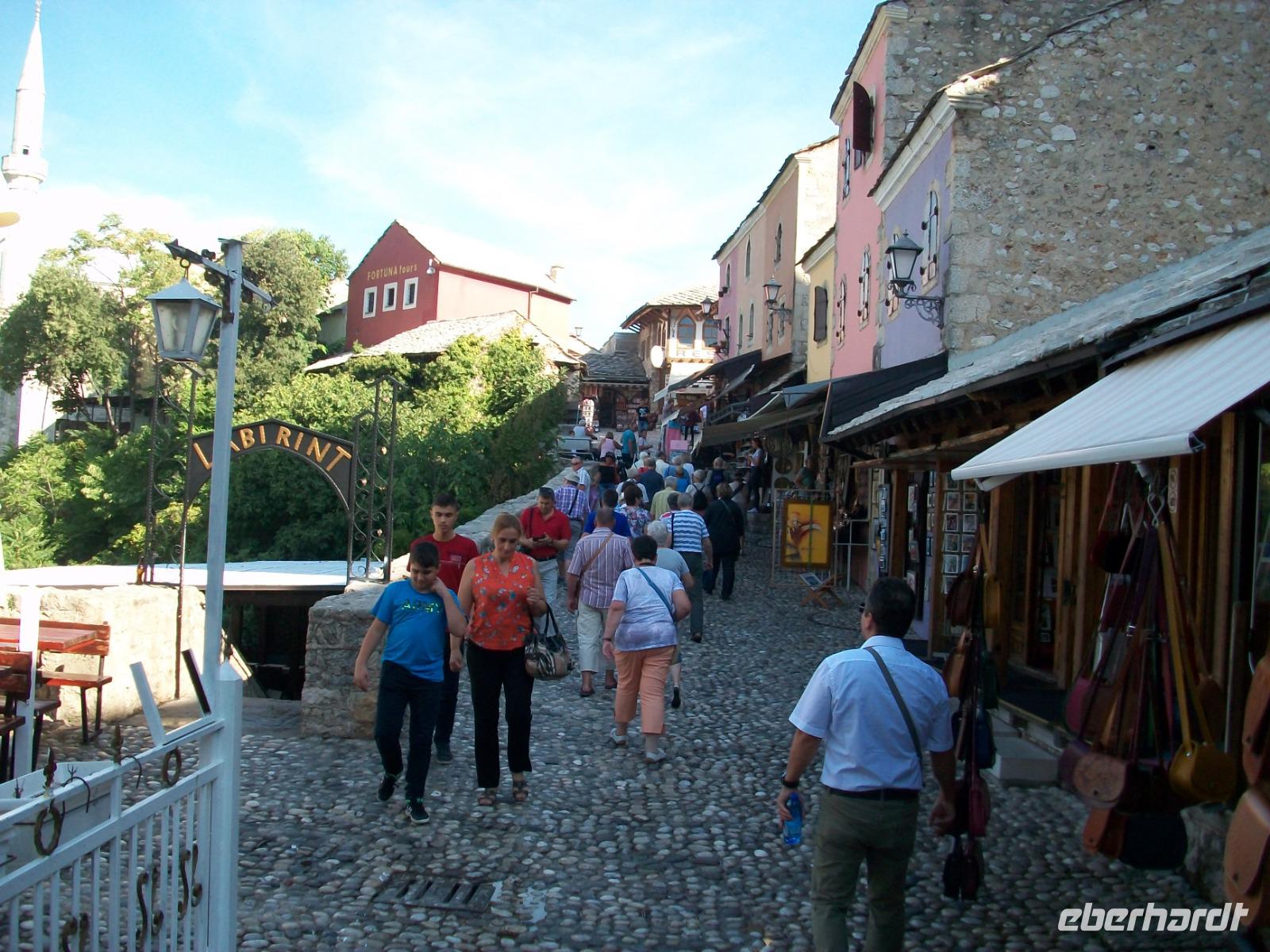 13.9.2018. Die Sonne steigt hinter den östlichen Bergen auf und nachdem wir uns am Buffet gestärkt haben, beginnt unsere Reise in das Morgenland. Mit uns ist Amila, sie wird uns an diesem Vormittag begleiten. Ein kurzes Stück mit dem Bus und wir haben die Altstadt von Mostar erreicht, es ist das erste Ziel dieses Tages. Über das türkische Pflaster gelangen wir zu einer Moschee, hier erfahren wir einiges über den Islam in Bosnien. Dann führt uns der Weg schon zur Hauptattraktion von Mostar, der Alten Brücke. Etwas beschwerlich ist der Fußweg hinüber, unter uns die grüne Neretva, vor uns die osmanische Architektur, einfach zauberhaft. Vom gegenüberliegenden Ufer aus genießen wir den schönen Blick auf die Brücke und hier genehmigen wir uns an diesem sonnigen Vormittag noch etwas Freizeit.