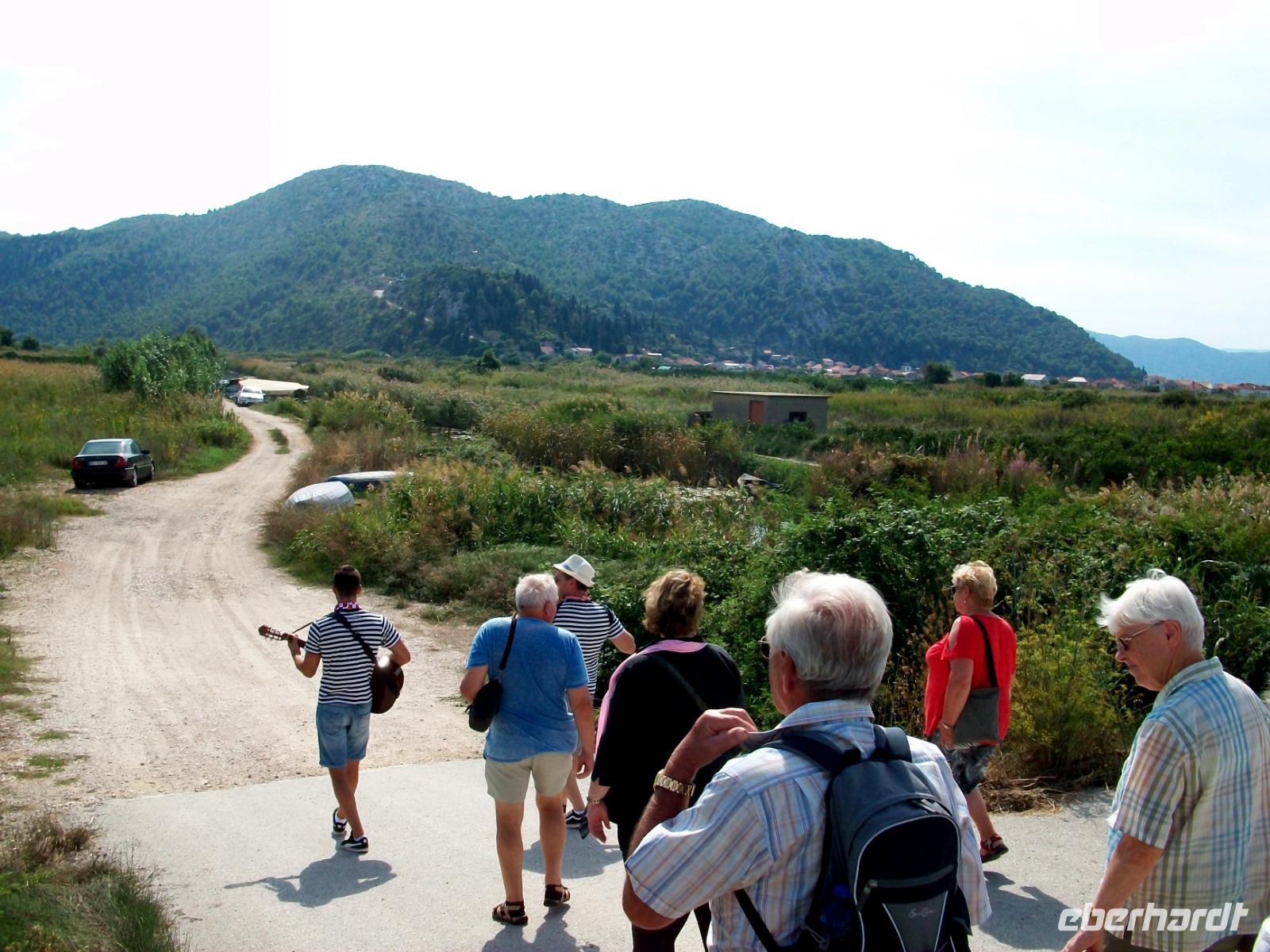 Doch gegen elf müssen wir aufbrechen; wir gelangen entlang der Neretva zur kroatischen Grenze und dann zur Villa Neretva, hier sind wir zunächst zum Mittagessen eingeladen. Danach beginnt eine schöne Bootsfahrt auf den Kanälen des Flusses; wir sehen die reifenden Mandarinen und so manch fleißige Hand in diesem fruchtbaren Flussdelta. Hier scheint die Natur noch intakt zu sein, aber leider vergeht auch hier die schöne Zeit viel zu schnell.