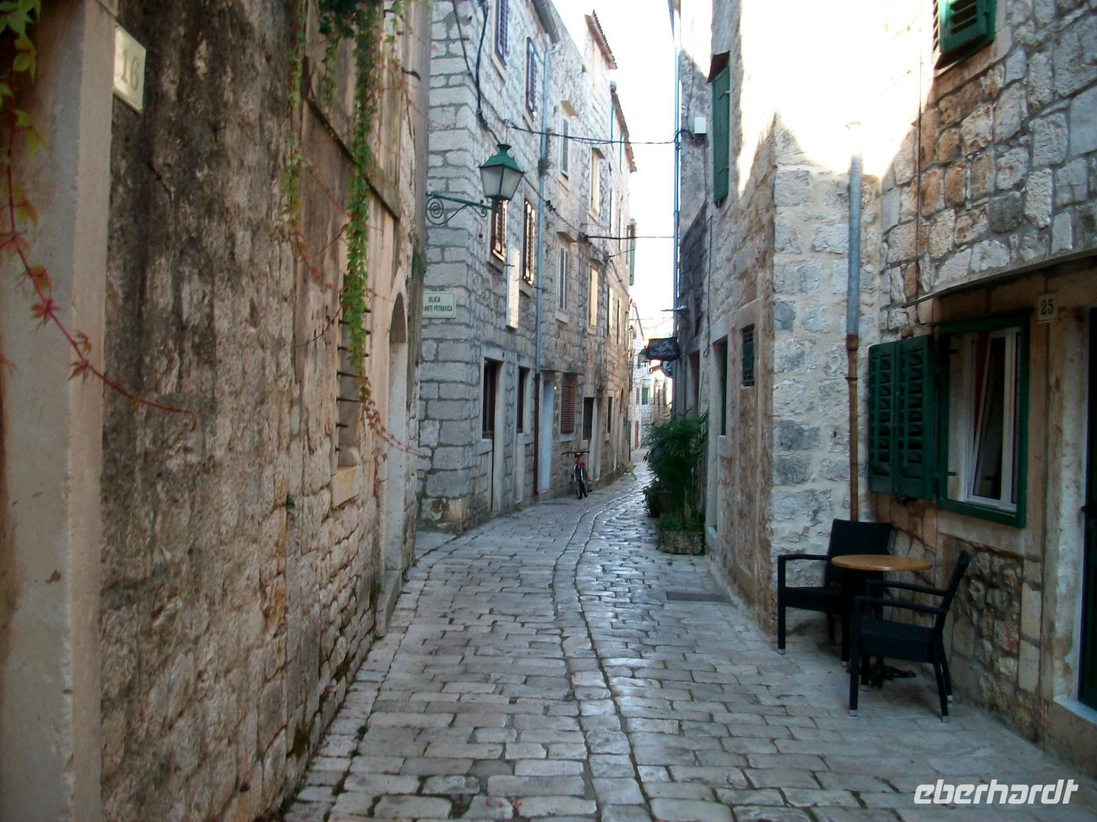 17.9.2018. Diese Reise bringt uns so ziemlich alle UNESCO - Welterbestätten Kroatiens näher. Heute stehen noch einmal zwei davon auf dem Programm. Am Vormittag gelangen wir auf die andere Seite der Insel. Gleich nach dem Tunnel weitet sich der Blick zur langstreckten Bucht an deren Ende der Ort Starigrad liegt. Teile der Altstadt und das dahinterliegende Feld tragen den Welterbestatus und bald tauchen wir zu einem kleinen Bummel in die einsamen Gassen dieses besonderen Ortes ein den die alten Griechen einst Pharos nannten.