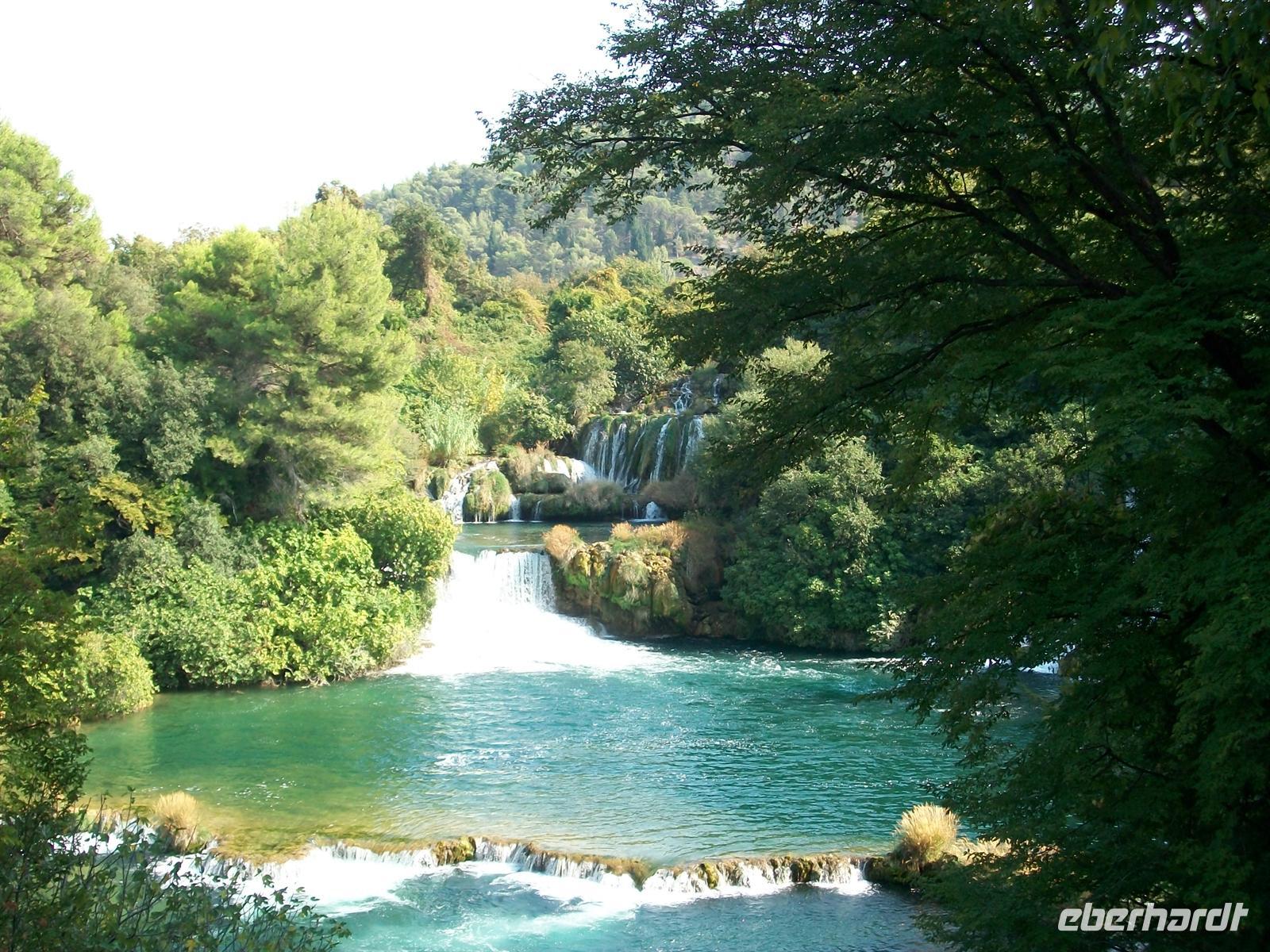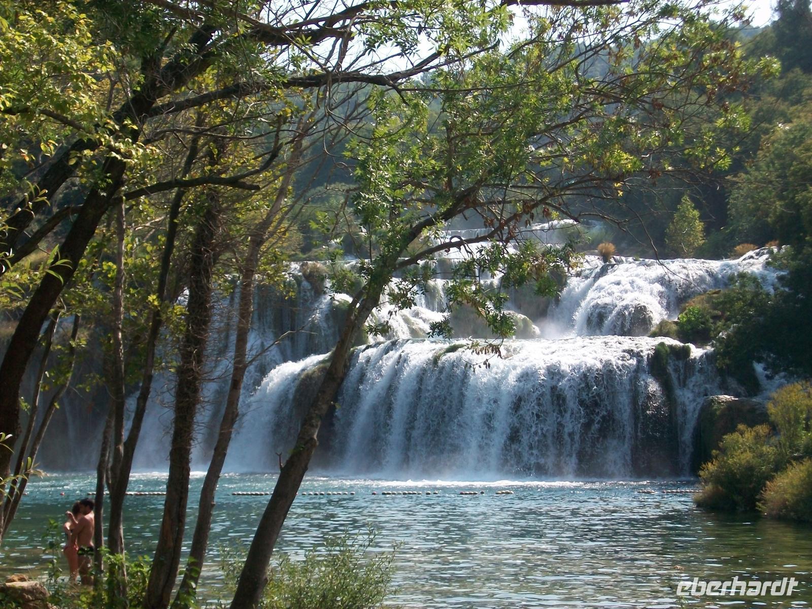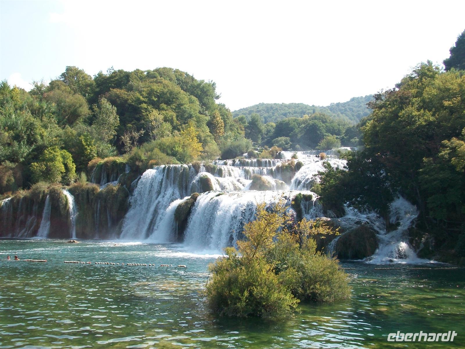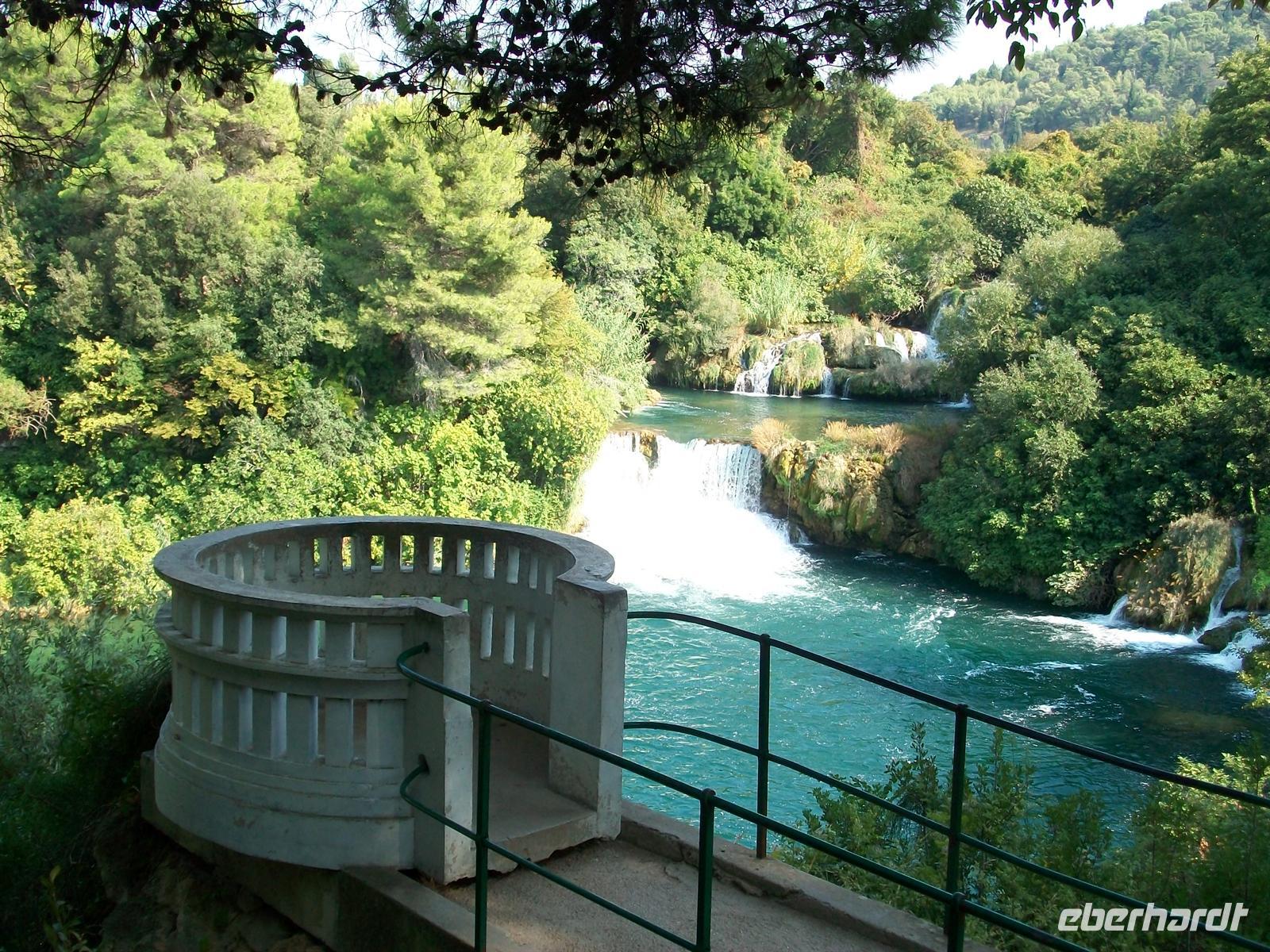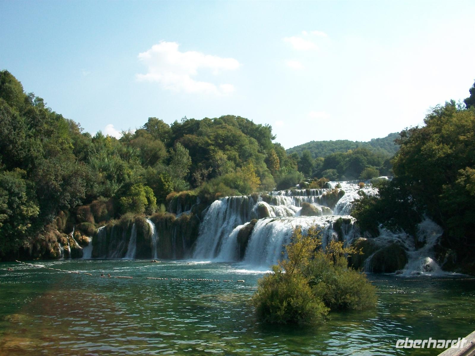Serpentinenstraße die uns schon grandiose Einblicke auf den Park gewährt fahren wir hinunter um unseren Rundgang zu beginnen. Wir werden uns die nächste Stunde den Skradinski Buk anschauen, es ist der spektakulärste Wasserfall im Park. Zuerst sehen wir die zahlreichen Kaskaden von oben, dann gehen wir hinunter zur Brücke, hier kommen uns die Wassermassen direkt entgegen. Das schöne und sonnige Wetter begleitet uns beim Rundgang über Wanderwege und Knüppeldämme, wir sind immer mittendrin im rauschenden Element. Am Ende der Runde kommen wir an den wissenswerten ethnologischen Ausstellungen vorbei, hier haben unsere Reisegäste noch etwa eine Stunde Zeit für eigene Erkundungen, so mancher Schnappschuss von den Aussichtspunkten verschönt die Fotosammlung.