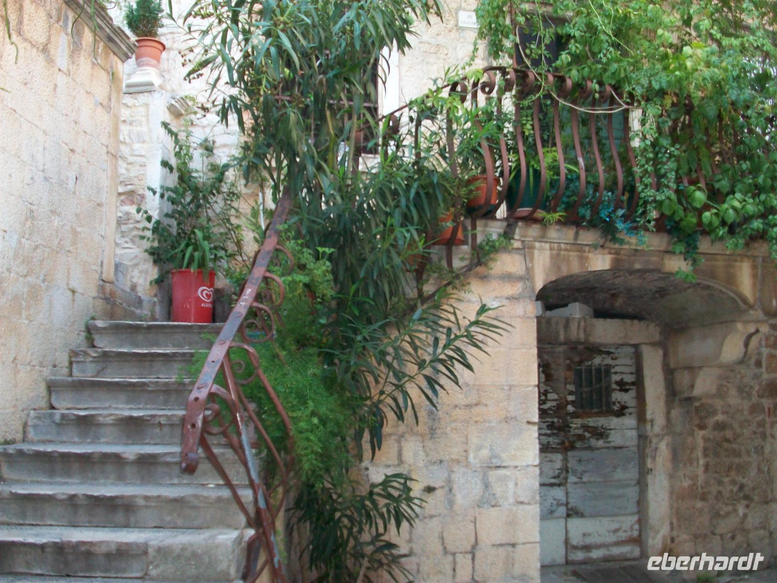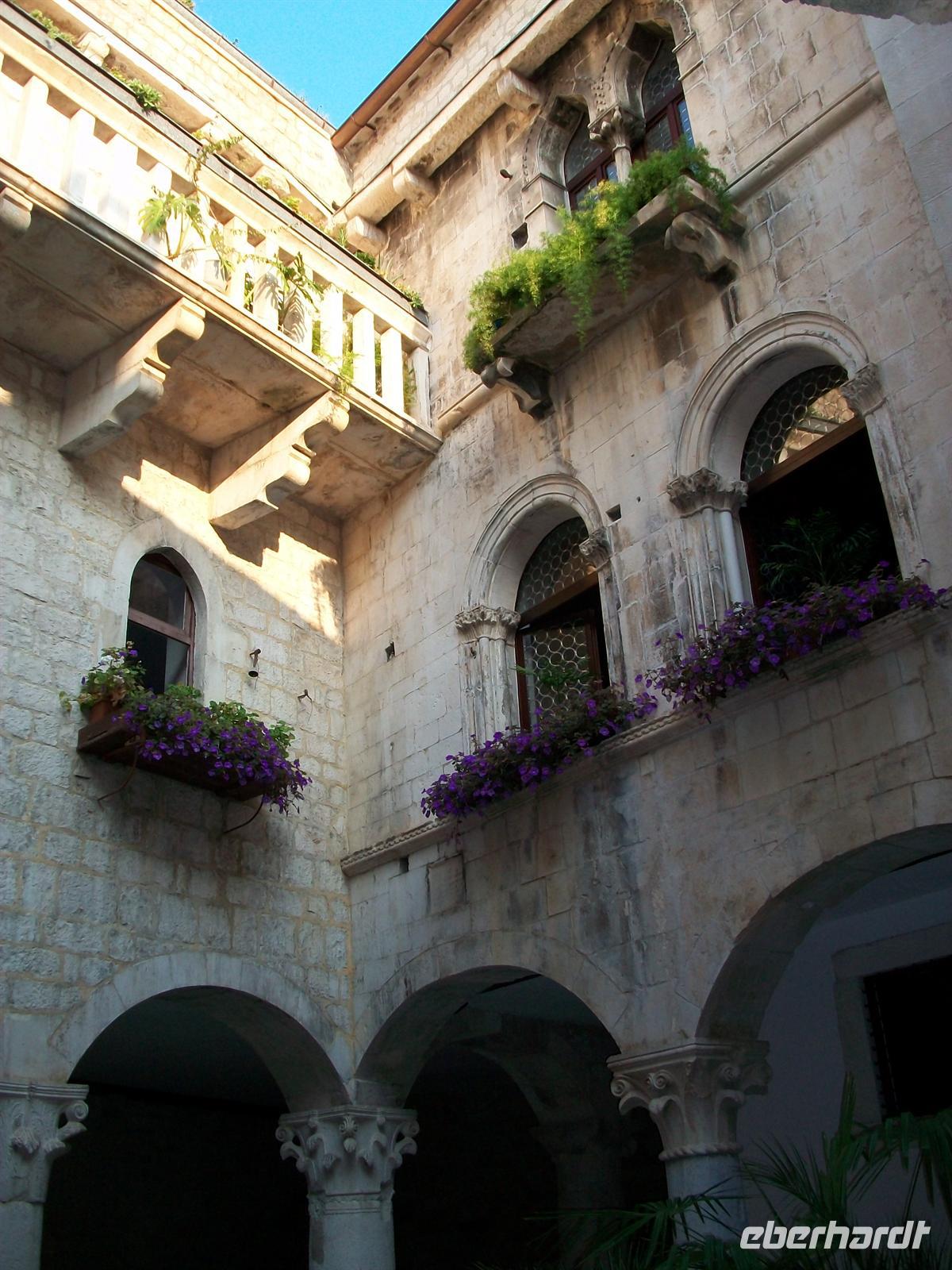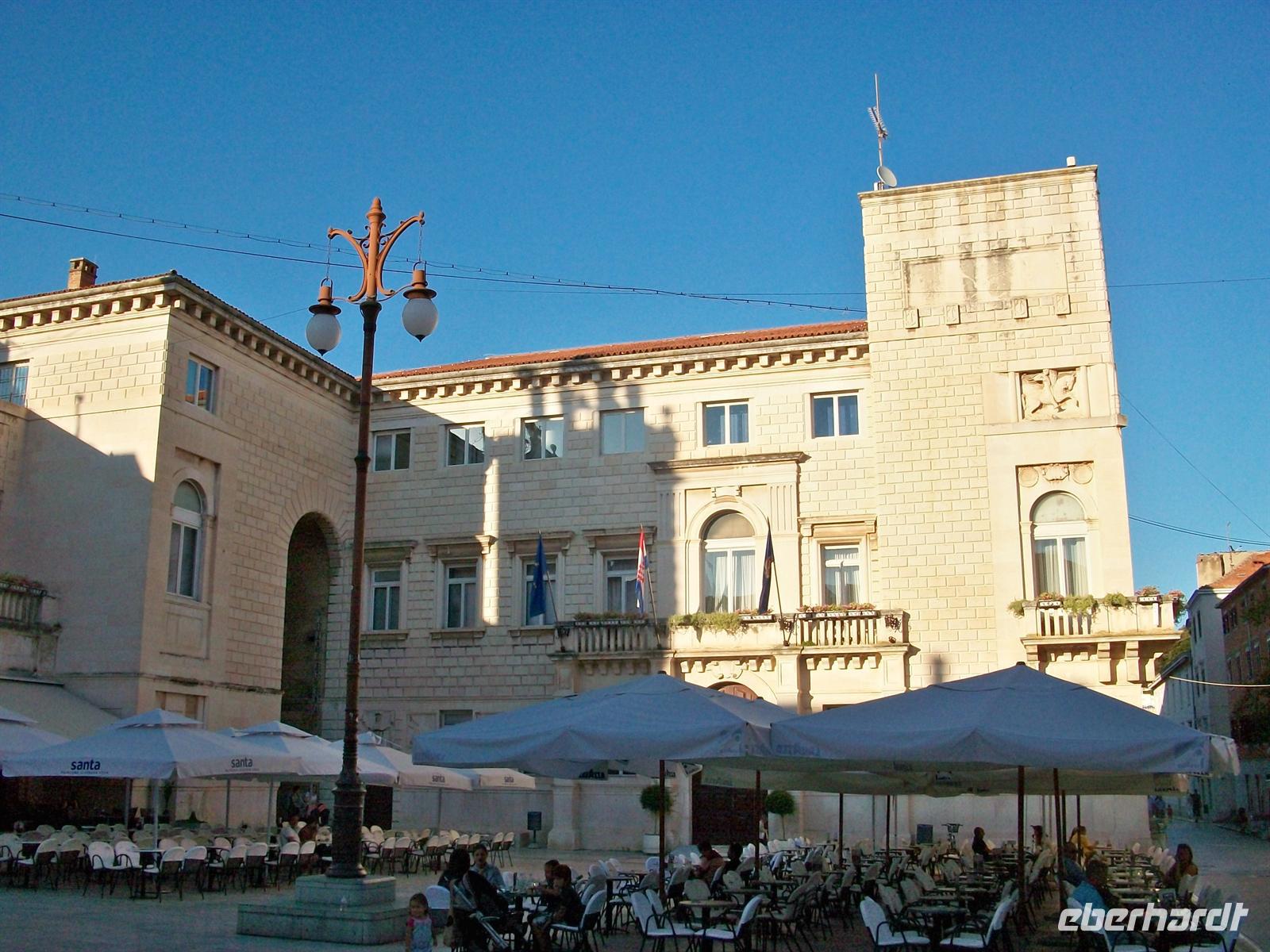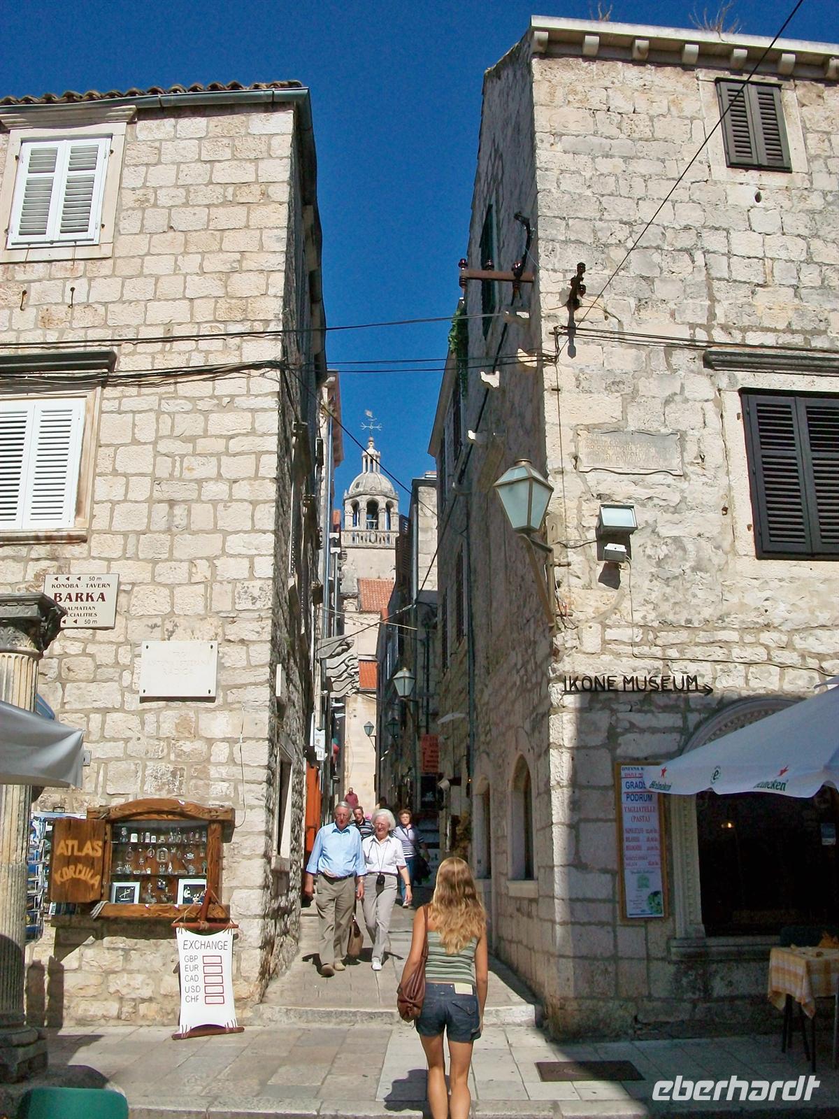 untergegangen ist. Die Häuser sind aus weißem Kalkstein erbaut, ein typisches Bild aller Orte hier an der Küste. Hier wandeln wir nun durch sehr schmale Gassen, sehen die Kathedrale mit dem schönen Skulpturenschmuck von Meister Radovan, bestaunen die Stadtpaläste und die gepflegten Innenhöfe. Die Cafes an der Strandpromenade laden zum Einkehren ein und so vergeht die Zeit in diesem schönen Ort.