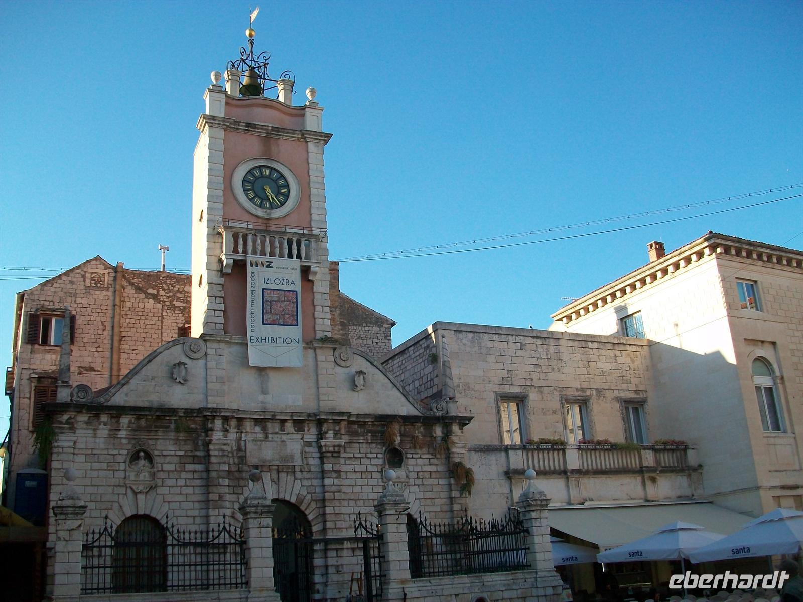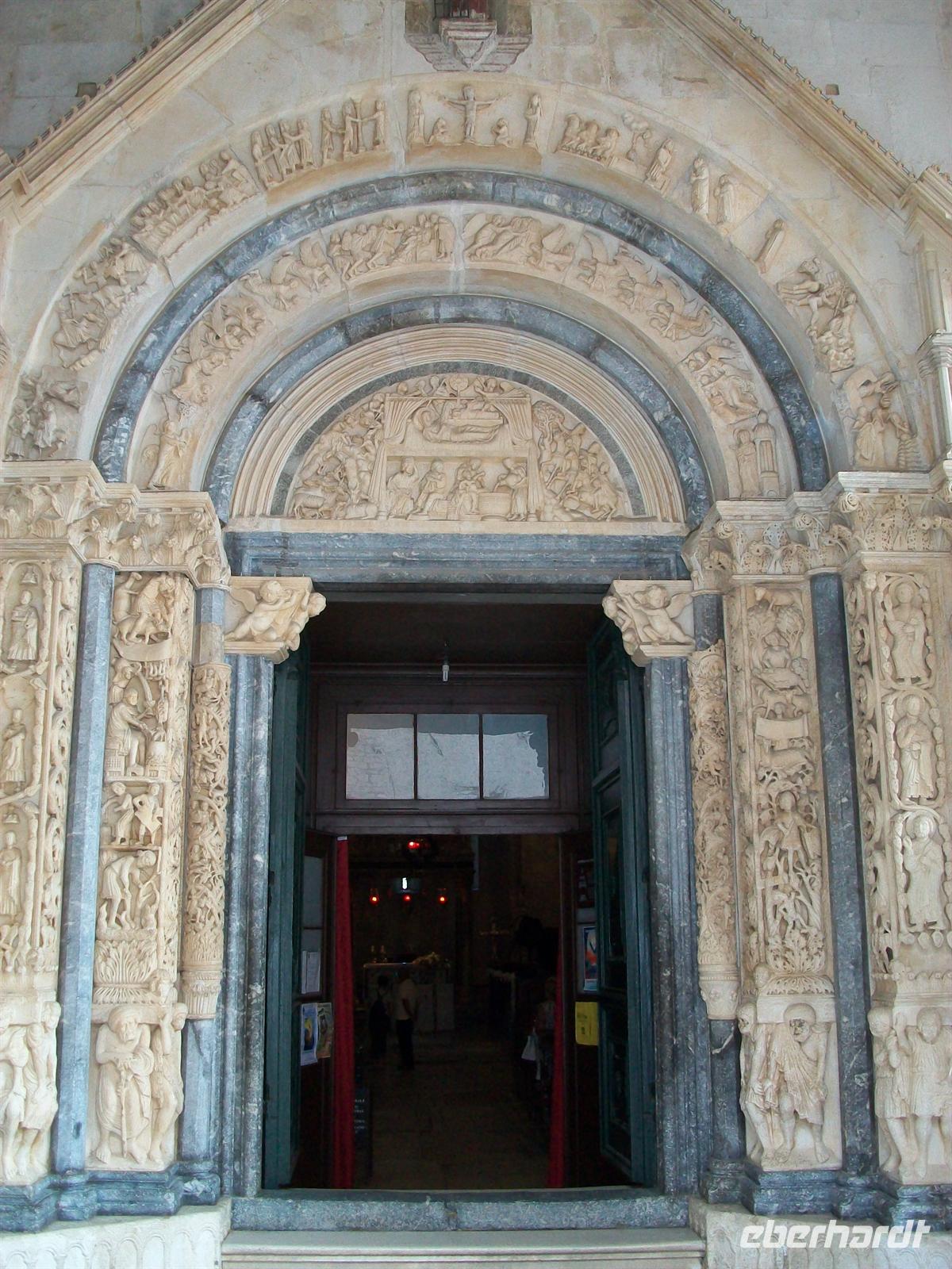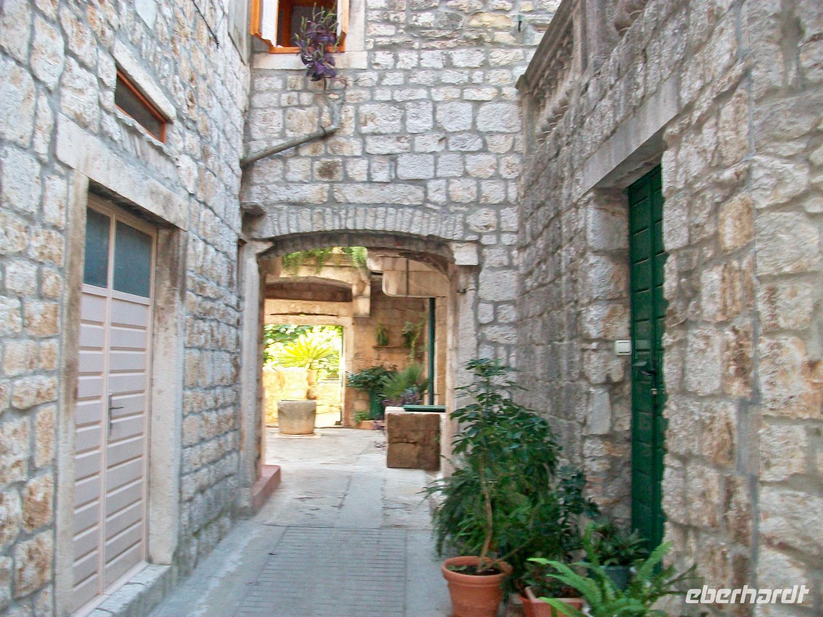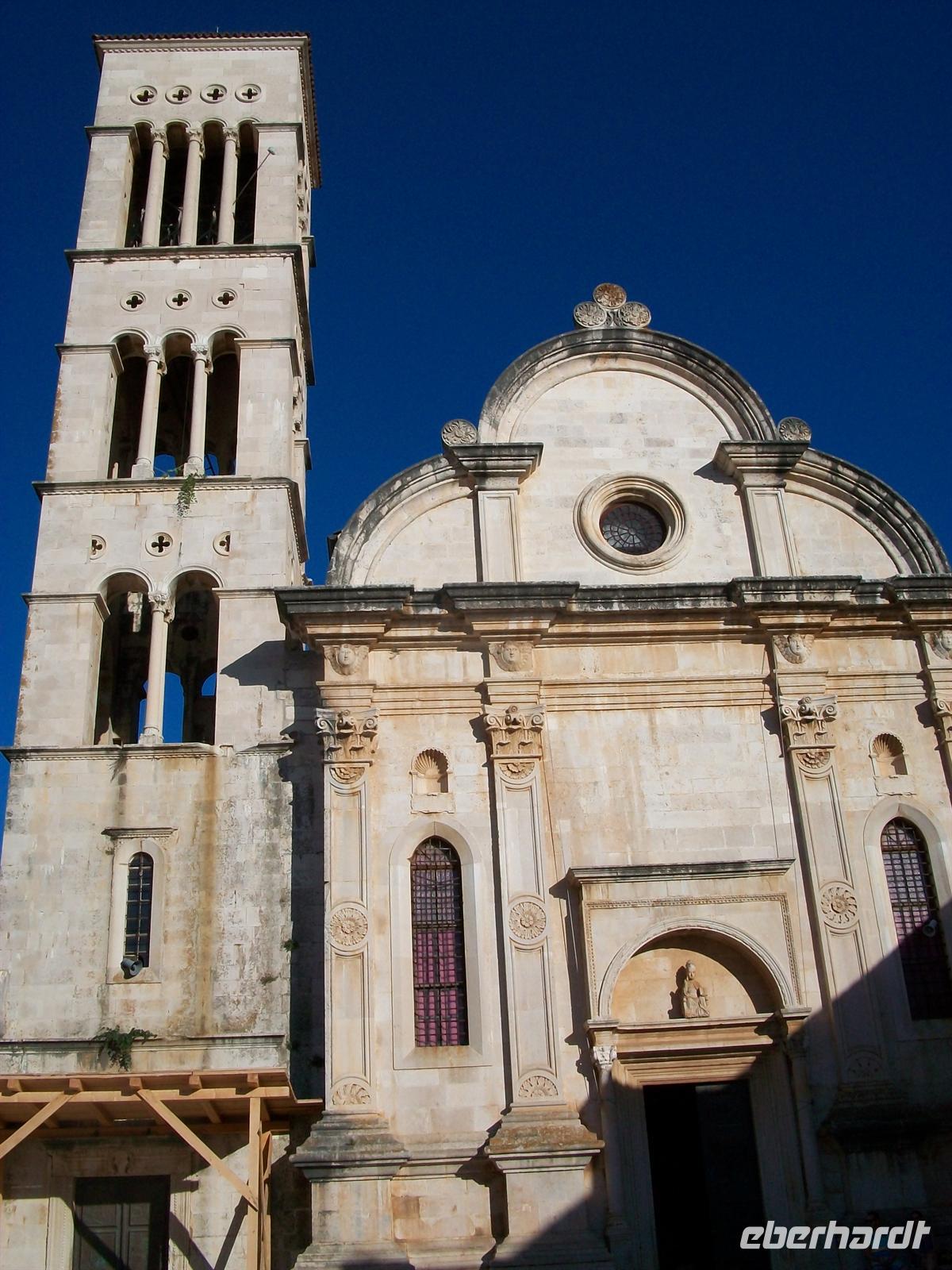 untergegangen ist. Die Häuser sind aus weißem Kalkstein erbaut, ein typisches Bild aller Orte hier an der Küste. Hier wandeln wir nun durch sehr schmale Gassen, sehen die Kathedrale mit dem schönen Skulpturenschmuck von Meister Radovan, bestaunen die Stadtpaläste und die gepflegten Innenhöfe. Die Cafes an der Strandpromenade laden zum Einkehren ein und so vergeht die Zeit in diesem schönen Ort.