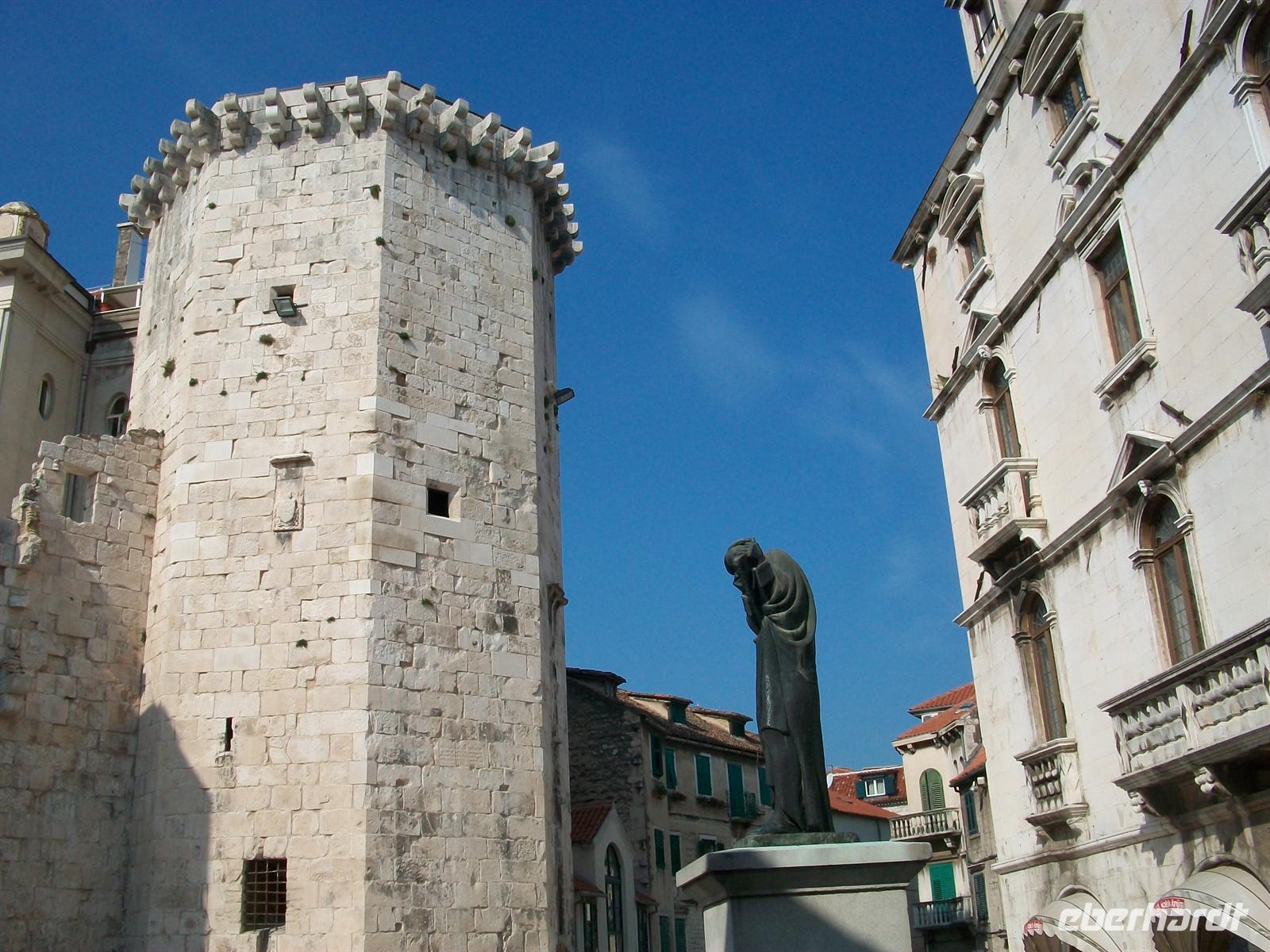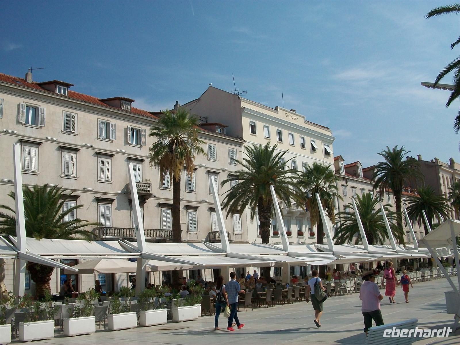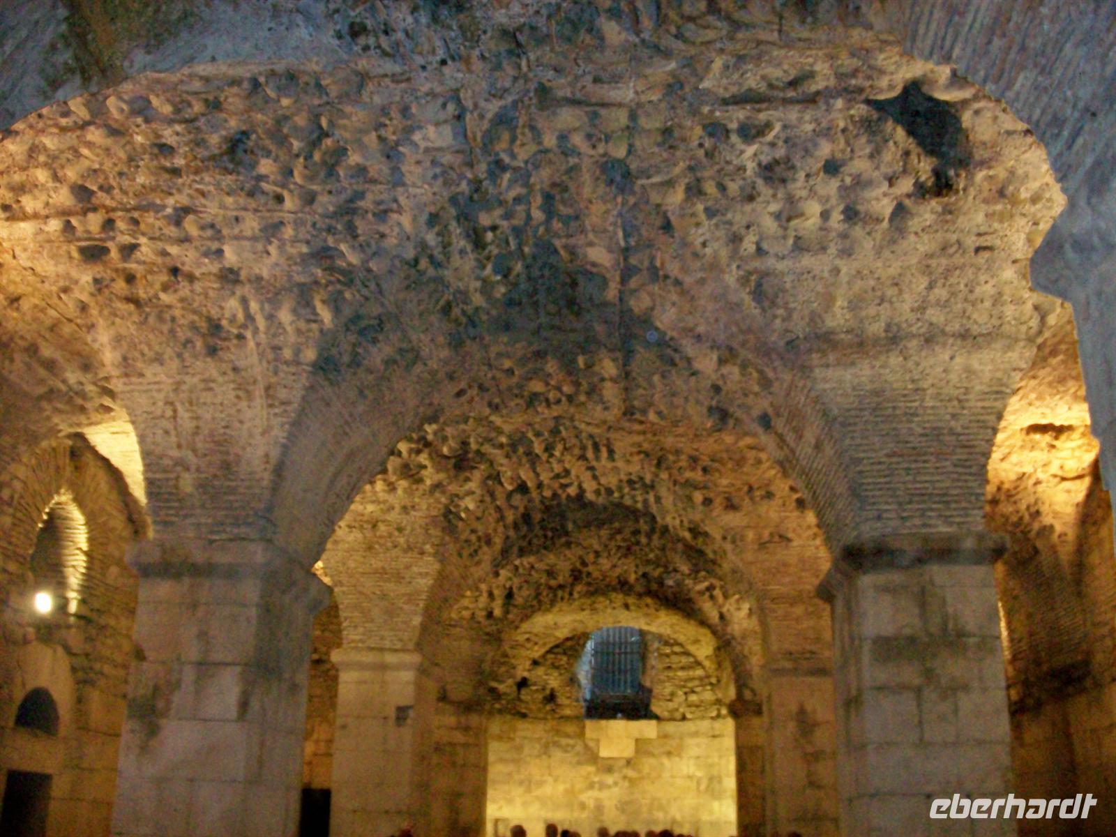 Wir starten um neun vom Hotel, unser Stadtführer hat uns von hier abgeholt und geleitet uns nun zur Riva unter Palmen, so heißt die Strandpromenade von Split. Hier beginnt die Führung und wir schauen von diesem Standort direkt auf die Südfassade des Palastes den der Römische Kaiser Diokletian im 4. Jahrhundert errichtete. Unsrer Stadtführer Josip wir uns die nächsten 90 Minuten auf eine interessante Zeitreise mitnehmen. Wir beginnen in den Kellerräumen die uns am besten etwas über die Bauweise des Palastes sagen können. Denn die oberen Teile wurden zum Teil abgebrochen und aus den gewonnenen Steinen entstand die mittelalterliche Stadt. Diese eigenartige Symbiose sehen wir dann auf unserem Spaziergang durch die Altstadt. Wir schauen an der Kathedrale