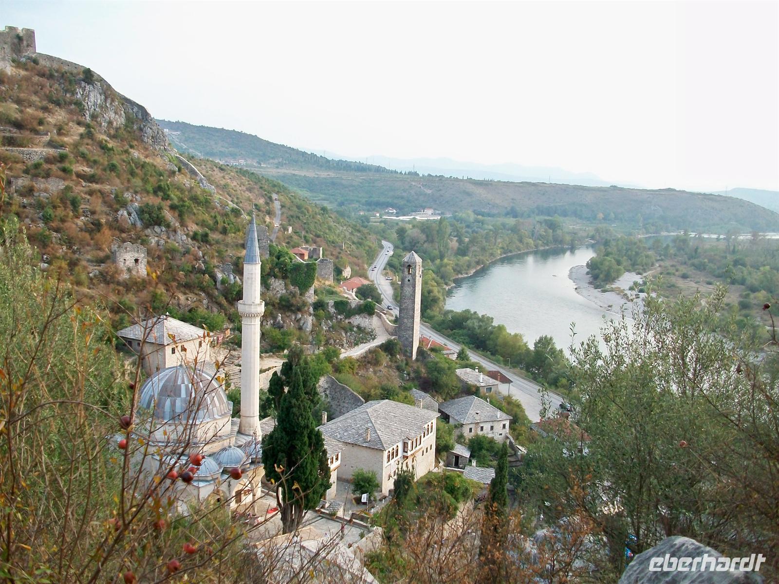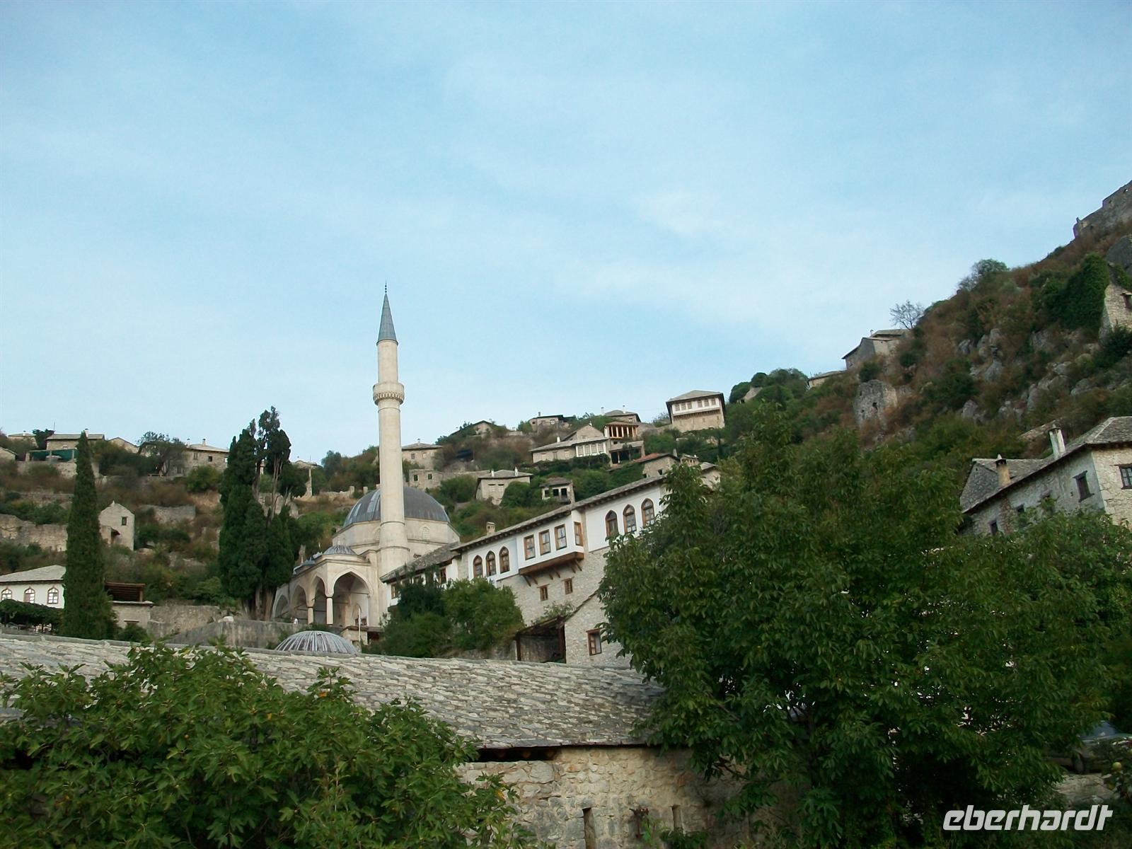 Die weitere Fahrt führt direkt an der Uferstraße entlang, wir sehen die Makarska Riviera, links das Biokovo- Gebirge rechts die Adria mit den Inseln und haben bald das mächtige Mündungsdelta des Flusses Neretva erreicht. Hier verlassen wir das Meer und sind in Richtung des Landesinneren unterwegs. Bald haben wir die Grenze zu Bosnien erreicht, die Formalitäten gehen schnell und unbürokratisch und nun sind wir in der Herzegowina unterwegs. Hier leben viele bosnische Moslems; einige Moscheen an denen wir vorbeifahren zeugen von der jahrhundertelangen Herrschaft der Osmanen. Ein typisches Beispiel dafür ist der Ort Poitelj den wir jetzt besuchen werden. Er wurde direkt an den Hang gebaut und wurde im echt türkischen Stil errichtet. Alle Gebäude sind noch erhalten: der Han, die Medresse (islamische Schule), Wohnhäuser aus dieser Zeit und natürlich die Moschee die auch besucht werden kann.