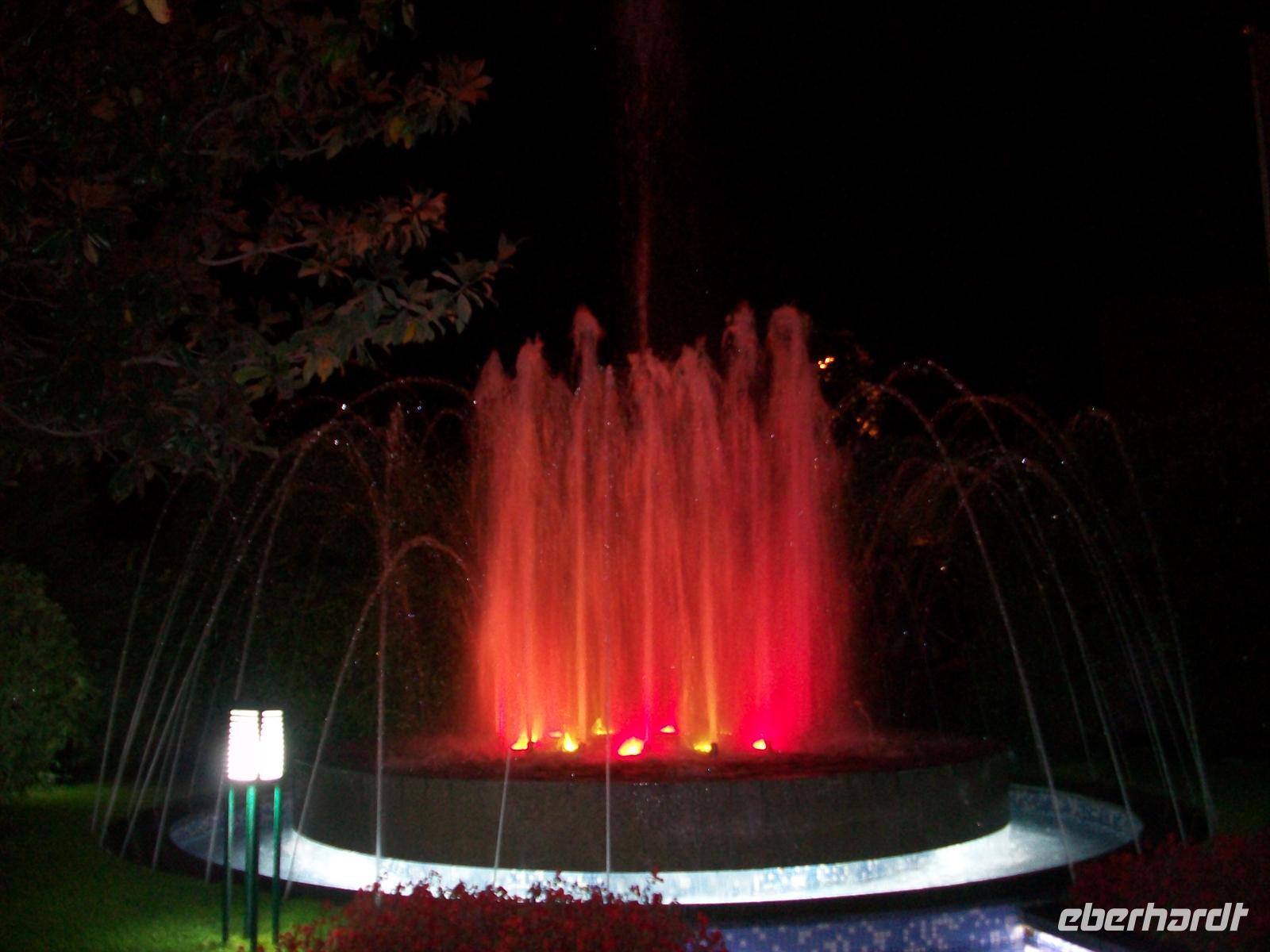 Das Abendessen bekommen wir heute in einem besonders schönen Ambiente im Garten des Hotels. An diesem Abend ist die Luft sehr lau, wir sitzen inmitten des vielen Grüns, dazu rauscht der Springbrunnen der in verschiedenen Farben erstrahlt- es ist wunderbar.