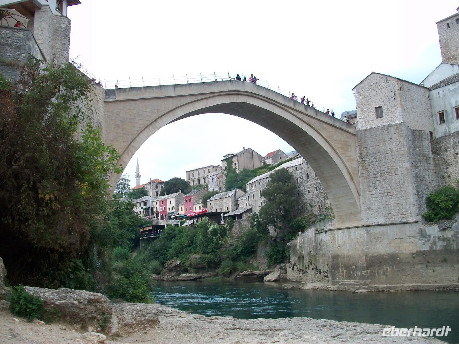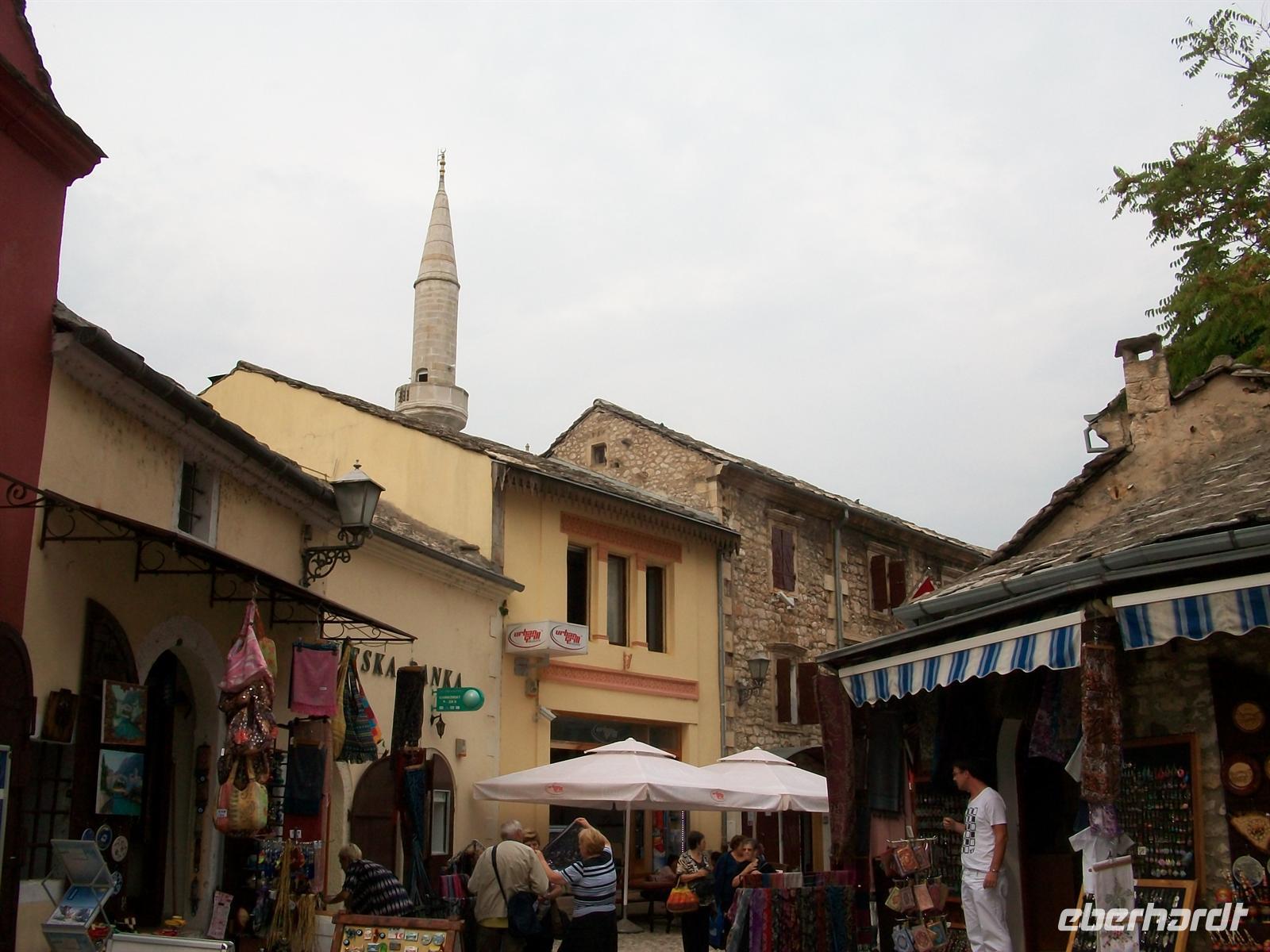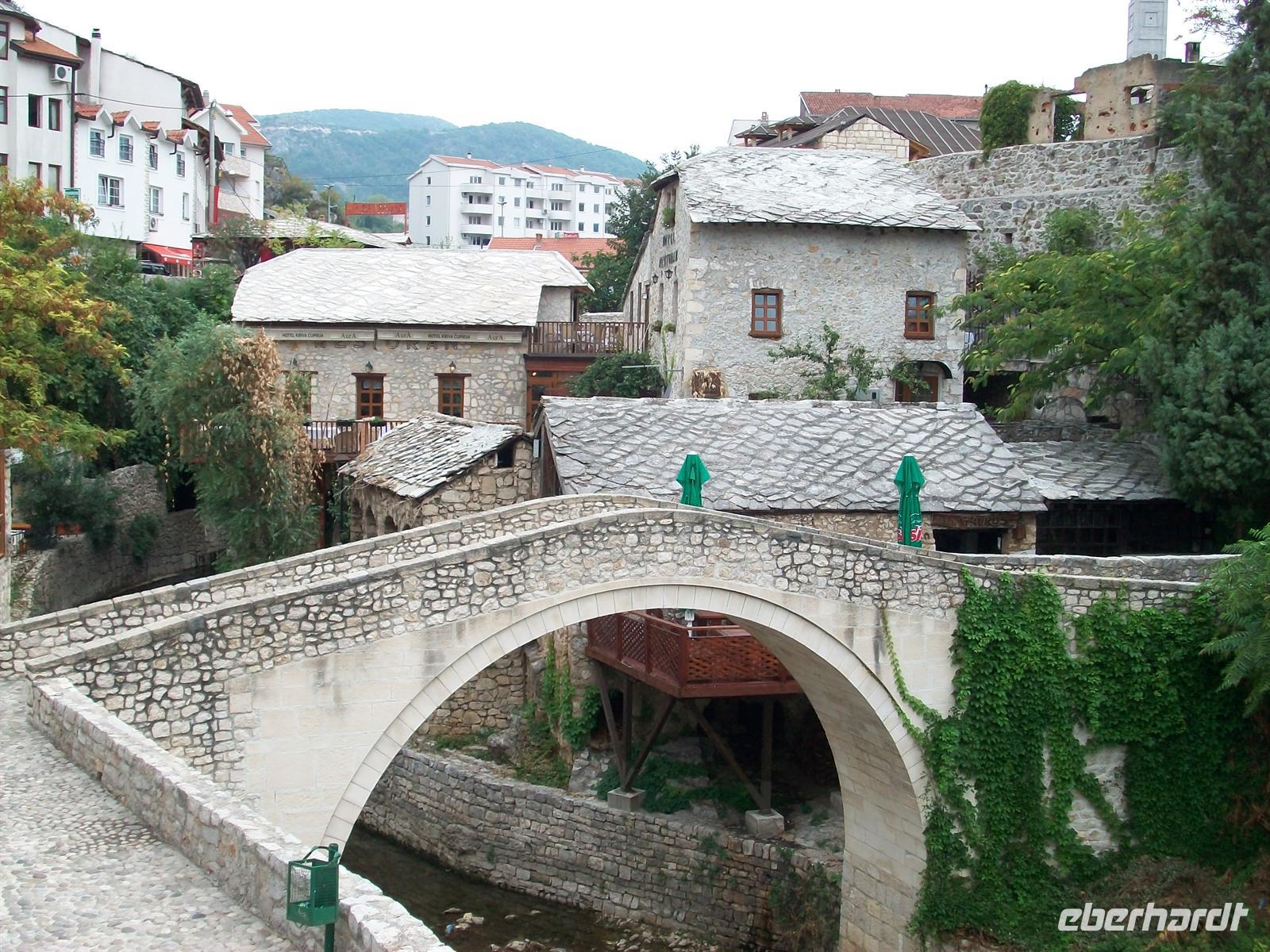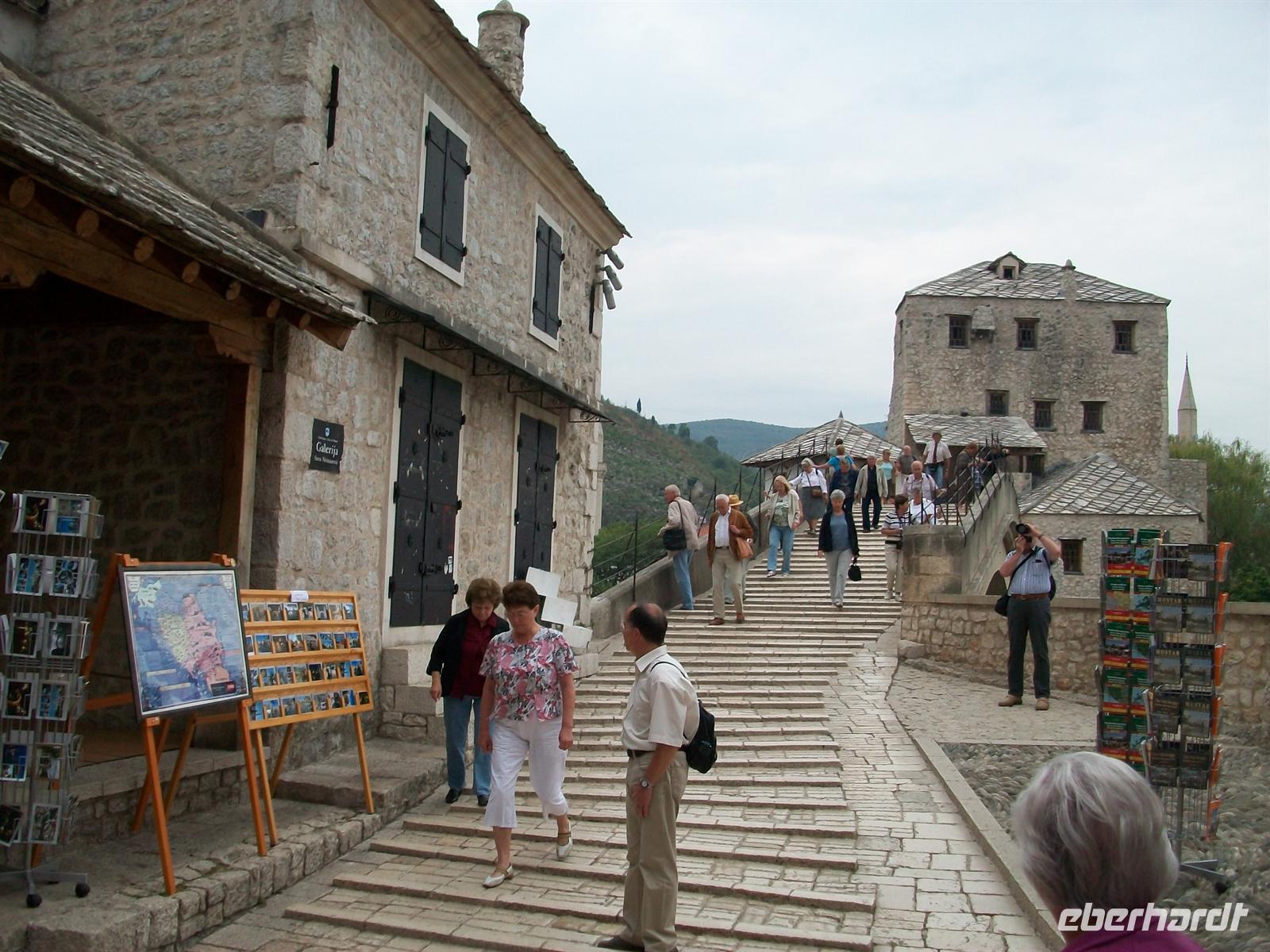 Befindlichkeiten von Mostar näherbringen, trotz aller Probleme mit viel Humor gewürzt. Natürlich überschreiten wir die „Stari Most“ um an der gegenüberliegenden Seite ein phantastisches Fotomotiv von der berühmten Brücke zu haben. Dann besuchen wir eine Moschee und Adnan macht uns hier mit den interessanten Details des moslemischen Glaubens bekannt, der hier seit Mitte des 15. Jahrhunderts Fuß gefasst hat. Dann besichtigen wir das Türkische Haus und werfen einen Blick auf das Leben der einfachen Bevölkerung, sehen die uns fremden Gebrauchsgegenstände und schauen auch noch in die „gute Stube“ hinein. Dieses Mostar hat schon ein eigenartiges Flair und man befindet sich hier in einem Ort wie in den Märchen aus Tausend- und- einer- Nacht beschrieben. Bis zur Abfahrt des Busses verbleibt noch eine Stunde Zeit um dieses exotische Gefühl zu genießen.