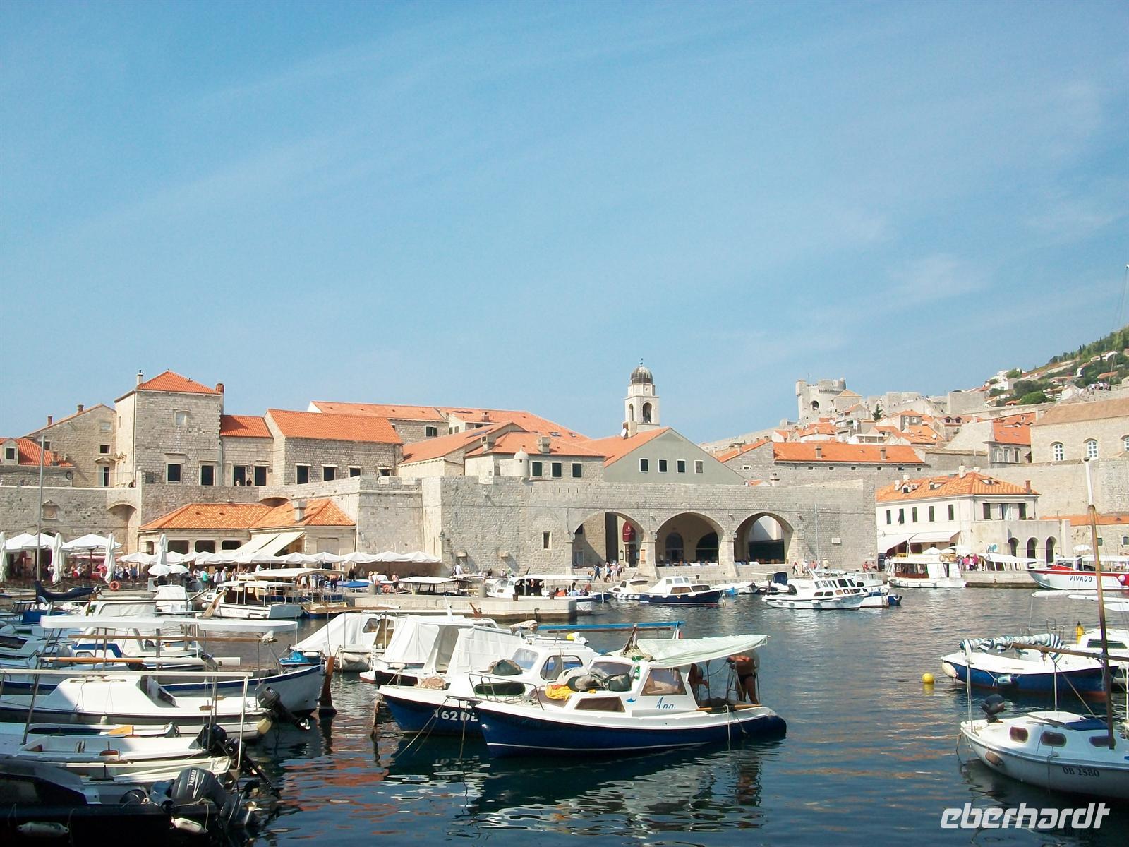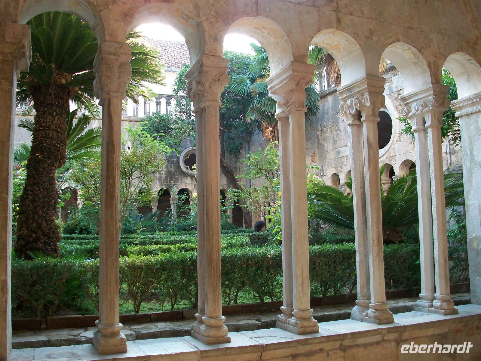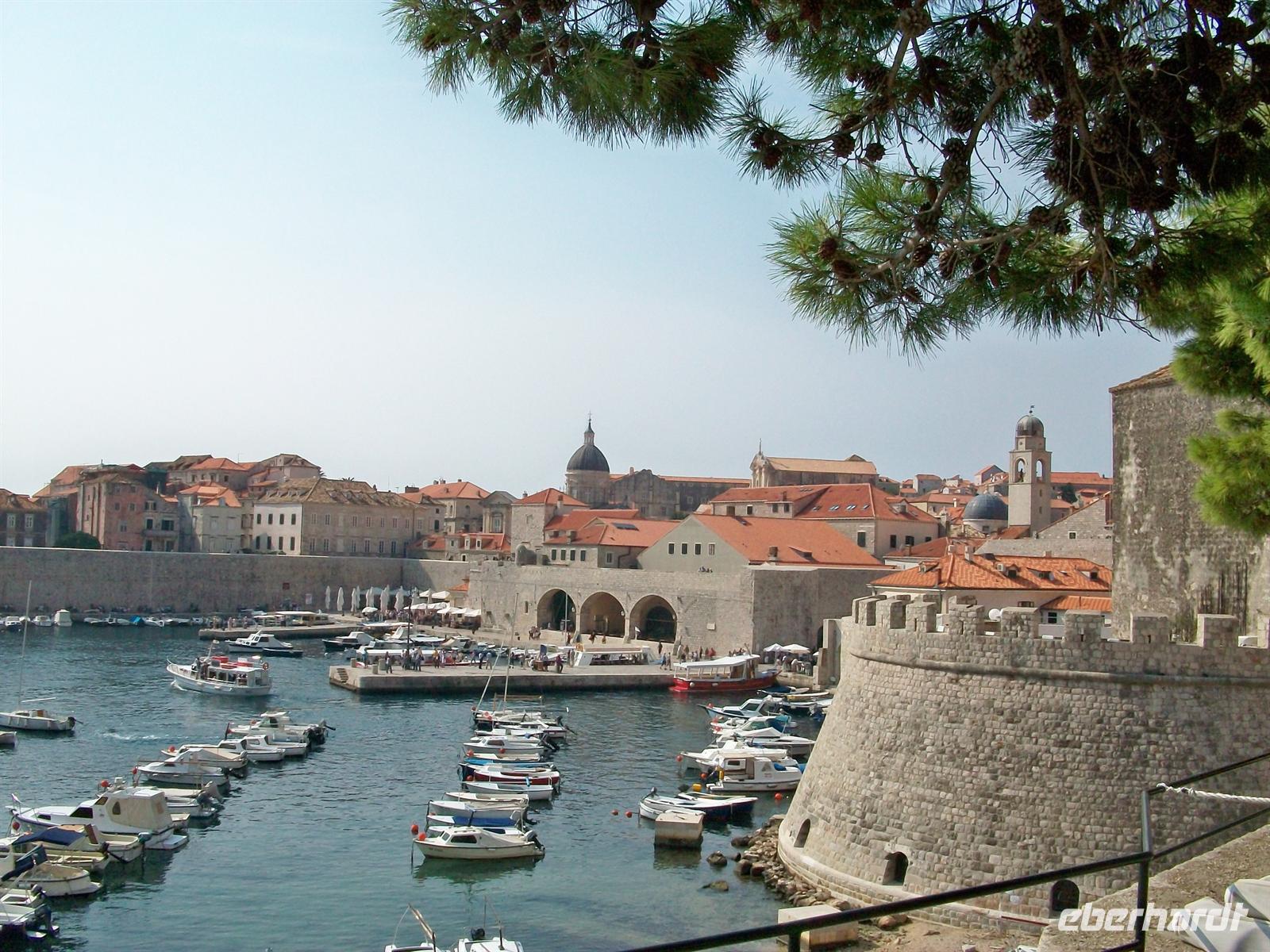 Wir durchqueren die doppelte Stadtmauer und sind schon auf Stradun der Hauptfußgängerzone angelangt. Hier ist alles blitzsauber und die Morgensonne widerspiegelt sich im glänzenden Pflaster der Stadt. Wir besuchen zuerst das Franziskanerkloster mit dem schönen romanischen Kreuzgang und der Alten Apotheke. Dann führt uns Antea durch pittoreske Gassen zum Alten Hafen, wir sehen im Hintergrund die Gebäude der ehemaligen Quarantäne und im Wasser des Hafenbeckens warten zahlreiche Ausflugsboote auf Kundschaft. Dann machen wir noch Halt an der Kathedrale und erfahren am Rektorenpalast sehr interessante Details zur Machtverteilung in der einstmaligen Stadtrepublik Ragusa. Antea bringt uns diese versunkene Zeitepoche so lebendig näher als ob wir während der Führung selbst in vergangenen Jahrhunderten wandeln würden.