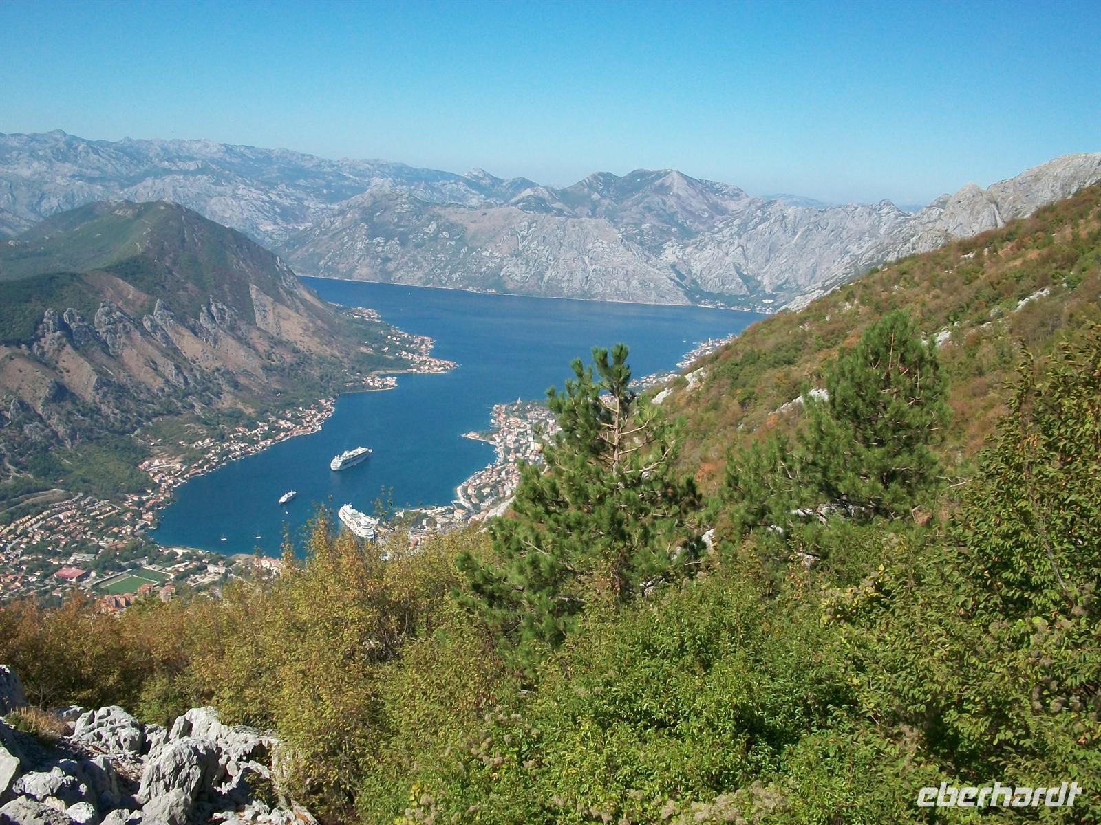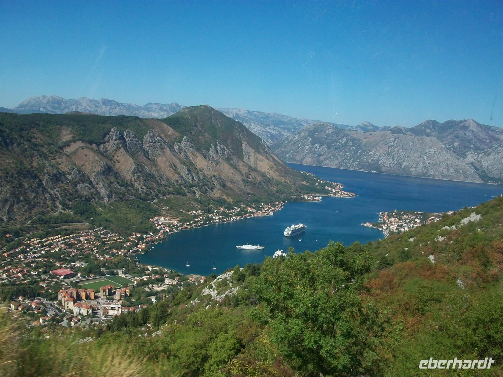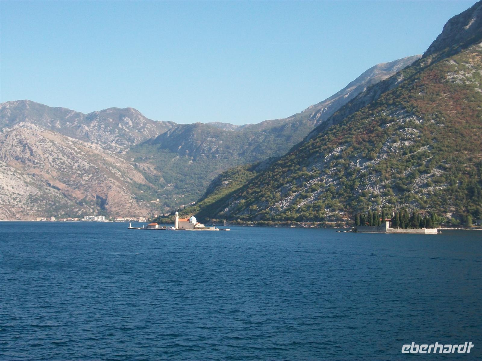 Grenzübergang und sind nun in der Bucht von Kotor unterwegs. Sie hat sehr viel Ähnlichkeit mit einem norwegischen Fjord, mit dem üppigen Grün des mediterranen Klimas bewachsen, steigen von der Bucht die Berge steil an. Sie widerspiegeln sich im Wasser der Bucht und geben dadurch der Region einen besonderen Reiz. An der Meerenge Verige sehen wir die zwei Inseln, eine davon trägt ein kleines Kloster. Dann sind wir im Teilstück der Bucht von Risan unterwegs und bald kommen auch die Festungsmauern von Kotor in Sicht die sich hier hoch in die Berge ziehen.