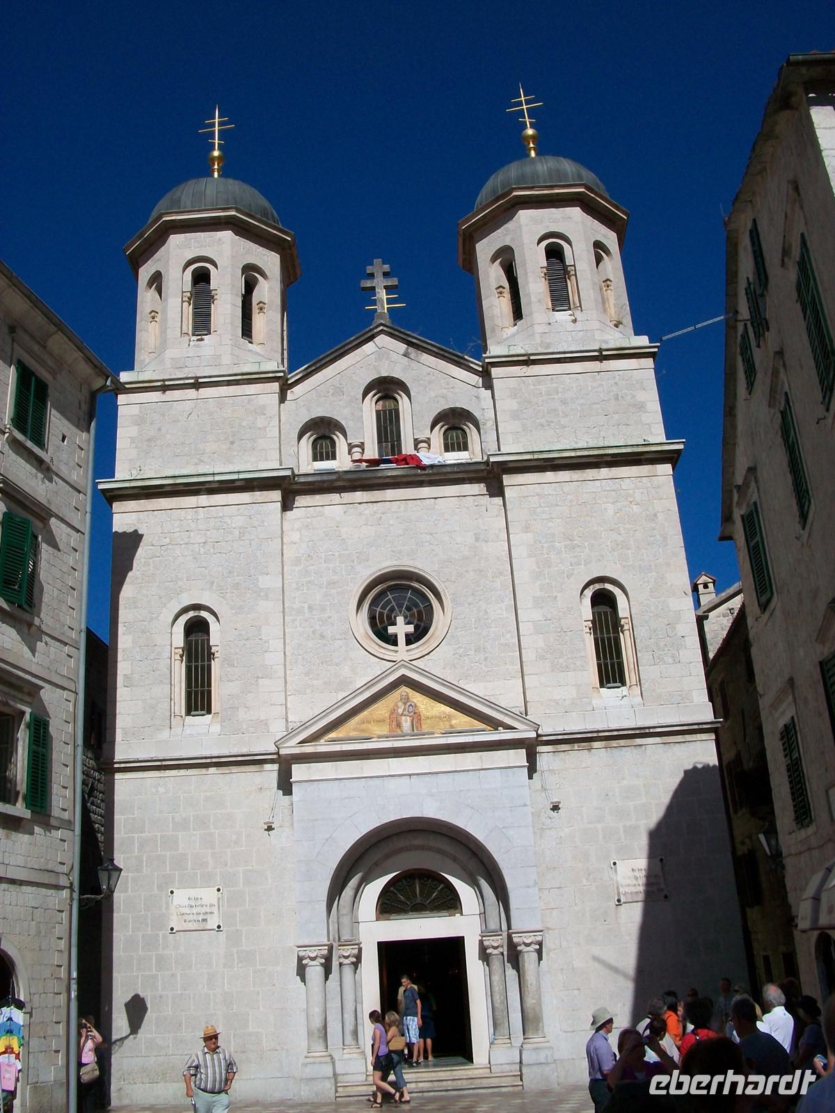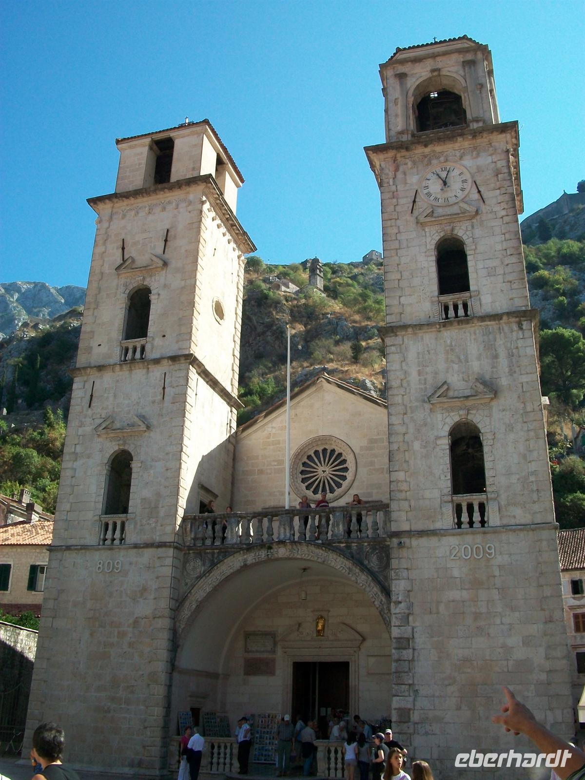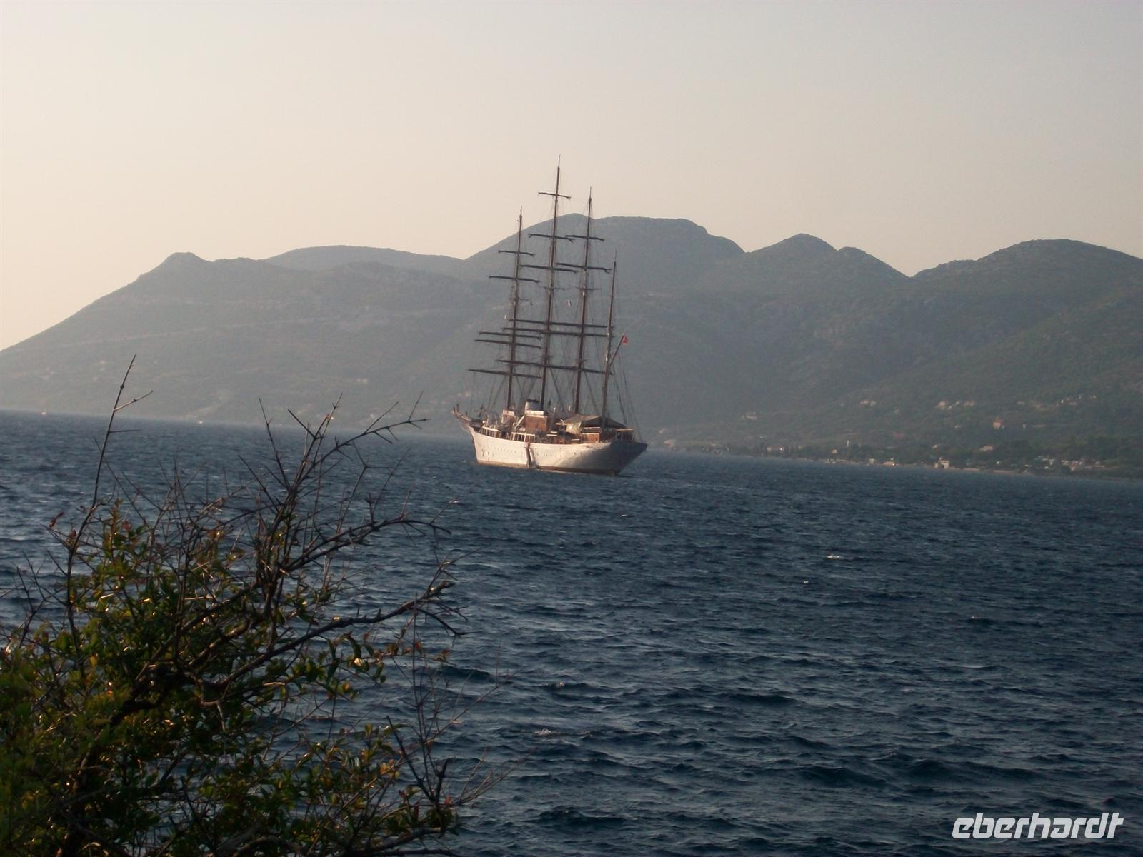 Grenzübergang und sind nun in der Bucht von Kotor unterwegs. Sie hat sehr viel Ähnlichkeit mit einem norwegischen Fjord, mit dem üppigen Grün des mediterranen Klimas bewachsen, steigen von der Bucht die Berge steil an. Sie widerspiegeln sich im Wasser der Bucht und geben dadurch der Region einen besonderen Reiz. An der Meerenge Verige sehen wir die zwei Inseln, eine davon trägt ein kleines Kloster. Dann sind wir im Teilstück der Bucht von Risan unterwegs und bald kommen auch die Festungsmauern von Kotor in Sicht die sich hier hoch in die Berge ziehen.