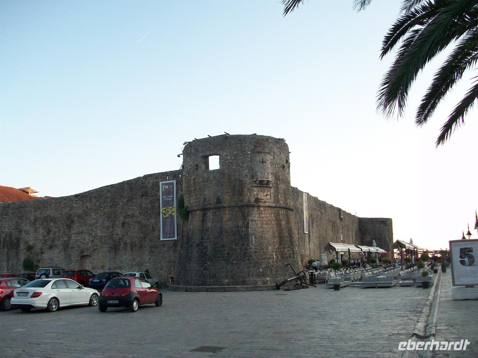 Über eine Landstraße kommen wir bald zu dem Gebirge welches das Hinterland von der Küste trennt und sehen die weite Wasserfläche der Adria die in der Nachmittagssonne glitzert. Tief unten ist auch schon die malerisch gelegene Halbinsel zu sehen auf die der Ort Budva angelegt wurde, unser letztes Ziel heute in Montenegro. Bald sind wir in Serpentinen hinuntergefahren und in wenigen Gehminuten stehen wir an den Befestigungsmauern von Budva. Es bleibt eine knappe Stunde Zeit diesen reizvollen Ort zu erkunden der auch im typischen Stil mit altertümlichen Häusern aus Kalkstein erbaut wurde und durchzogen ist von schmalen heimlichen Gassen. Dazu gibt es ein quirliges Treiben denn Budva ist ein vielbesuchter Touristenort mit zahlreichen Cafes.
