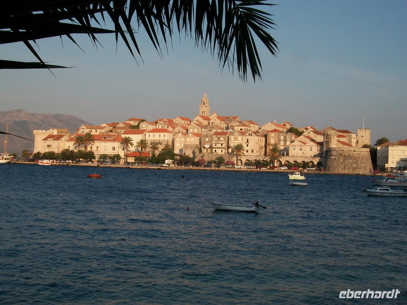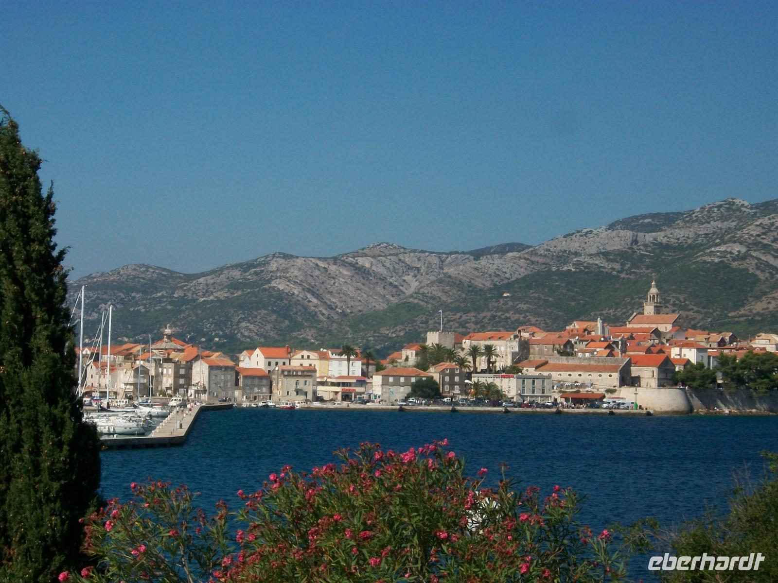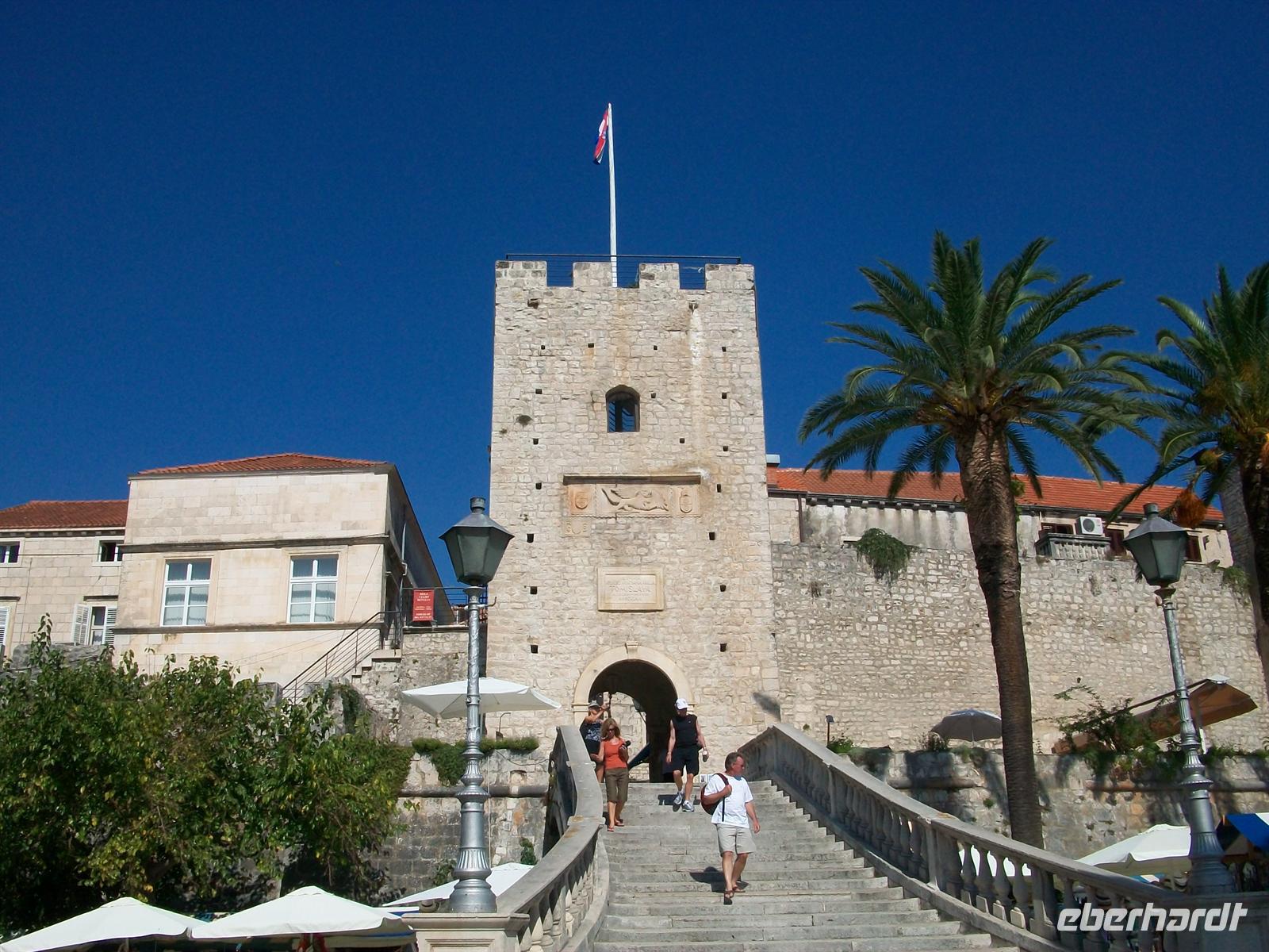 Dann geht es weiter auf der Halbinsel, nach etwa einstündiger Fahrt baut sich nun eine mächtige Erehebung vor unseren Augen auf. Es ist der heilige Eliasberg der fast 1 000 Meter vom Meeresspiegel aufsteigt und einen mächtigen Eindruck auf den Betrachter ausübt. Nach kurzem Halt fahren wir aber nun die Straße abwärts zum Ort Orebi um uns am Fähranleger anzustellen. Gegen halb zwölf legt die Fähre ab und nach einer guten Viertelstunde sind wir auf der Insel Korula angekommen. Auch hier begrüßt uns ein üppiges Grün, nach wenigen Minuten sind wir an der Altstadt angekommen die auch ganz malerisch auf einer Halbinsel liegt. Hier werden wir schon von unserem Stadtführer Lujo erwartet der uns nun auf sehr originelle Art die nächsten Stunden begleiten wird. Zuerst sehen wir uns aber die altehrewürdigen Mauern von Korula an und tauchen tief ein in das nicht immer leichte Leben der Insulaner, welches wir in den zwei Museen nähergebracht bekommen. Dann besuchen wir die Kathedrale mit der sehr interessanten Innenarchitektur und dem Bild von Tintoretto, welches einen wahren Schatz darstellt.