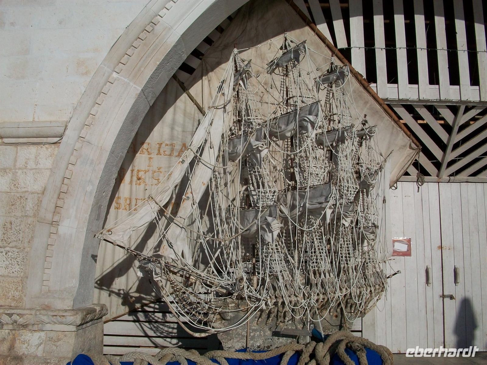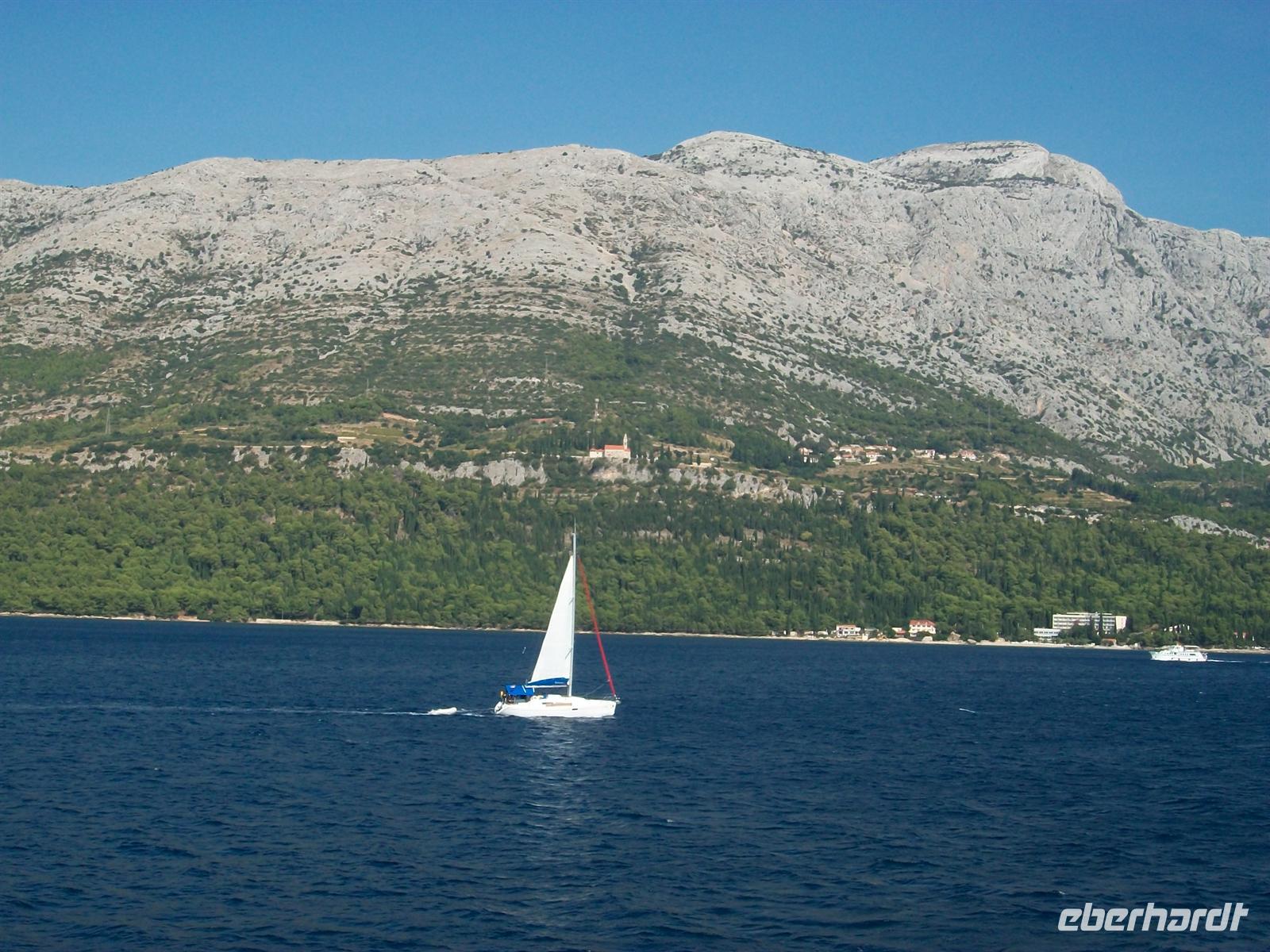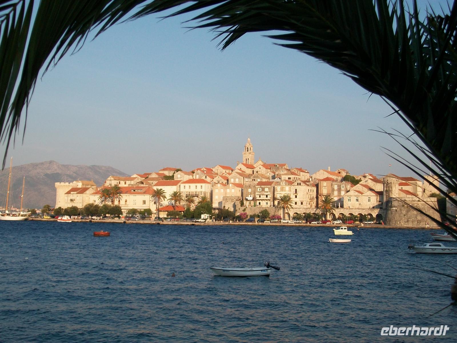 Dann geht es weiter auf der Halbinsel, nach etwa einstündiger Fahrt baut sich nun eine mächtige Erehebung vor unseren Augen auf. Es ist der heilige Eliasberg der fast 1 000 Meter vom Meeresspiegel aufsteigt und einen mächtigen Eindruck auf den Betrachter ausübt. Nach kurzem Halt fahren wir aber nun die Straße abwärts zum Ort Orebi um uns am Fähranleger anzustellen. Gegen halb zwölf legt die Fähre ab und nach einer guten Viertelstunde sind wir auf der Insel Korula angekommen. Auch hier begrüßt uns ein üppiges Grün, nach wenigen Minuten sind wir an der Altstadt angekommen die auch ganz malerisch auf einer Halbinsel liegt. Hier werden wir schon von unserem Stadtführer Lujo erwartet der uns nun auf sehr originelle Art die nächsten Stunden begleiten wird. Zuerst sehen wir uns aber die altehrewürdigen Mauern von Korula an und tauchen tief ein in das nicht immer leichte Leben der Insulaner, welches wir in den zwei Museen nähergebracht bekommen. Dann besuchen wir die Kathedrale mit der sehr interessanten Innenarchitektur und dem Bild von Tintoretto, welches einen wahren Schatz darstellt.