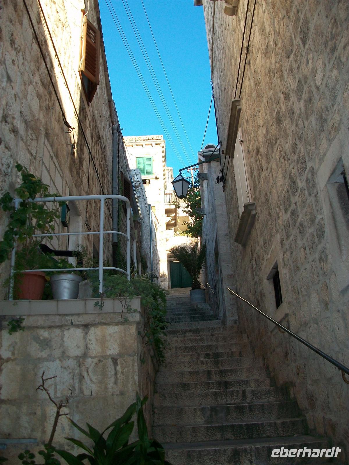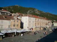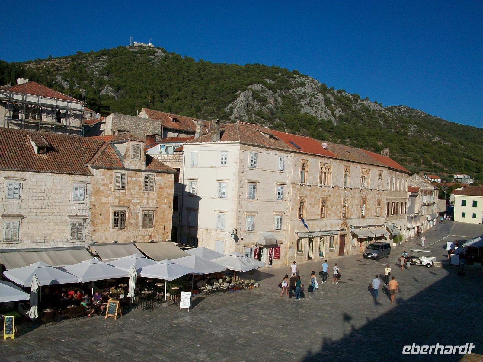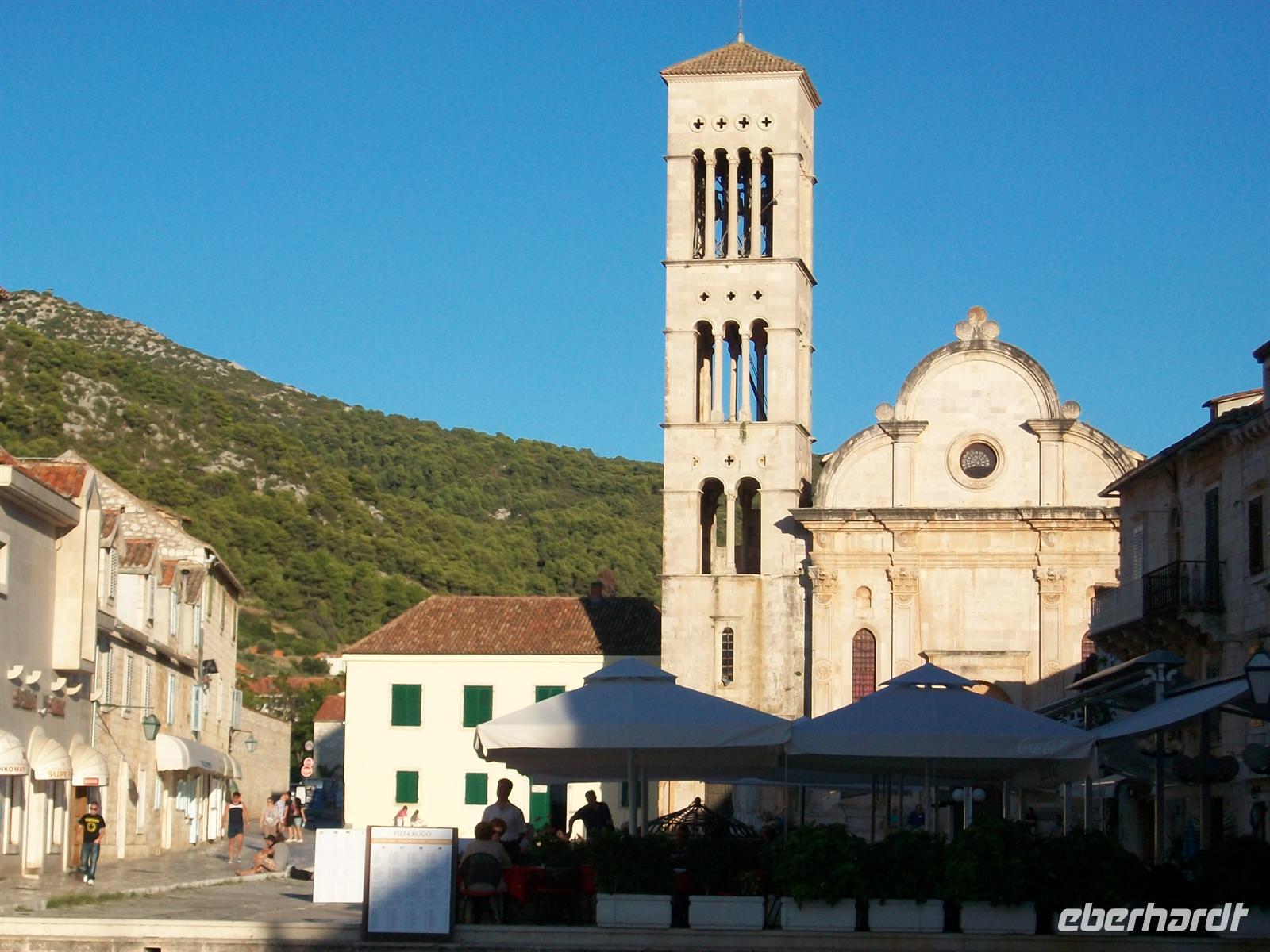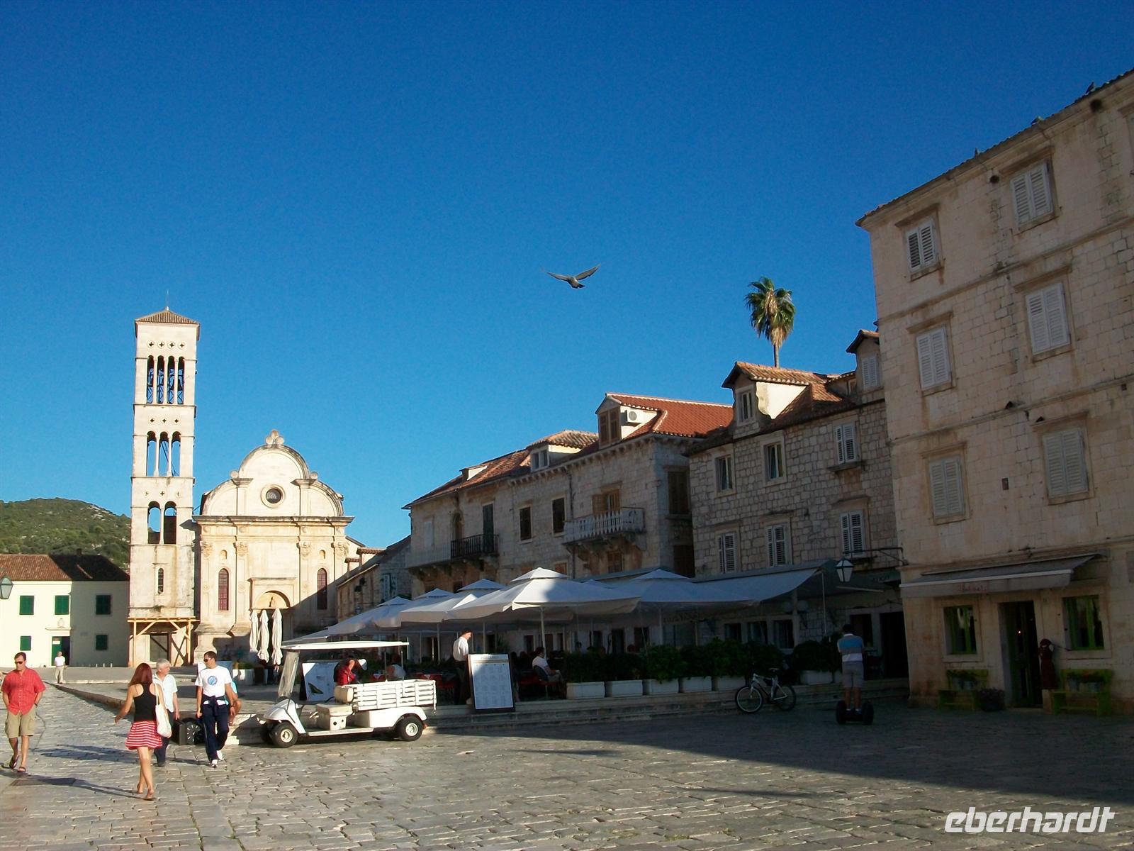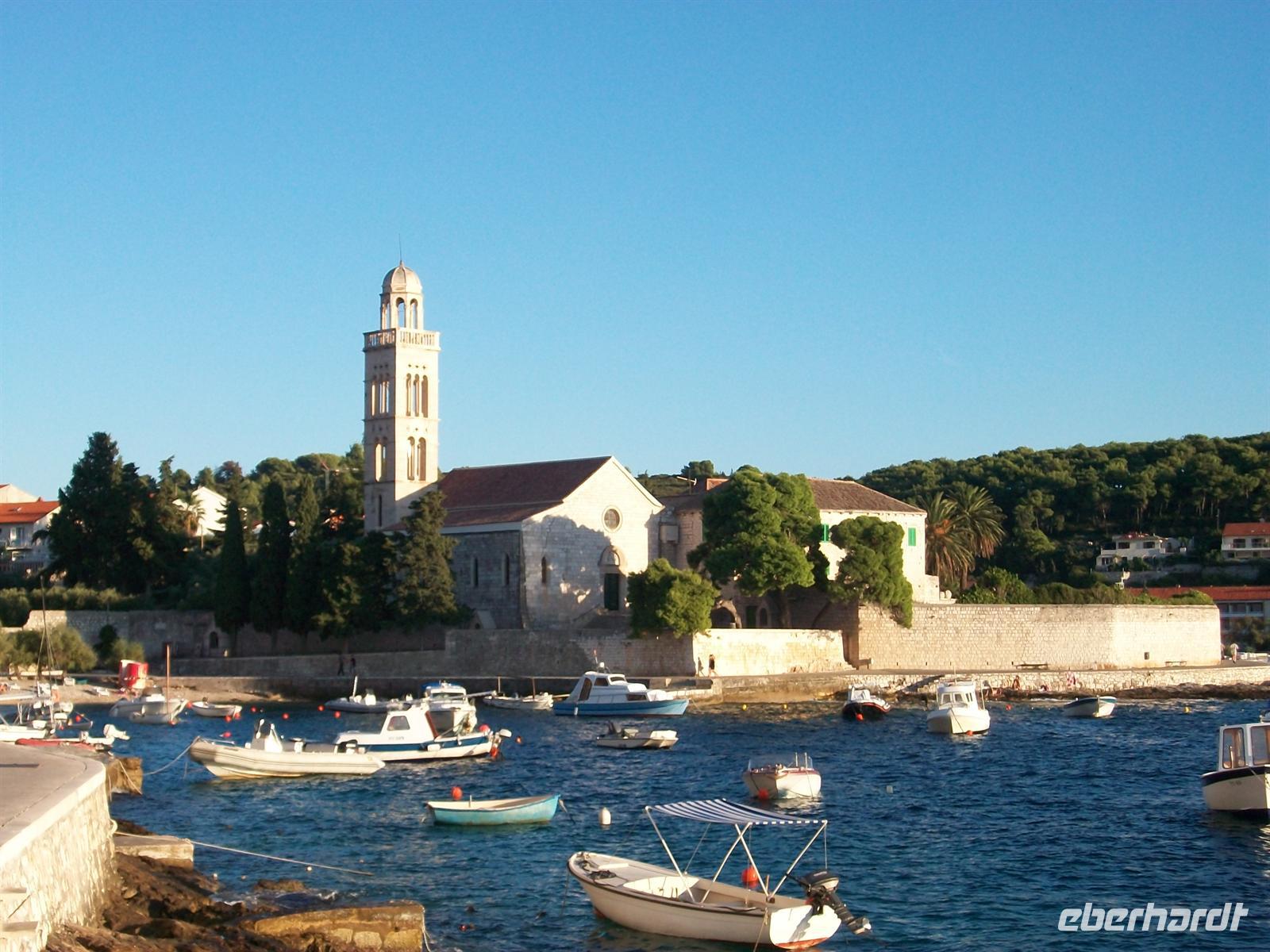 vielen Bodenunebenheiten. Diese Straße führt uns die nächsten zwei Stunden vom Fährhafen Suurei über die gesamte Insel zum Ort Hvar. Wir kommen kurz vor halb fünf an und werden hier schon von unserer Führerin Loredana erwartet. Die nächste Stunde tauchen wir wieder ein in die Historie vergangener Jahrhunderte. Wir besuchen die Kathedrale, sehen auch hier die schmalen Gassen und gehen hinauf zum Ausblick an der Brüstung des Arsenals. Hvar hat auch eine schöne Promenade, hier sind sehr viele Schiffe und Privatjachten festgemacht, die im leichten Wellengang des Meeres schaukeln. Nach der Führung verbleibt noch etwas Zeit, 18.30 Uhr starten wir und durchqueren etwas später das Inselgebirge, nach einer guten halben Stunde kommen wir an unserem Hotel „Arkada“ bei Starigrad an. Schnell sind die Formalitäten erledigt und nach dem Abendessen lohnt noch ein kleiner Spaziergang, das Hotel liegt direkt am Wasser in der Bucht von Starigrad.