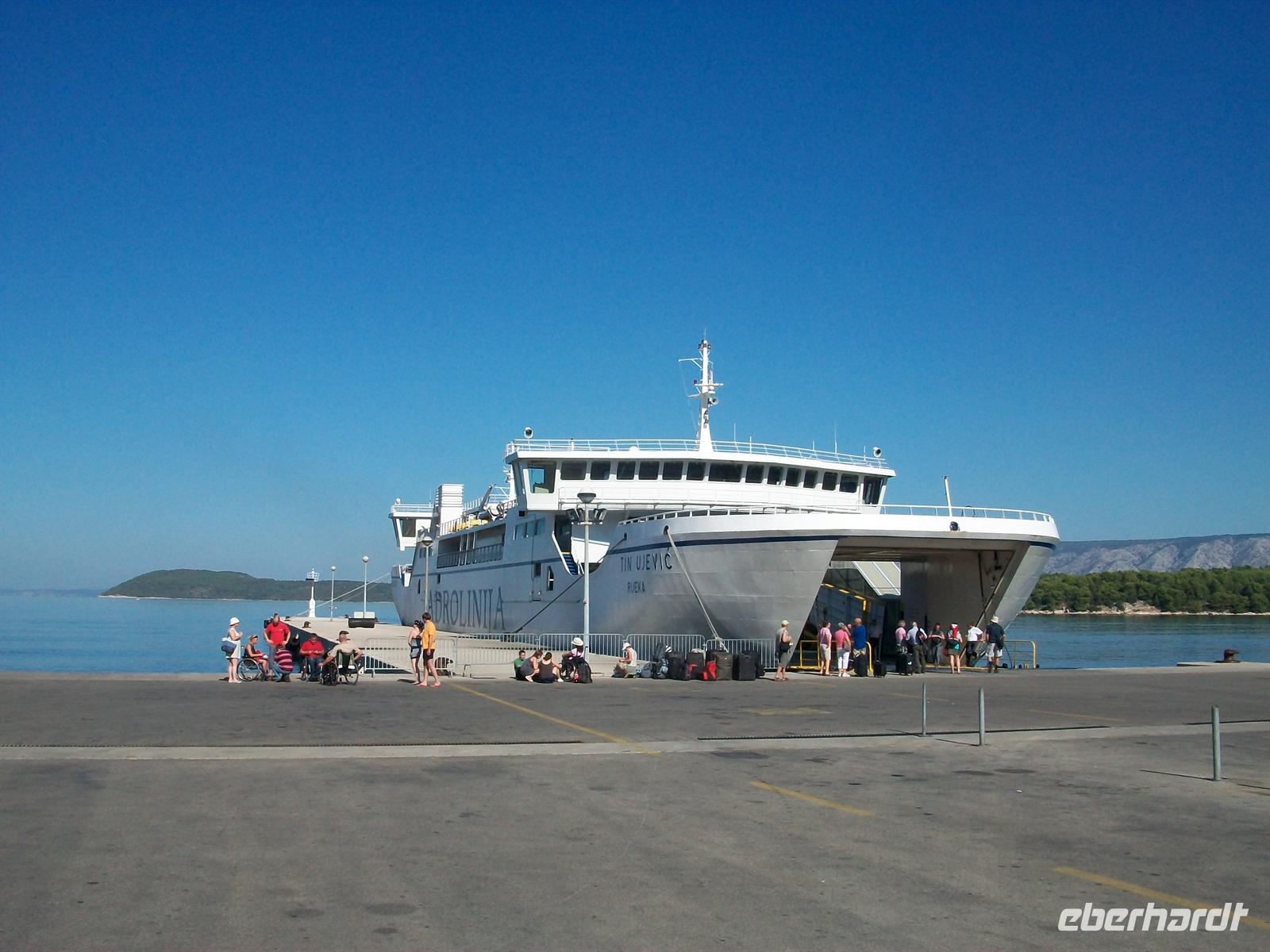 Dann fahren wir weiter zum Fähranleger, hier warten wir auf das Schiff welches pünktlich 11.30 Uhr ablegt. Da uns der Wettergott heute wieder wolkenloses Wetter beschert hat, gestaltet sich die Überfahrt sehr schön. Die meisten unserer Gäste haben es sich oben an Deck gemütlich gemacht und genießen die ruhige Überfahrt. Rechts kommt bald die Insel Bra und links die Insel Šolta in Sichtweite, beide treten ganz nah zusammen und bilden eine Meerenge durch welche wir fahren. Danach ist im Hintergrund schon das helle Häusermeer von Split zu sehen, auf diese Stadt nehmen wir nun Kurs. Nach zweistündiger Überfahrt verlassen wir die Fähre und suchen uns durch das Gewühl der Stadt den Weg zur Autobahn. Flott sind wir unterwegs um noch eine schöne Stadt zu besuchen- Zadar. Wir kommen gegen 16.50 Uhr hier an und werden auch schon von unserer Führerin erwartet.