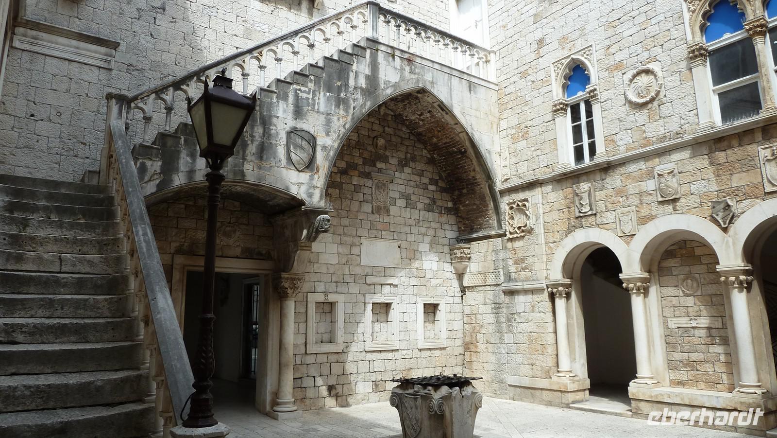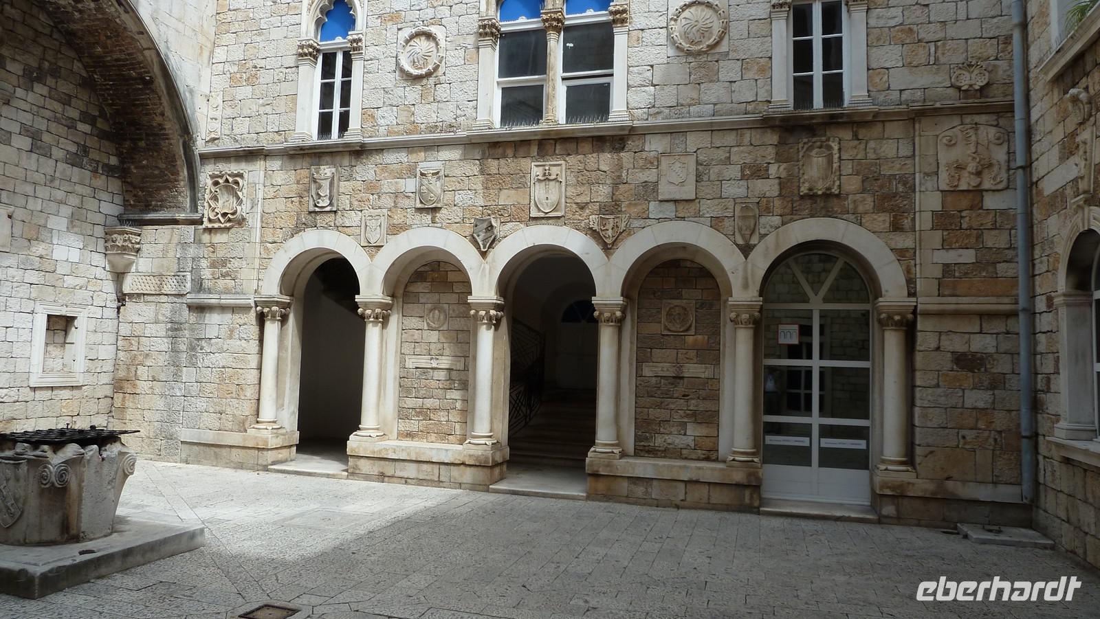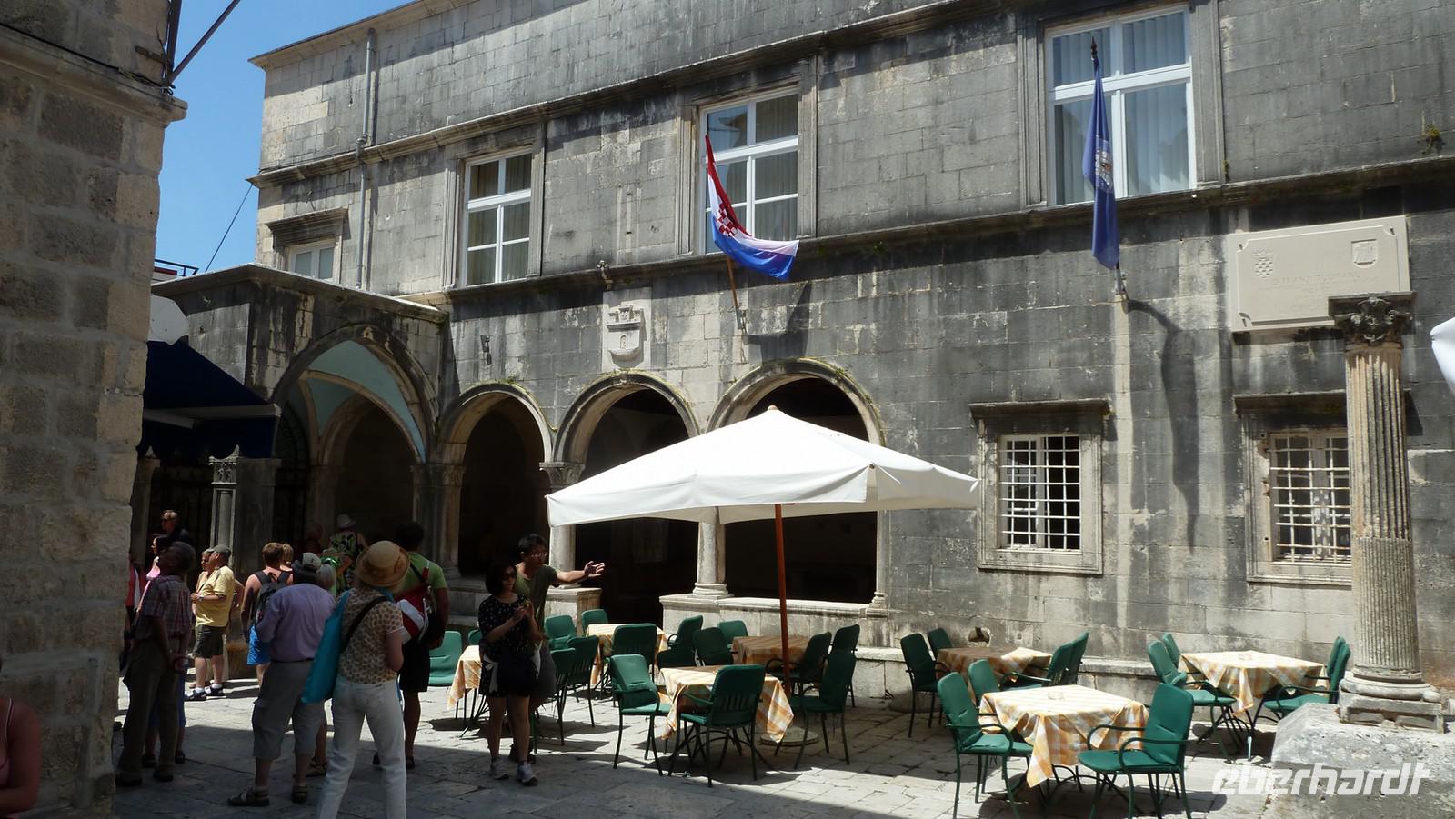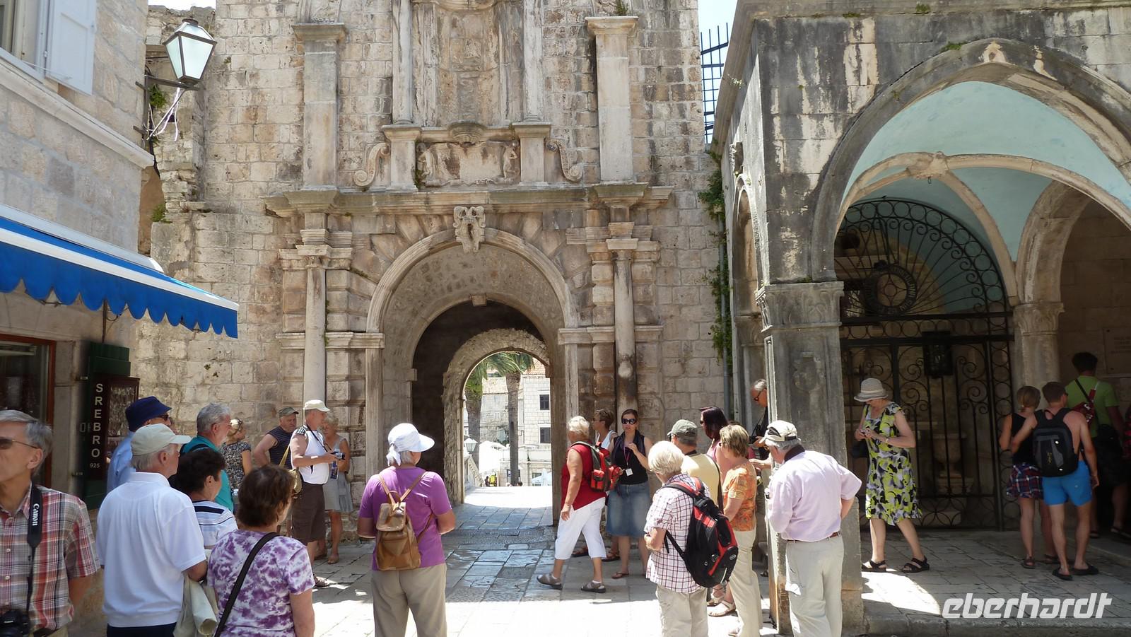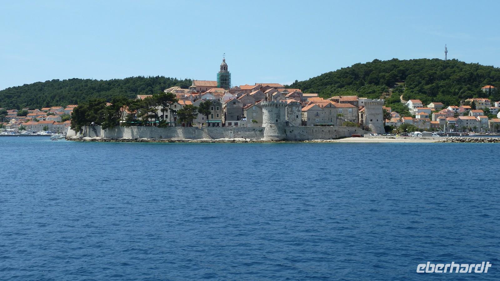 Heute geht es auf der Jadranska Magistrala zurück bis Doli. Auf der linken Seite sehen wir die südlichste Inselgruppe Dalmatiens: die Elaphiten. Nach einer Stunde haben wir Veliki Ston erreicht und bestaunen die längste Mauer Europas. Seit 1333 schützt die 5km lange Mauer die Salinen der ehemaligen Republik Ragusa. Wir unternehmen einen Rundgang durch den beschaulichen Ort und sehen das Kloster, die Festungsanlagen, den Brunnen, den ehemaligen Rektorenpalast und die Salinen. Die Schäden des letzten Erdbebens von 1996 sind dabei nicht zu übersehen. Weiter geht es auf der Halbinsel Peljesac durch Weinberge, kleine Ortschaften bis wir endlich Orebic am Fuße des Sveti Ilija erreichen. Mit der Fähre um 11:30 Uhr geht es auf die Insel Korcula und in die Stadt gleichen Namens. Stanka erwartet uns am Fähranleger und führt uns durch dieses Museumsstädtchen. Die Stadt ist ein lebendiges Stück Mittelalter und hinterlässt bei den Besuchern bleibende Eindrücke. Am Nachmittag geht es auf das Festland zurück und mit dem Bus wieder zurück nach Mlini.