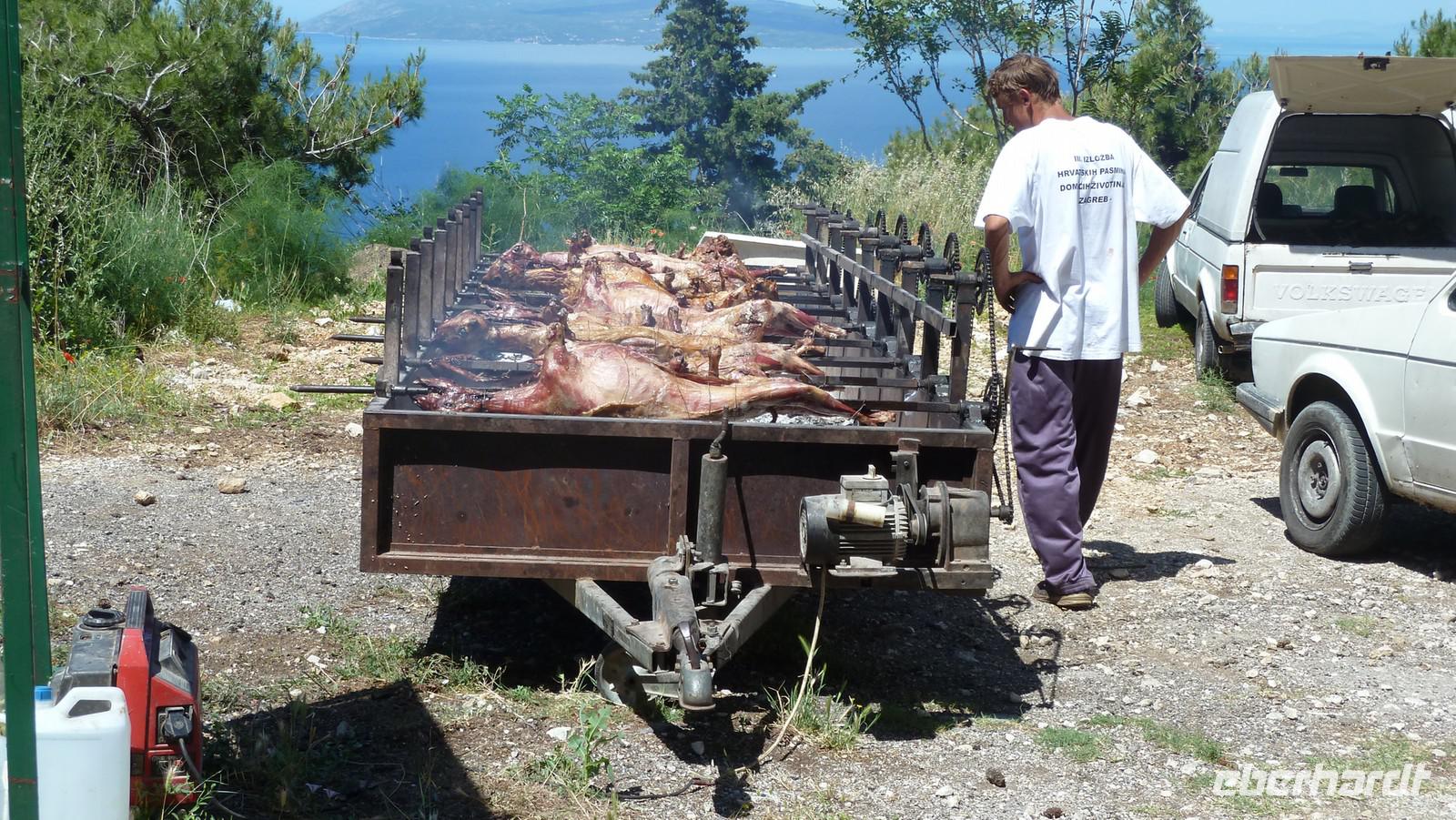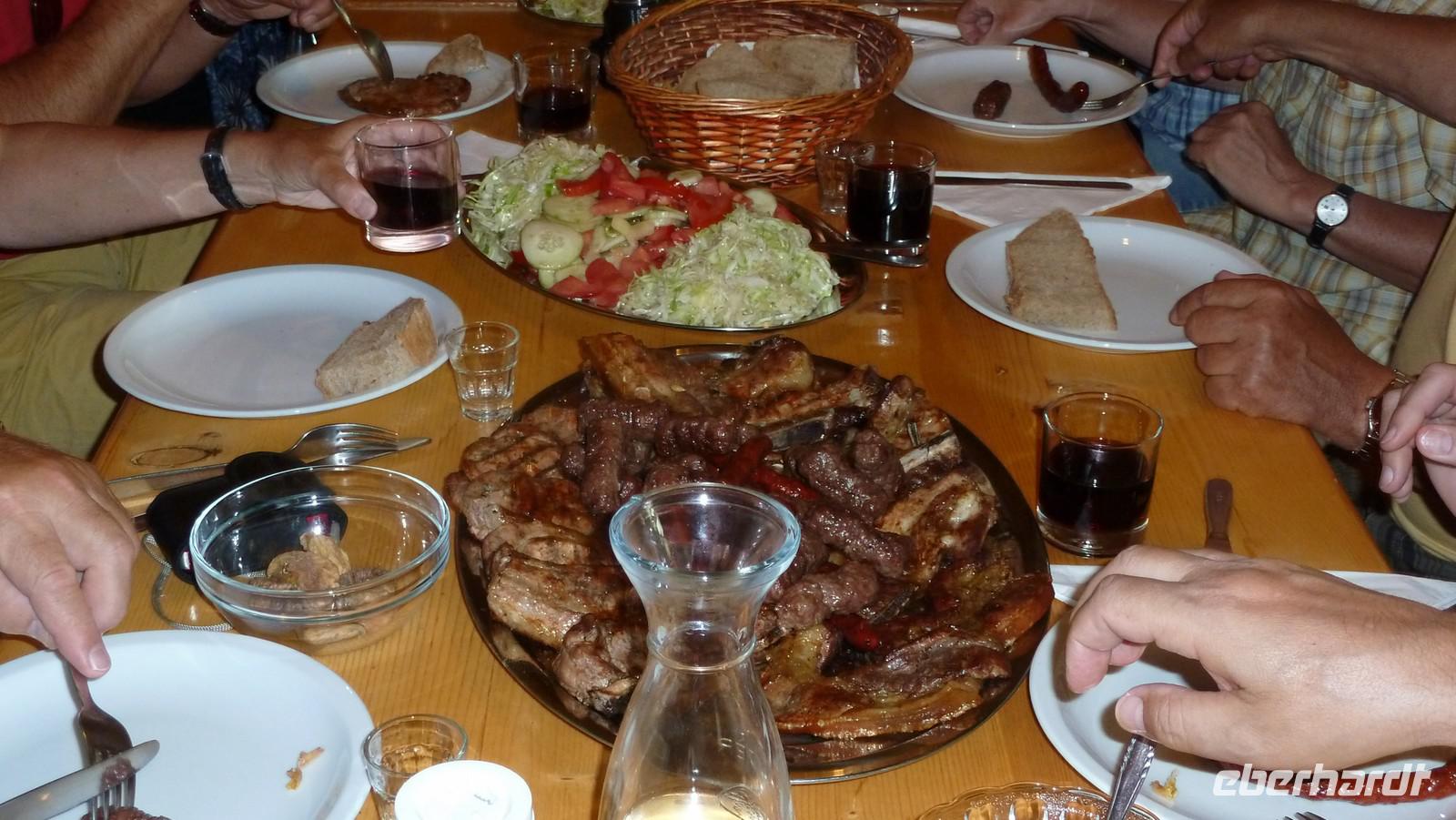 13.Tag Heute steht ein weiterer Höhepunkt auf dem Programm. Wir machen mit Mate Jovic eine fakultative Reise ins Biokovo Gebirge. 9:00 Uhr werden wir mit dem kleinen Bus abgeholt und es geht die alte österreichische Militärstraße über viele Serpentinen von Meeresspiegelhöhe sofort auf 875m Höhe. Am ersten Panoramapunkt genießen wir den Ausblick auf Podgora und Tucepi. Weiter geht es auf der schmalen kurvenreichen Straße zum nächsten Aussichtspunkt (1228m) bis wir dann endlich auf dem Sveti Jure stehen(1762m). Bei strahlendem Sonnenschein genießen wir die phantastische Aussicht. Weitere Fahrzeuge waren unterwegs. Somit müssen wir eine günstige Zeit abpassen, um ohne Gegenverkehr zum nächsten Parkplatz zu kommen. Dort schließt sich eine 2km lange Wanderung zum Aussichtspunkt Vosac an. Der Ausblick ist überwältigend. Danach fahren wie zur Berghütte von Ante. Der serviert uns ein kroatisches Picknick mit allen typischen kroatischen Speisen und Getränken. Lustig und beschwingt erreichen wir am Nachmittag unser Hotel.