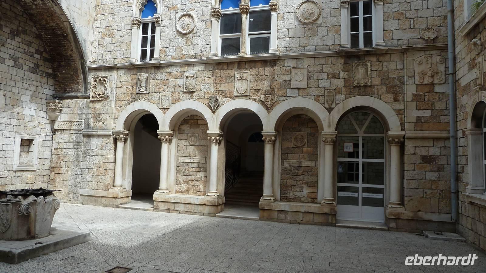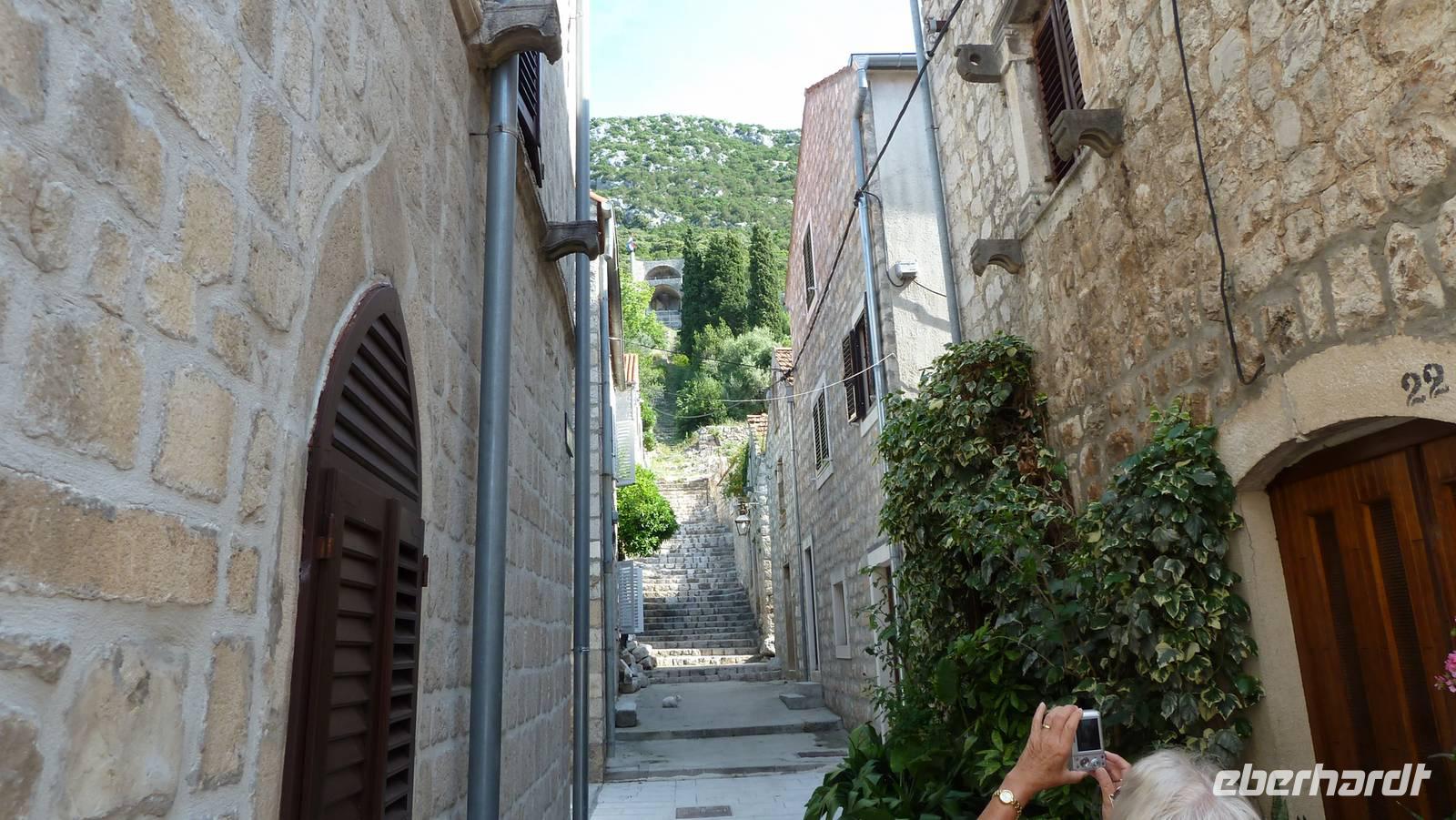 Heute geht es auf der Jadranska Magistrala zurück bis Doli. Auf der linken Seite sehen wir die südlichste Inselgruppe Dalmatiens: die Elaphiten. Nach einer Stunde haben wir Veliki Ston erreicht und bestaunen die längste Mauer Europas. Seit 1333 schützt die 5km lange Mauer die Salinen der ehemaligen Republik Ragusa. Wir unternehmen einen Rundgang durch den beschaulichen Ort und sehen das Kloster, die Festungsanlagen, den Brunnen, den ehemaligen Rektorenpalast und die Salinen. Die Schäden des letzten Erdbebens von 1996 sind dabei nicht zu übersehen. Weiter geht es auf der Halbinsel Peljesac durch Weinberge, kleine Ortschaften bis wir endlich Orebic am Fuße des Sveti Elias erreichen. Mit der Fähre und der Bura geht es um 11:30 Uhr auf die Insel Korcula und in die Stadt gleichen Namens. Stanka erwartet uns am Fähranleger und führt uns durch dieses Museumsstädtchen. Die Stadt ist ein lebendiges Stück Mittelalter und hinterlässt bei den Besuchern bleibende Eindrücke. Am Nachmittag geht es auf das Festland zurück. Nach einer erlebnisreichen Weinprobe mit Frau Matusko geht es mit dem Bus wieder zurück nach Mlini.