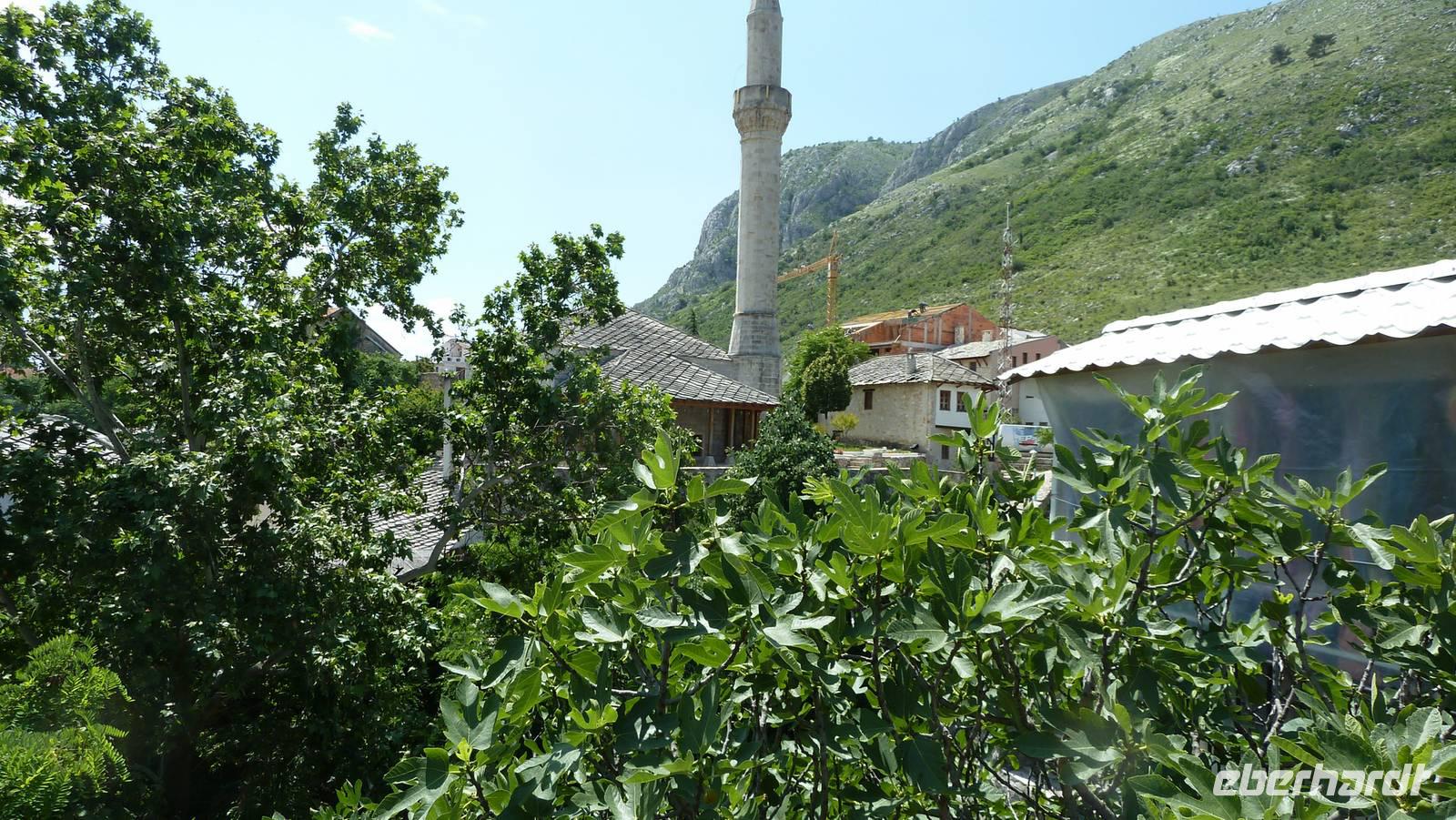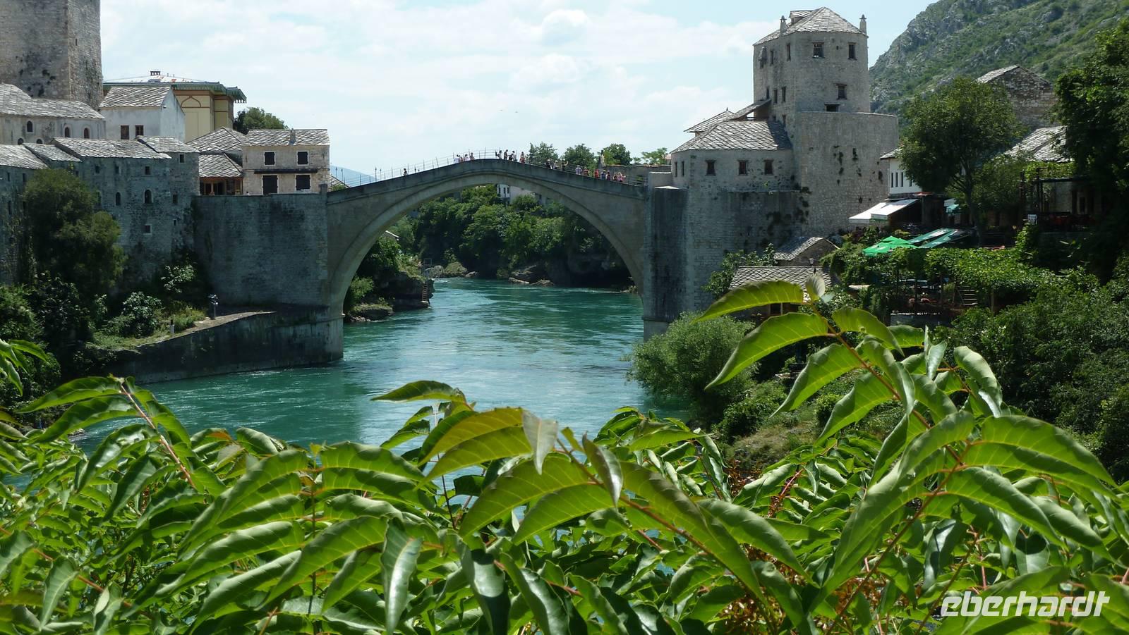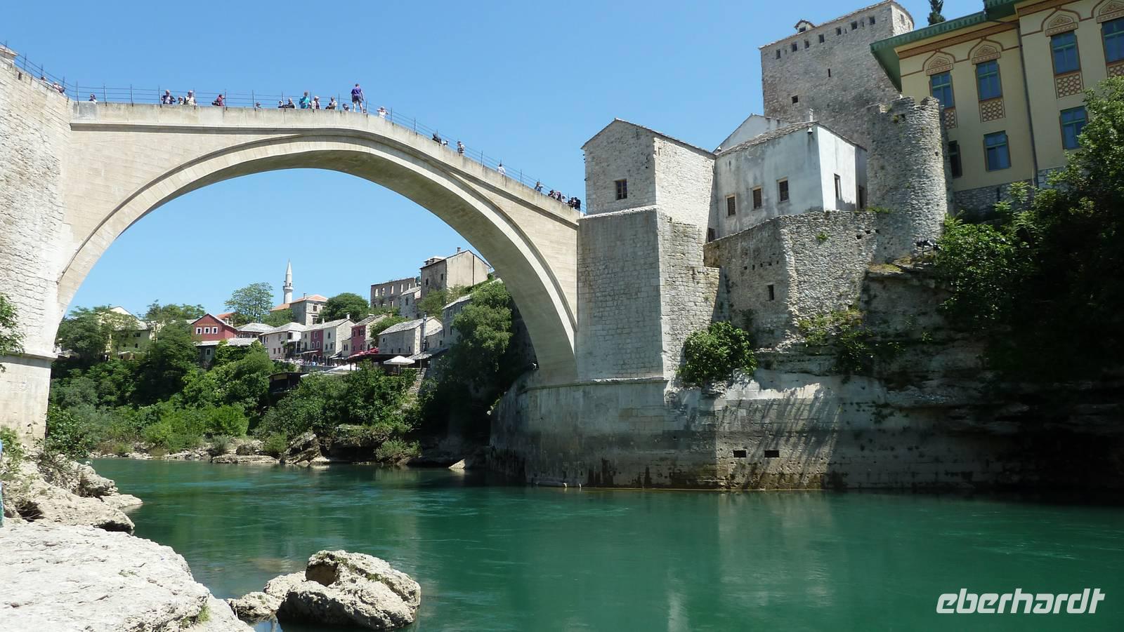 Auf unserem Ausflugsplan steht heute die Herzegovina mit ihrer Hauptstadt Mostar. Um dahinzugelangen müssen wir die Grenzen zu Neum und die Grenze nach dem Ort Metkovic passieren. Die Fahrt führt uns ab Opuzen immer im Tal der Neretva entlang. Dieser Teil der Herzegovina ist vorwiegend von Kroaten bewohnt, was sich sehr stark an den Fahnen erkennen lässt. Gegen 11:20 Uhr erreichen wir den Parkplatz an der Franziskanerkirche und werden vom Stadtführer Sasha erwartet. Gemeinsam spazieren wir von hier aus in die Altstadt. Während des Rundgangs sehen wir immer noch viele zerstörte Gebäude. Verfallene und ausgebrannte Gebäude sowie Einschusslöcher sind Zeitzeugen des Krieges. Bei dem Rundgang darf natürlich die berühmte „Alte Brücke" nicht fehlen. Die Brücke ist 2005 wieder aufgebaut worden, mit den Steinen der vorher zerstörten Brücke. Die Brückenspringer werben um zahlungsfreudige Gäste um für 30€ den Sprung in die Tiefe zu wagen. Um 13:00 Uhr verlassen wir Mostar um in der „Vila Neretva" Mittag zu essen. Bei 3 Sorten Wein und Schinken und Käse lassen wir es uns gut gehen. Obwohl es im Neretva Delta so schön ist müssen wir weiter. Nach einem Besuch an den Obstständen setzen wir unsere Fahrt fort nach Tucepi ins Hotel Aphrodita.Wir beziehen unsere Zimmer für die nächste Woche.