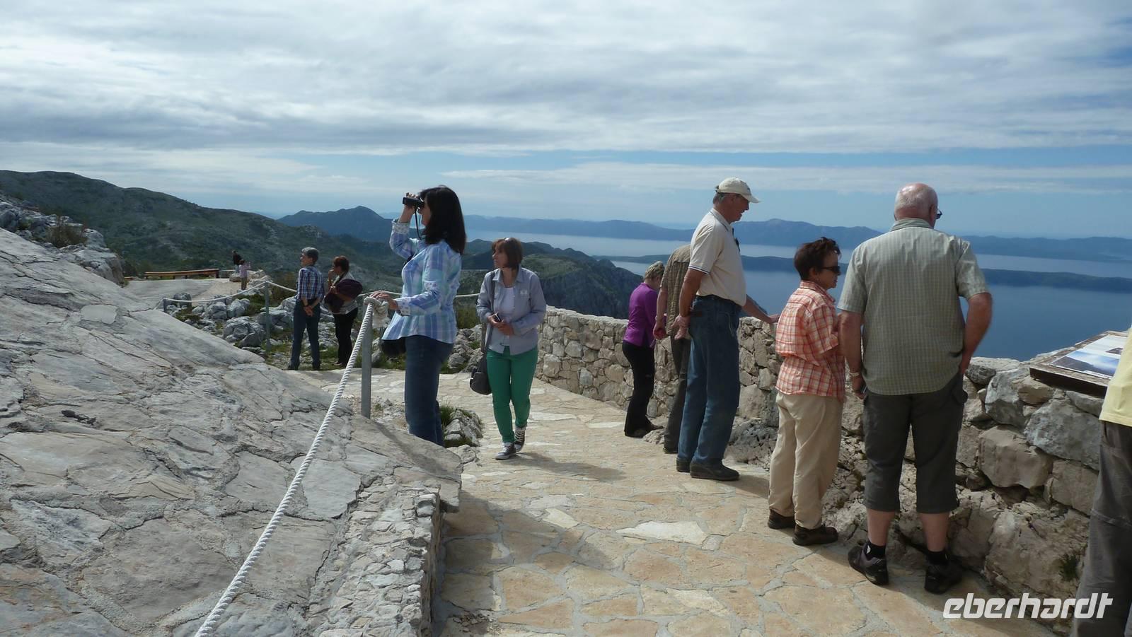 Heute steht ein weiterer Höhepunkt auf dem Programm. Wir machen mit Mate Jovic eine fakultative Reise ins Biokovo Gebirge. 9:00 Uhr werden wir mit dem kleinen Bus abgeholt und es geht die alte österreichische Militärstraße über viele Serpentinen von Meeresspiegelhöhe sofort auf 875m Höhe. Am ersten Panoramapunkt genießen wir den Ausblick auf Podgora und Tucepi. Weiter geht es auf der schmalen kurvenreichen Straße zum nächsten Aussichtspunkt (1228m) bis wir dann endlich auf dem Sveti Jure stehen(1762m). Dieser Ausblick nach allen Seiten ist unbeschreiblich. Weitere Fahrzeuge waren unterwegs. Somit müssen wir eine günstige Zeit abpassen, um ohne Gegenverkehr zum nächsten Parkplatz zu kommen. Dort schließt sich eine 2km lange Wanderung zum Aussichtspunkt Strbina an. Der Ausblick ist überwältigend. Danach fahren wie zur Berghütte von Ante. Der serviert uns ein kroatisches Picknick mit allen typischen kroatischen Speisen und Getränken. Lustig und beschwingt erreichen wir am Nachmittag unser Hotel.