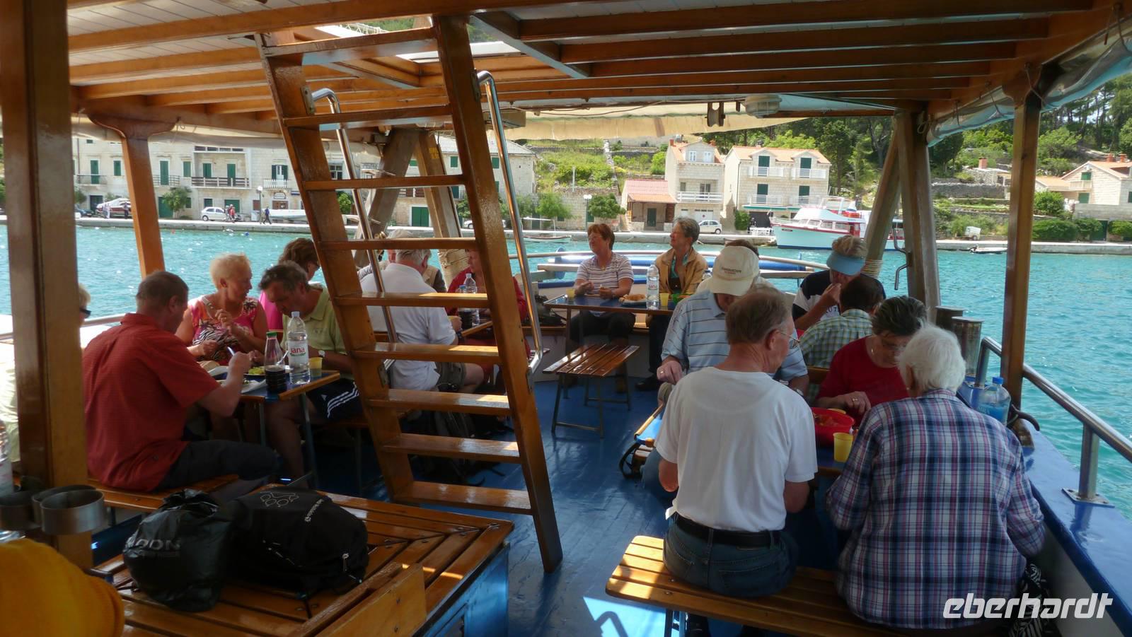 Am Freitag unternehmen wir mit dem Boot von Dragan einen Ausflug mit seinem Schiff. Um 09:00Uhr ging es los und wir fuhren die Küste entlang. Bei sehr schönem Wetter genossen wir das Panorama des Biokovo Gebirges mit den davor liegenden Orten wie Makarska. Baska Voda, Promanja und Krvavica. In Brela bogen wir von der Küstenlinie ab und fuhren in Richtung Brac. Die Einfahrt in den Fjord von Povlija war sicher ein besonderes Erlebnis. Nach dem Anlegen im Hafen unternahmen wir einen Spaziergang durch das verträumte Dorf. Zum Glück konnten wir eine Führung durch die berühmte Kirche von Povlija bekommen. Um 13:00Uhr war Mittagessen angesagt und alle erschienen pünktlich. Bei gegrilltem Fisch oder Fleisch, Salat, Brot und einem guten Tropfen Rotwein ließen wir es uns gut gehen. Nach dem Kaffeetrinken auf der Rückfahrt erreichten wir gegen 15:00Uhr Tucepi. Es war der Abschluss einer sehr schönen Woche in Tucepi.