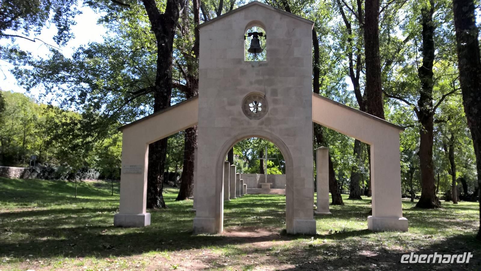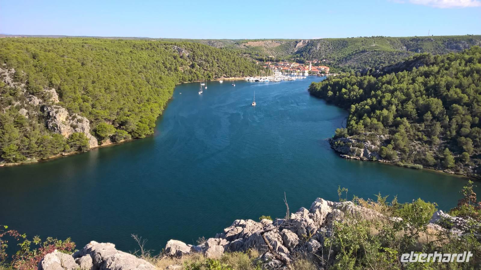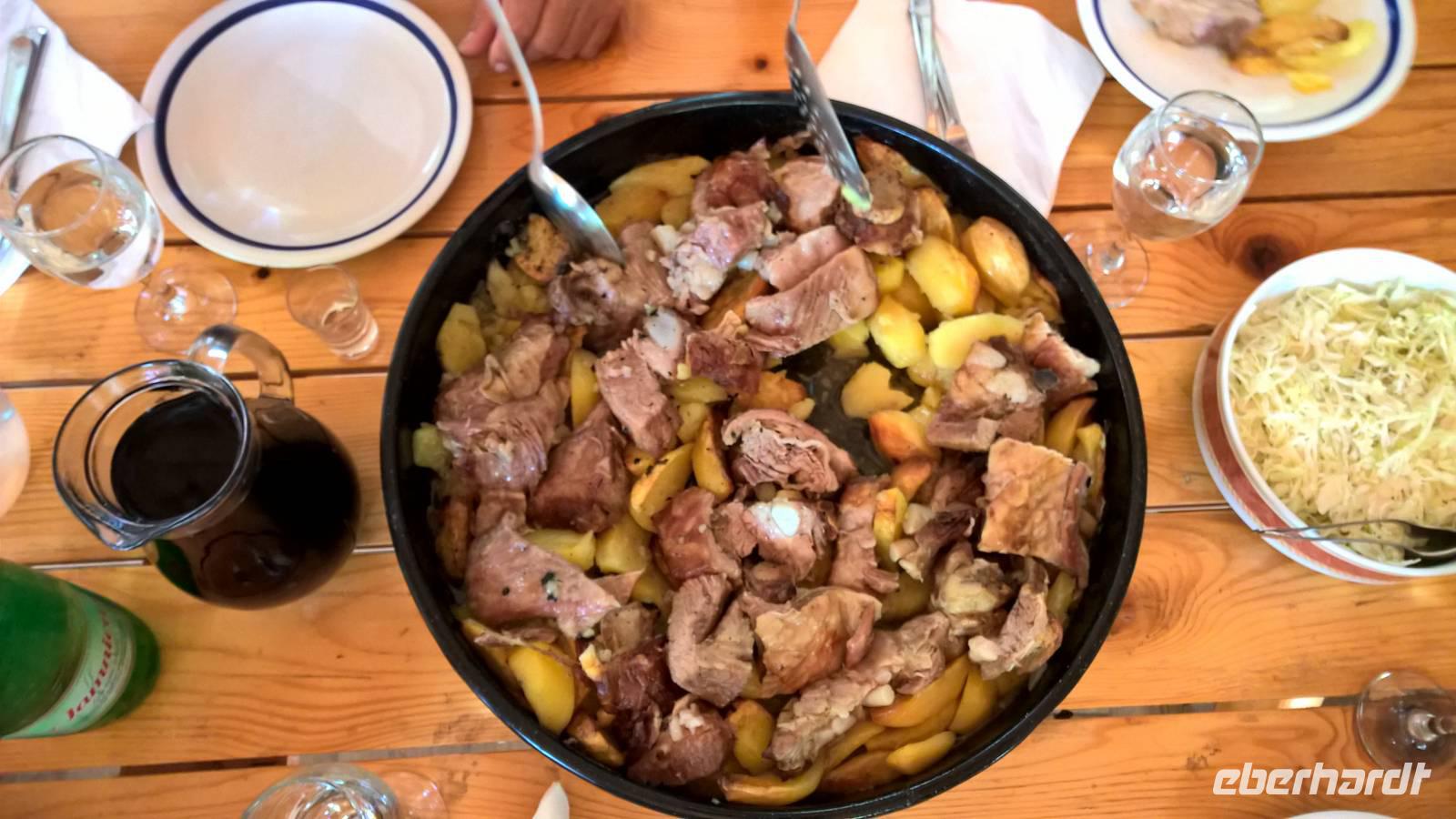 Pünktlich und gut gestärkt treffen wir uns nach dem Frühstück mit Boris vorm Hotel. Wir steigen in den Bus und fahren gen Norden, in die Berge. Es ist unglaublich, wie schnell sich die Landschaft während der Strecke verändert und was sie für verschiedene Facetten zu bieten hat. Unterwegs steigt Bernada dazu, eine Frau die in Deutschland geboren ist aber nun seit über 15 Jahren in diesem Gebiet wohnt und uns gern mehr darüber erzählen möchte. Unser erster Stopp findet am Grünen See statt, der uns wieder einmal mit einer unglaublich türkisen Farbe entgegen leuchtet. Wir schießen unsere Fotos und fahren weiter. Am Roten See bietet uns Boris kostenloses Bier an- wenn wir es schaffen, einen Stein bis ins Wasser zu schießen. Das Bier müssen wir zahlen. Nun kommen wir in der kleinen Stadt Imotski an und lassen den Bus auf dem Parkplatz stehen. Zu Fuß besichtigen wir die alte Festung Topana und den darunterliegenden Blauen See. Danach schauen wir uns den Stadtkern an, in dem wir etwas Freizeit bekommen und einen Kaffee trinken oder ein erfrischendes Eis schlecken. Unsere Fahrt führt uns zwei Kilometer weiter, zu einem besonderen Platz im Freien: der Grünen Kathedrale. Hierbei handelt es sich um einen großen Park, in dem eine Kathedrale ohne Dach und ohne Wände steht. Es gibt einen Torbogen mit Glocke und mehrere Säulen, sowie einen großen Altar mit dazugehörigem Kreuz. Die Frage, warum das Kunstwerk nun also Grüne Kathedrale heißt, erübrigt sich beim Blick nach oben in die Baumkronen und das Blätterdach. Unsere knurrenden Mägen erwartet nun ein besonderes Highlight. Wir kehren in einem alten Familien-Gasthof ein, in dem wir traditionell bekocht werden. Hier schauen wir uns die Zubereitung unserer Speisen unter großen Metallglocken an und die Stimmung steigt mit jedem Schnaps noch ein bisschen mehr. Das Restaurant ist direkt an einem Fluss gelegen und macht einen sehr idyllischen Eindruck. Als wir zu Tisch gebeten werden staunen wir nicht schlecht: Es gibt Kartoffeln, saftiges Fleisch, Salat und Brot aus großen Messing-Schüsseln und es schmeckt hervorragend. Was nicht zu überhören ist, da man kaum Gespräche und hauptsächlich Besteck klappern und Gläser klirren hört. Dies war tatsächlich das beste Essen, was wir bisher vorgesetzt bekommen haben. Wir loben die Familie des Gasthofes und bekommen zum Nachtisch frische Kreppelchen mit Puderzucker und Kaffee serviert. Die Hälfte des Aufenthalts werden Lieder gesungen und Gedichte aufgesagt und wir haben einen wunderbaren frühen Nachmittag inmitten der Berge und weitab von touristischen Verkaufsständen. Nach dem Abendessen im Hotel verabreden wir uns zu einem letzten gemeinsamen Zusammensitzen, denn am morgigen Tag verlässt uns eine Familie, die mit dem Auto angereist ist. Wir stoßen noch einmal an einer langen Tafel auf den so vielfältigen und spannenden Urlaub in Kroatien an und ich bekomme einen Ritterschlag für meine erste erfolgreich begleitete Reise bei Eberhardt Travel. Ein schönes Gefühl der Verbundenheit und der ein oder anderen neu gewonnenen Freundschaft erfüllt den Raum.