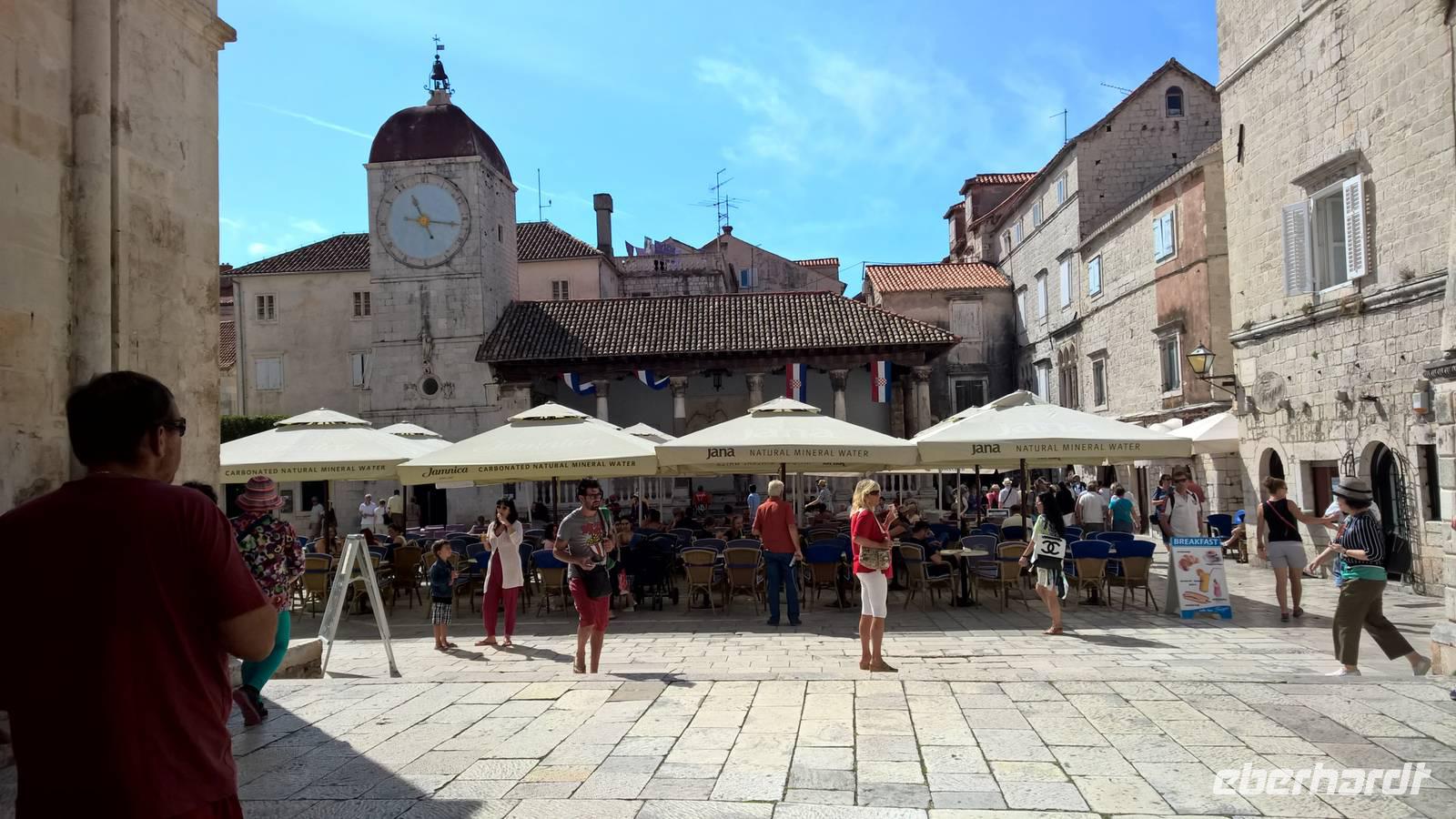 Wir starten von Berlin, Leipzig und Dresden und treffen uns das erste Mal am Münchener Flughafen. Die Zeit bis der Flieger nach Split bereit ist, verfliegt dank dem ein oder anderen Cappuccino oder belegtem Panini-Brot schneller, als gedacht. Fast genauso schnell, wie die Flugzeit von München nach Split: Mehr als zwanzig Minuten können das nicht gewesen sein. Schon im Flieger stelle ich fest, dass wir eine dufte Truppe sein werden. Kaum ein Gast schweigt, alle unterhalten sich und plappern in freudiger Erwartung und zurückhaltender Aufregung. In Split angekommen und mit den Koffern im Schlepptau treffen wir auf unsere örtliche Reiseleiterin, Silvija. Eine kleine, herzliche Dame mit ruhiger und sicherer Ausstrahlung. Sie führt uns zum Bus, in dem wir die nächsten 14 Tage Kroatien erkunden, kennen und lieben lernen werden. Auf dem Weg zum Hotel treffen wir auf eine massive, dunkle Wolkenwand, die drei Kilometer neben uns ihre Blitze in den Boden jagt. Der Blick aus der anderen Seite des Busses zeigt warmen, goldenen Sonnenschein. Dieses Naturschauspiel gibt uns das Gefühl, in einer anderen Region, einem anderen Land angekommen zu sein und schürt die Vorfreude auf die kommenden Tage. Im Hotel checken wir ein, beziehen unsere Zimmer und freuen uns, dass nach der doch etwas längeren Anreise ein hiesiges Buffet für uns bereit steht. Wir schlagen uns die Bäuche mit frischem Thunfisch, knackigen Meeresfrüchtesalaten, Spinat und leckerem, frischen Obst oder einem süßen Stück Kuchen voll. Nach einem kleinen Spaziergang fallen auch die Letzten in die Kissen der breiten Hotelbetten und freuen sich auf den nächsten Tag- in Kroatien.
