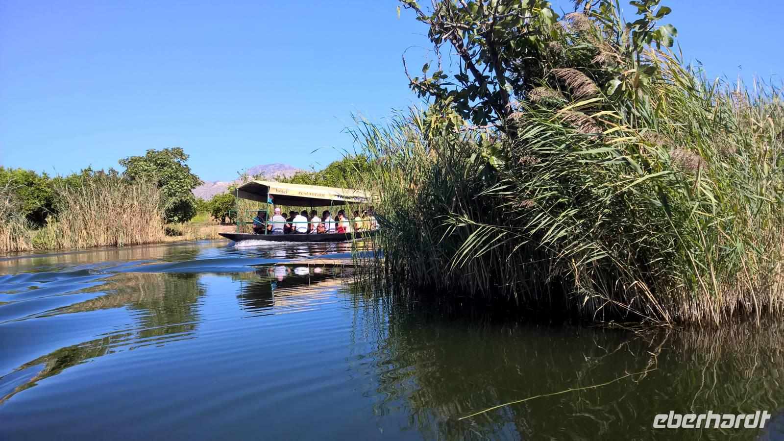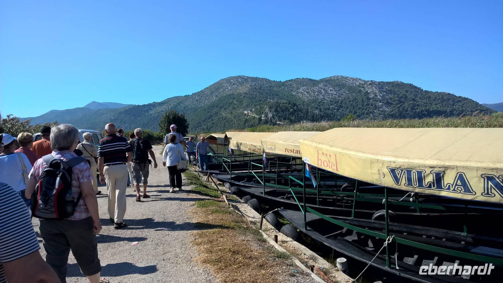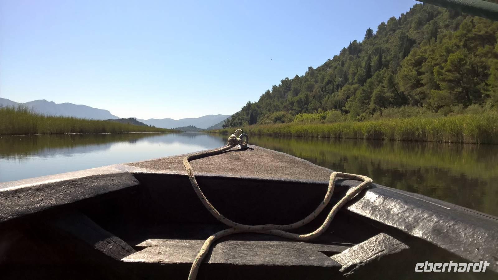 Nach einer angenehmen Nacht in großen Betten sitzen wir im Frühstückssaal und bedienen uns am Buffet. Heute liegt die letzte Etappe vor uns: Wir machen uns auf den Weg von Mostar nach Tucepi. Nach Überqueren der Grenze halten wir an einer kleinen Einbuchtung der Straße und laufen einen Feldweg entlang, hinein ins Grüne. Ein paar Minuten später stehen wir umgeben von großen Schilfpflanzen und neben zwei dalmatinisch-gekleideten Männern mit Akkordeon und Gitarre am Fluss. Vor uns liegen zwei Holzgondeln im Wasser. Wir klettern behutsam auf die Boote und bekommen zu unserer Freude erst einmal einen Schnaps vom Gondelfahrer eingeschenkt. Nun kann die Fahrt beginnen. Der Himmel ist blitzeblau und die Sonne lacht, während wir - nun nur noch umgeben von unberührter Natur - sanfte Wellen auf der Wasseroberfläche hinterlassen. Wir tuckern um eine Kurve, die Musikanten spielen ihre traditionellen Lieder und vor uns eröffnet sich der Blick auf die Berge. Es sieht atemberaubend aus. Seerosen, Schilf und Felsen ziehen an uns vorbei, der Fahrtwind bläst uns angenehm ins Gesicht und wir erreichen eine kleine Taverne, direkt am Fluss. Große, robuste Holztische sind für uns eingedeckt und die Kellner bringen uns nach einer netten Begrüßung karaffenweise Wein an die Plätze. Alle plaudern munter durcheinander und es gibt Salat, Kartoffeln und Fleisch sowie eine typische Nachspeise aus Dalmatien: Rožata, das kroatische Créme Caramel. Ich nutze die Gelegenheit, in der sich alle entspannt und mit vollen Bäuchen in die Bänke zurücklehnen und bedanke mich im Namen der gesamten Gruppe bei Silvija und Boris für ihre Unterstützung und Bereicherung unserer Rundreise. Die Musiker spielen auf und einer nach dem anderen erhebt sich und beginnt, auf der Terrasse zu tanzen. Ein Tanz in einer kleinen Taverne, mitten im Neretva-Delta und umgeben von unglaublicher Natur. Ich bin sehr gerührt von dieser schönen Szene. Auf der Gondelfahrt zurück zum Bus gibt es wieder Schnaps und die Musiker werden tatkräftig mit Gesang unterstützt, aus Gesichtern mit geröteten Wangen und strahlenden Augen. An diesen Ausflug werden wir uns noch lange Zeit erinnern. Wir fahren zum Hotel Alga, in dem wir unsere letzten Tage Urlaub genießen werden.