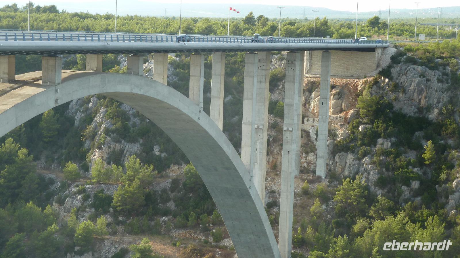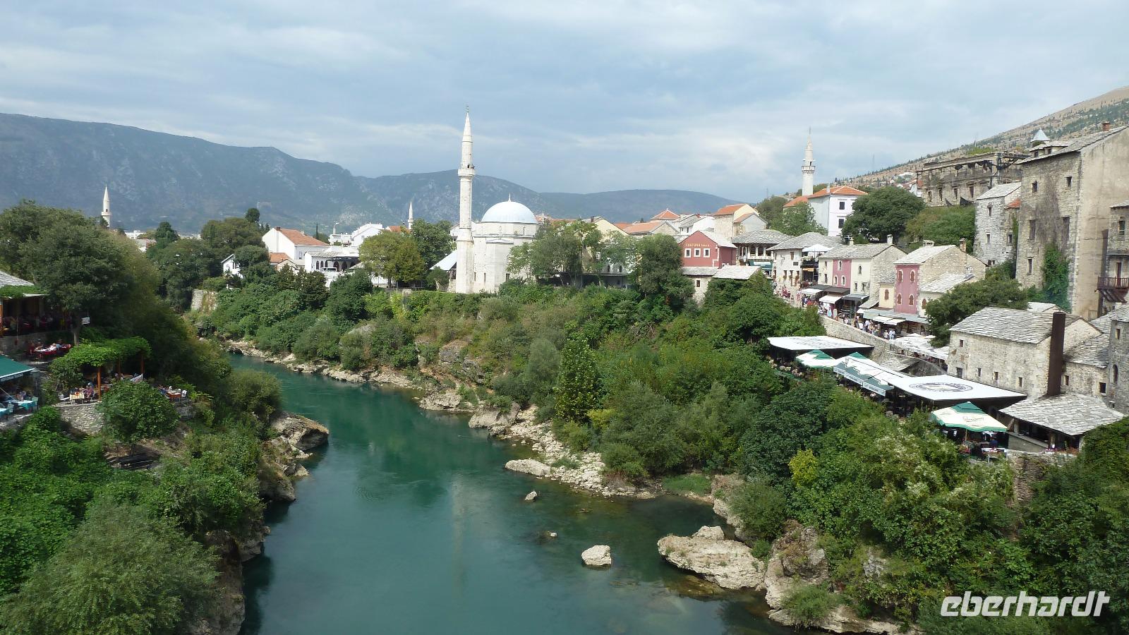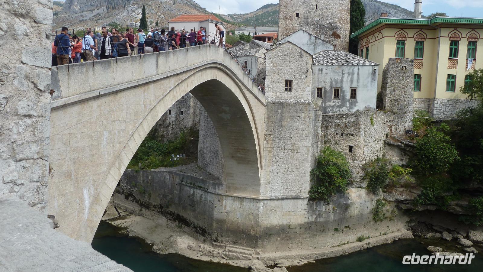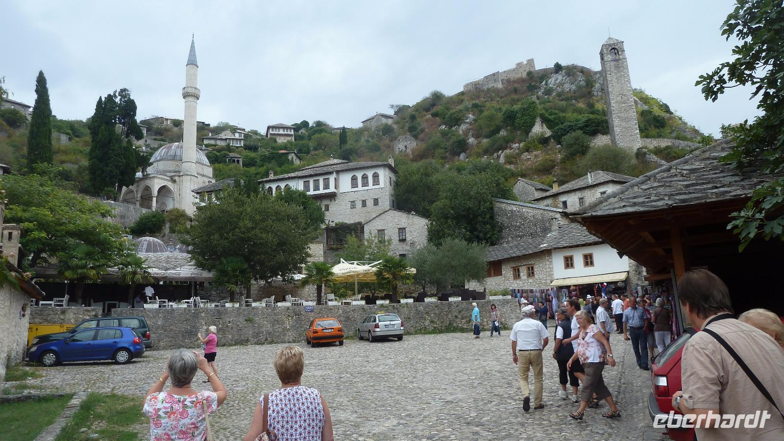 Auf unserem Ausflugsplan stand heute die Herzegovina mit ihrer Hauptstadt Mostar. Um dahin zu gelangen mussten wir die Grenzen zu Neum und die Grenze nach dem Ort Metkovic passieren. Die Fahrt führte uns ab Opuzen immer im Tal der Neretva entlang. Dieser Teil der Herzegovina ist vorwiegend von Kroaten bewohnt, was sich sehr stark an den Fahnen erkennen ließ. Durch die besonders zügige Grenzabfertigung hatten wir Zeit für einen Stop im historischen Pocitelj. Gegen 12:40 Uhr erreichten wir den Parkplatz an der Franziskanerkirche und wurden von der Stadtführerin Almira erwartet. Gemeinsam spazierten wir von hier aus in die Altstadt. Während des Rundgangs sahen wir immer noch viele zerstörte Gebäude. Verfallene und ausgebrannte Gebäude sowie Einschusslöcher sind Zeitzeugen des Krieges. Bei dem Rundgang durfte natürlich die berühmte „Alte Brücke" nicht fehlen. Sie ist 2005 wieder aufgebaut worden, mit den Steinen der vorher zerstörten Brücke. Die Brückenspringer werben um zahlungsfreudige Gäste, um für 30€ den Sprung in die Tiefe zu wagen. Um 16:00 Uhr verließen wir die Altstadt Mostar und fuhren zum Hotel Bristol.