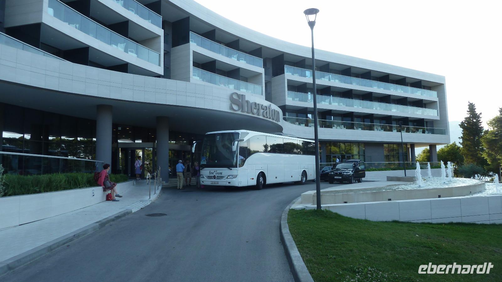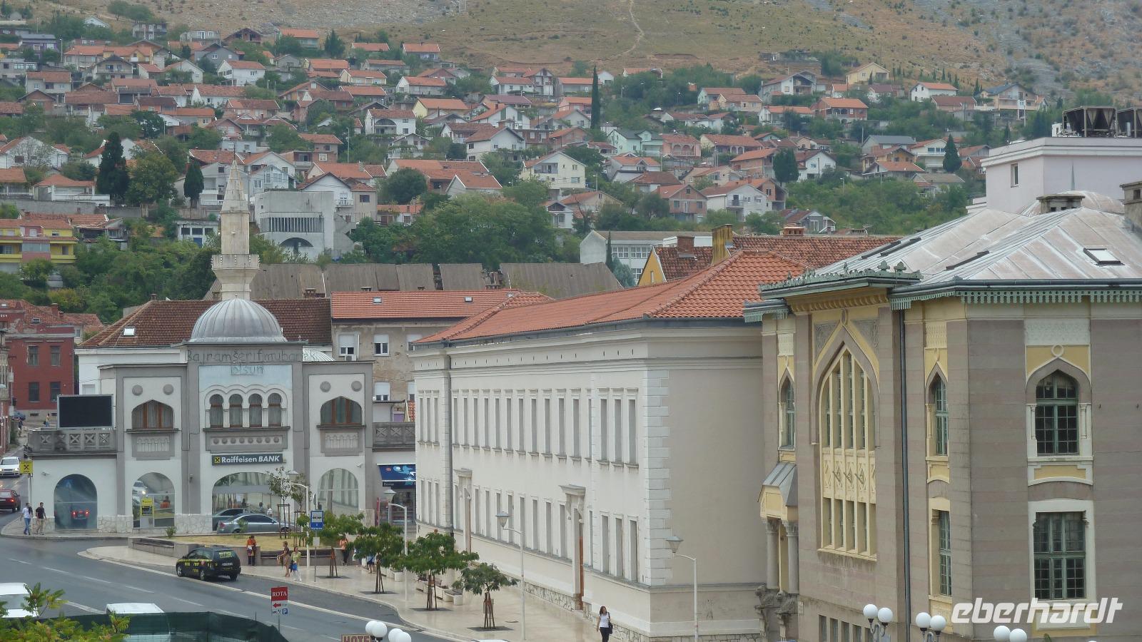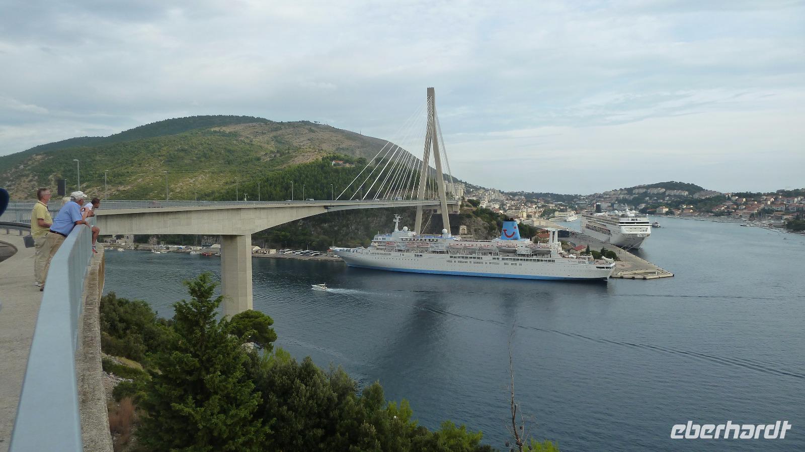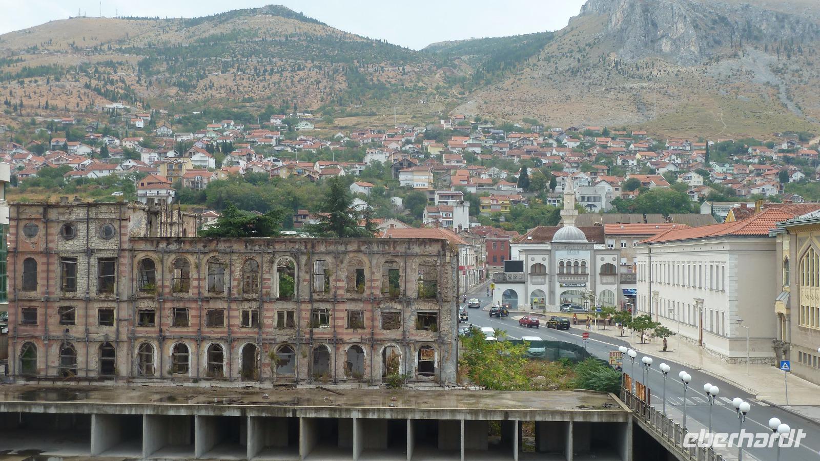 Auf unserem Ausflugsplan stand heute die Herzegovina mit ihrer Hauptstadt Mostar. Um dahin zu gelangen mussten wir die Grenzen zu Neum und die Grenze nach dem Ort Metkovic passieren. Die Fahrt führte uns ab Opuzen immer im Tal der Neretva entlang. Dieser Teil der Herzegovina ist vorwiegend von Kroaten bewohnt, was sich sehr stark an den Fahnen erkennen ließ. Durch die besonders zügige Grenzabfertigung hatten wir Zeit für einen Stop im historischen Pocitelj. Gegen 12:40 Uhr erreichten wir den Parkplatz an der Franziskanerkirche und wurden von der Stadtführerin Almira erwartet. Gemeinsam spazierten wir von hier aus in die Altstadt. Während des Rundgangs sahen wir immer noch viele zerstörte Gebäude. Verfallene und ausgebrannte Gebäude sowie Einschusslöcher sind Zeitzeugen des Krieges. Bei dem Rundgang durfte natürlich die berühmte „Alte Brücke" nicht fehlen. Sie ist 2005 wieder aufgebaut worden, mit den Steinen der vorher zerstörten Brücke. Die Brückenspringer werben um zahlungsfreudige Gäste, um für 30€ den Sprung in die Tiefe zu wagen. Um 16:00 Uhr verließen wir die Altstadt Mostar und fuhren zum Hotel Bristol.