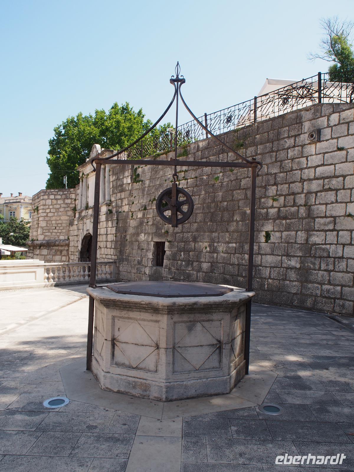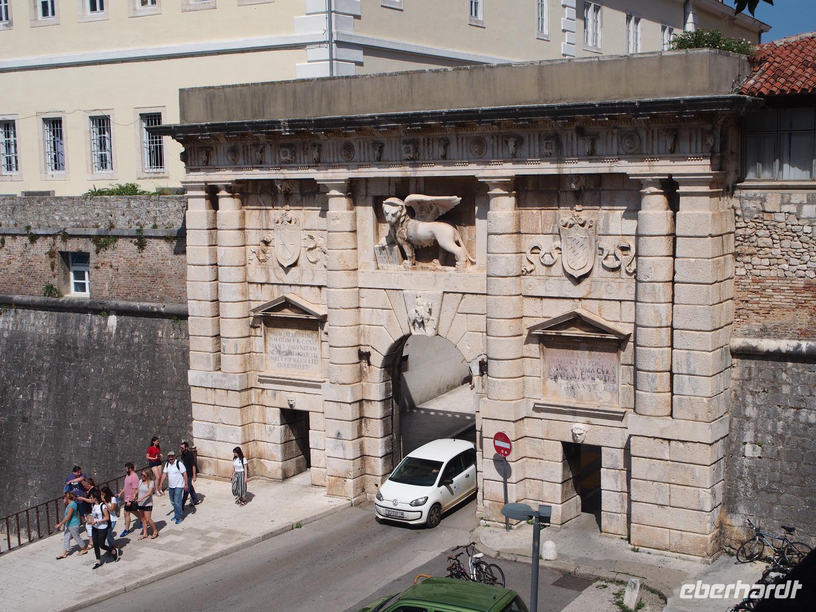 Nach dem Frühstück starten wir unseren ersten Ausflug in die nahegelegene ehemalige Hauptstadt Dalmatiens: Zadar. Die älteste Stadt der Region hat eine sehr interessante Geschichte mit zahlreichen Machtwechseln vorzuweisen und zahlreiche architektonische Relikte können dies noch belegen. An der Riva, der langen Uferpromenade, empfängt uns unsere Stadtführerin Meri und zeigt uns zunächst die moderne Komponente der Altstadt: die Meeresorgel und die Installation „Gruß an die Sonne", die der Architekt Nikola Bašic entworfen hat, in Anlehnung an Alfred Hitchcocks Begeisterung für die Sonnenuntergänge in der kroatischen Hafenstadt. Dann geht es weiter in die Altstadt hinein. Mit sehr viel Witz und Bereitschaft auf all unsere Fragen einzugehen, führt uns Meri durch ihre Stadt, an der Donatuskirche vorbei, zur Kathedrale, weiter über das römische Forum, durch die engen Gassen mit venezianischen Palästen bis zum Park oberhalb des Löwentors. Vom Fünf-Brunnen-Platz geht es dann noch weiter zum Benediktinerinnenkloster bis zum Hauptplatz mit der Loggia, der Wache und dem Rathaus. Unsere Führung endet auf dem Marktplatz, wo sich die perfekte Möglichkeit bietet, als keinen Mittagsimbiss den berühmten Käse der nahegelegenen Insel Pag zu probieren, bevor wir nach der Pause dorthin weiterfahren.
