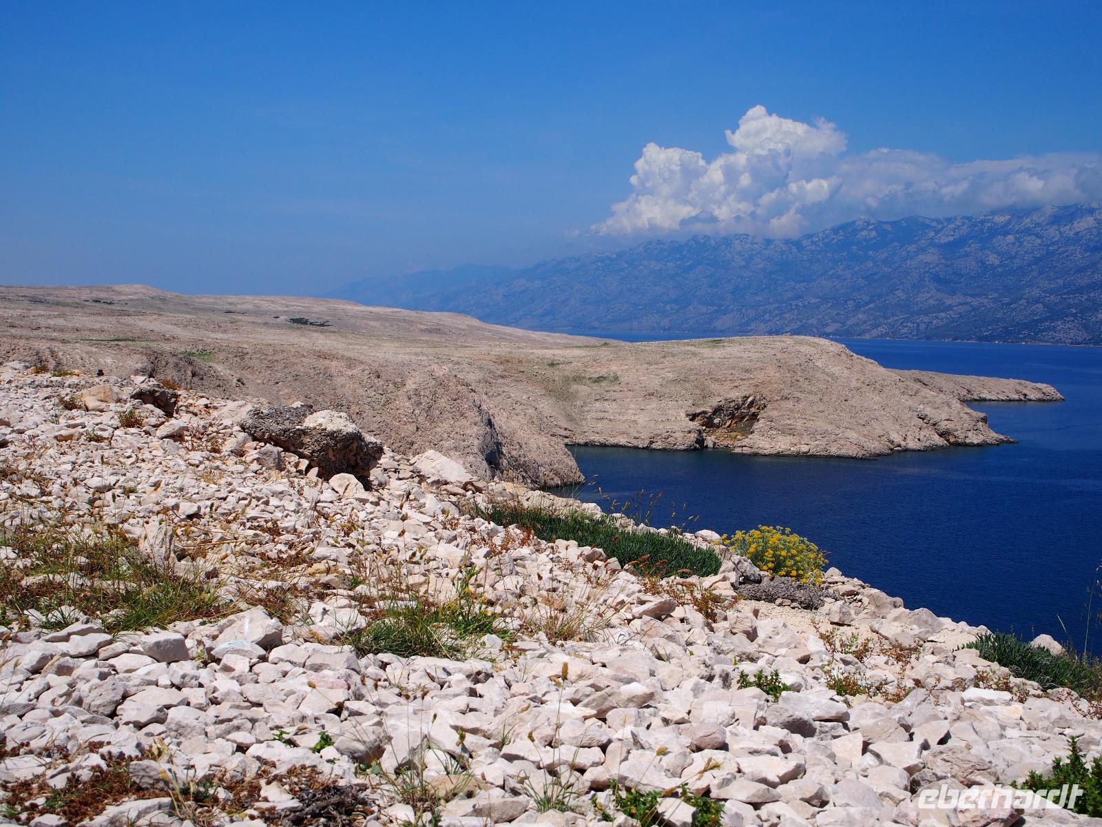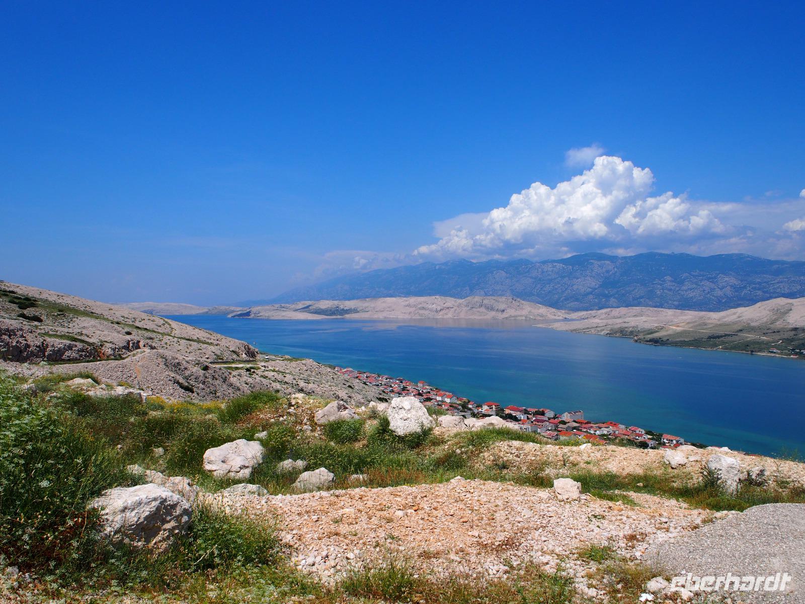 Am frühen Nachmittag führt uns unser Weg dann weiter landeinwärts. Wir durchfahren die Obstgärten des Hinterlandes und haben bei strahlendem Sonnenschein eine herrliche Sicht auf das Velebit Gebirge, das sich etwa 30 km hinter der Küste majestätisch auftürmt. Bevor wir Pag erreichen, machen wir einen kurzen Stopp vor der 300 m langen Brücke, die die Insel mit dem Festland verbindet. Von hier hat man einen fantastischen Blick, sowohl auf die Küste des Festlandes, als auch auf die karge Landschaft der Insel und die Brückenkonstruktion. Wir fahren über die Brücke in Richtung der Stadt Pag, vorbei an den berühmten Salzgärten. Bevor wir die Hauptstadt der Insel besichtigen, fahren wir noch zu einem Aussichtspunkt von dem aus man eine wunderbare Aussicht über die Stadt und einen großen Teil der Insel hat. Da es in der Mittagssonne nun weit über 40 Grad hat, fällt unser anschließender gemeinsamer Spaziergang in Pag etwas kürzer aus als eigentlich geplant. Entlang der Riva schlendern wir in Richtung des Hauptplatzes. Auf dem Weg entdecken wir die Überreste der venezianischen Stadtmauern und einen der Türme und kommen schließlich zu Kathedrale und Rathaus auf dem Marktplatz, wo wir uns entscheiden lieber einen Eiskaffee im Schatten zu genießen.