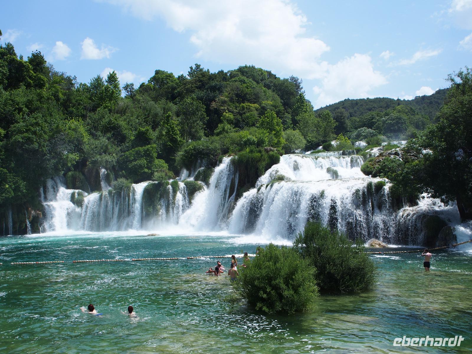 Heute führt uns unser Weg ein wenig weiter Richtung Süden. Auf unserem Plan steht zunächst der Besuch des Krka Nationalparks. Der Park umfasst ein Gebiet von 109km² und einen 45km langen Flussabschnitt der Krka zwischen den Orten Skradin und Knin. Natürlich können wir uns nicht den ganzen Park ansehen, sondern beschränken uns dieses Mal auf den bekanntesten Teil, der das Gebiet um den berühmten Wasserfall Skradinski buk umfasst. Die Krka fällt hier in 17 Stufen insgesamt 45 Meter tief hinab in ein großes Travertinbecken. Auf Holzstegen bestreiten wir gemeinsam den Rundweg durch die wunderbare Flusslandschaft und können dabei einige der hier heimischen Tierarten entdecken und zahlreiche Fotos schießen, von denen eines schöner ist als das andere.