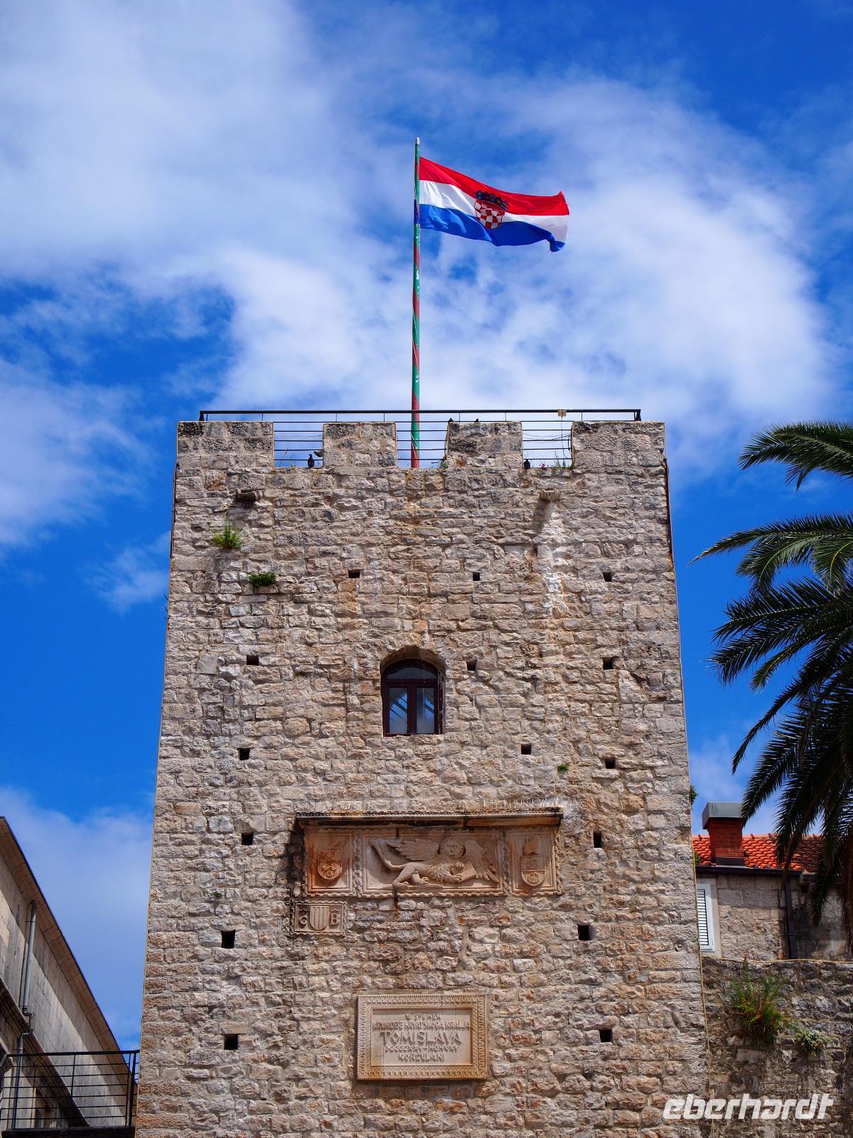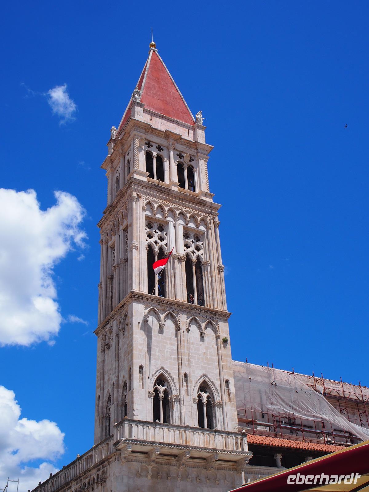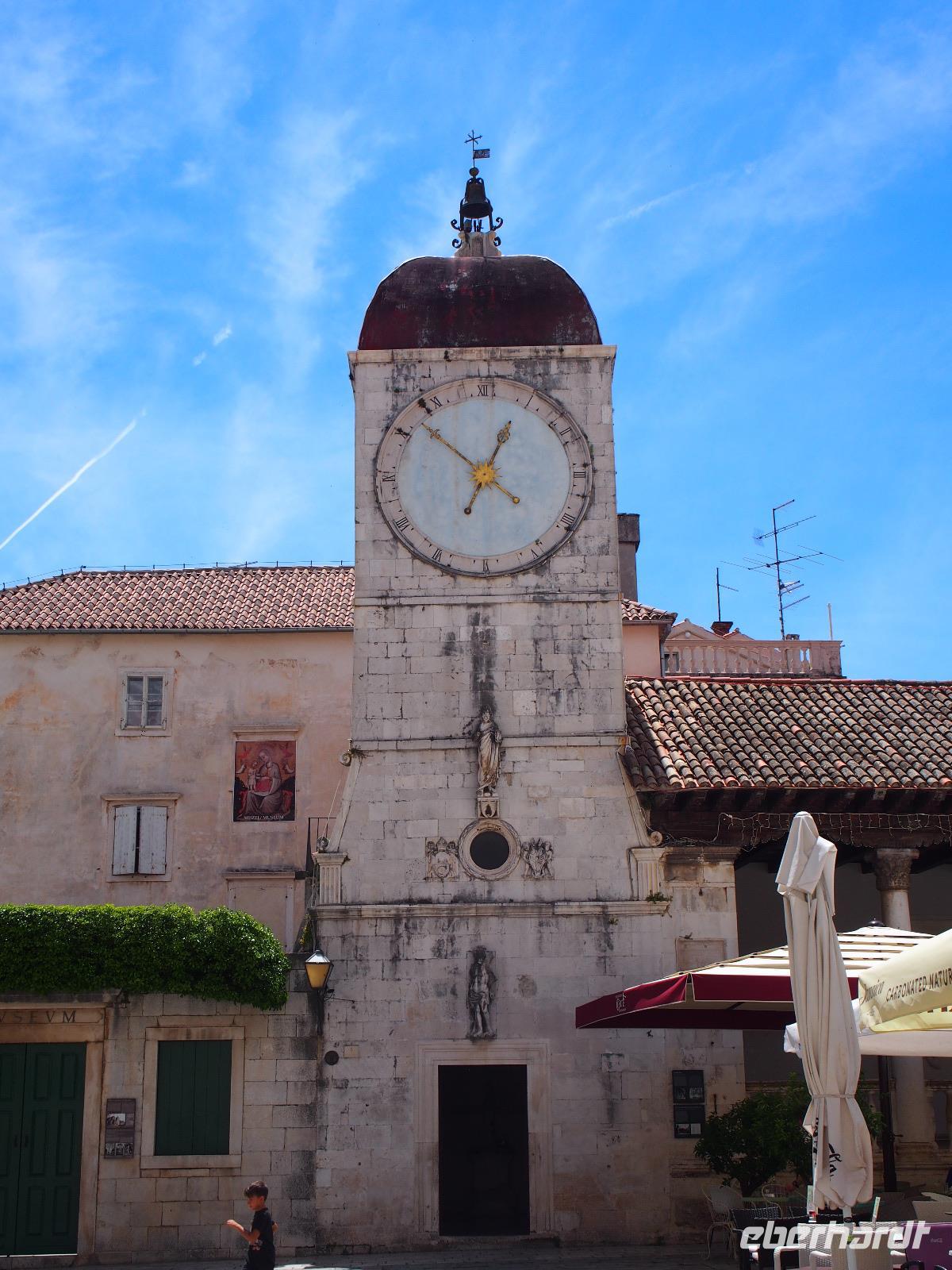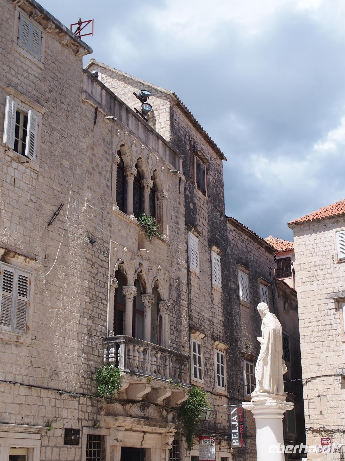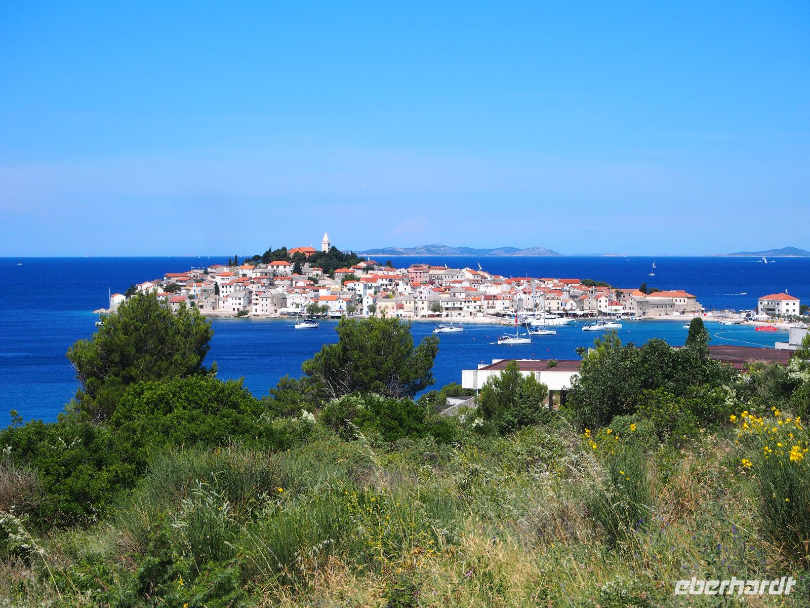Heute heißt es zum ersten Mal Abschied nehmen, wir verlassen das Hotel Pinija und brechen nach Süden auf. Dieses Mal wählen wir die schöne Route und fahren auf der Küstenstraße zunächst Richtung Šibenik. Es geht durch die kleinen Badeorte südlich von Zadar, vorbei an Biograd na Moru und dem Ort Pakoštrane, der auf einem kleinen Landstreifen zwischen Adria und dem Vraner See liegt. Unseren ersten Stopp machen wir kurz vor Šibenik, an der Kurabrücke. Die Brücke überquert hier den Fluss Krka vor seiner Mündung in die Adria. Von hier haben wir einen herrlichen Blick auf die Stadt, sowie auf die zahlreichen Muschelfarmen, die sich unter uns im Wasser befinden. Weiter geht es dann in Richtung des malerischen Örtchens Primošten, das während der Türkenbelagerungen im 16. Jahrhundert auf eine Felseninsel gebaut und erst Ende des 19. Jahrhunderts mit dem Festland verbunden wurde. Wir haben zwar nur Zeit für einen japanischen Fotostopp, aber die Aussicht ist so schön, dass doch eher ein japanischer Kurzurlaub daraus wird. Trotzdem erreichen wir die hübsche Stadt Trogir pünktlich. Am Busbahnhof treffen wir Stadtführerin Vesna, die uns durch die Altstadt führt, die zum UNESCO-Weltkulturerbe gehört. Sehr groß ist die Halbinsel nicht, sie beeindruckt jedoch durch ihr einheitliches Bild venezianischer Architektur und natürlich mit dem schönen Hauptplatz mit Loggia, Uhrturm, Rathaus und der Kathedrale des Heiligen Laurentius.