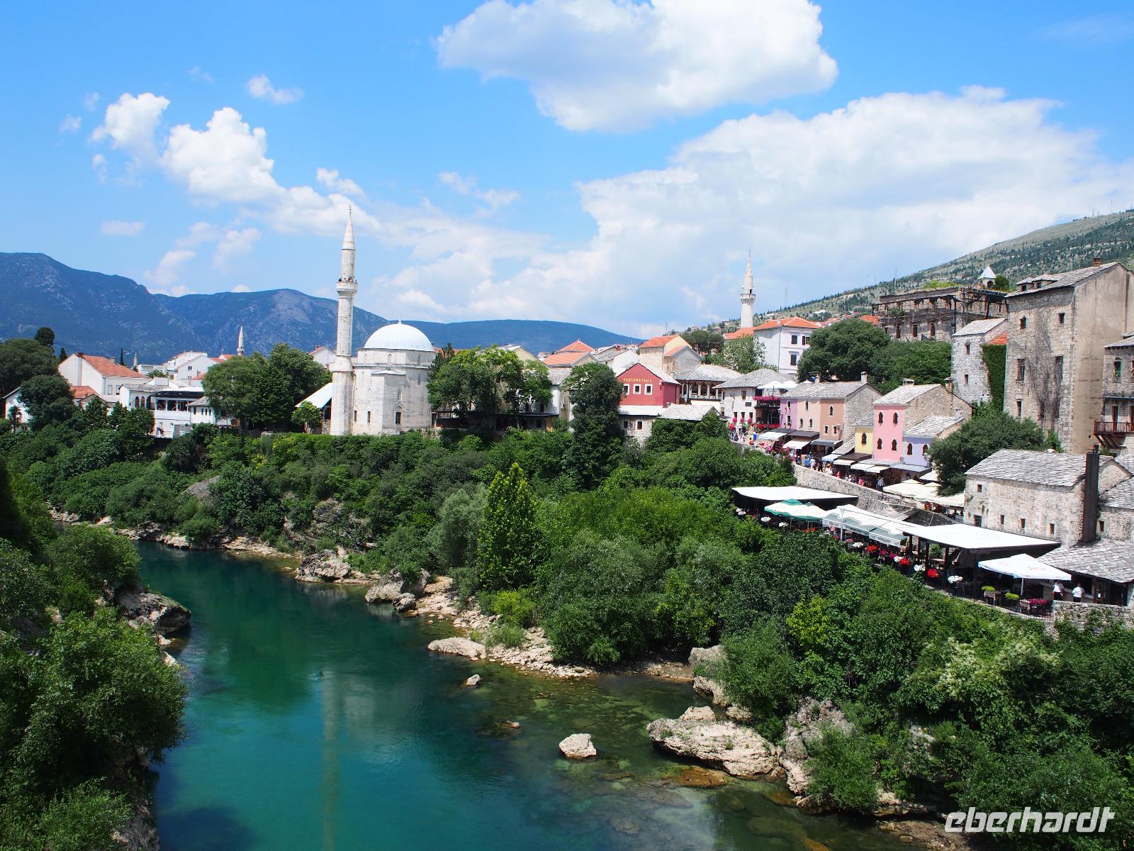 Schließlich erreichen wir die Stadt Mostar, zu Deutsch Brückenwächter, und treffen dort am neu aufgebauten Franziskanerkloster Almira, die uns durch ihre Stadt führen wird. Mit sehr viel Stolz erzählt sie uns von ihrer Heimat Herzegowina und führt uns dann in die Altstadt hinein, die nach dem Krieg mit Hilfe der UNESCO vollständig wiederaufgebaut wurde. Der Höhepunkt ist natürlich die alte Brücke über die grün-blaue Neretva. Tatsächlich ist es gar nicht so einfach sie zu überqueren, denn die abgetretenen Steine sind sehr glatt. Obwohl wir schon vorher viele Einschusslöcher in den Fassaden und übriggebliebene Ruinen gesehen haben, führt uns ein Film im neuen Heimatmuseum noch einmal ganz deutlich vor Augen, wie viel Grauen und Zerstörung der letzte Krieg hier mit sich gebracht hat. Abschließend geht es noch weiter zur Mehmed Pascha Moschee aus deren Garten man die besten Fotos von der alten Brücke schießen kann.