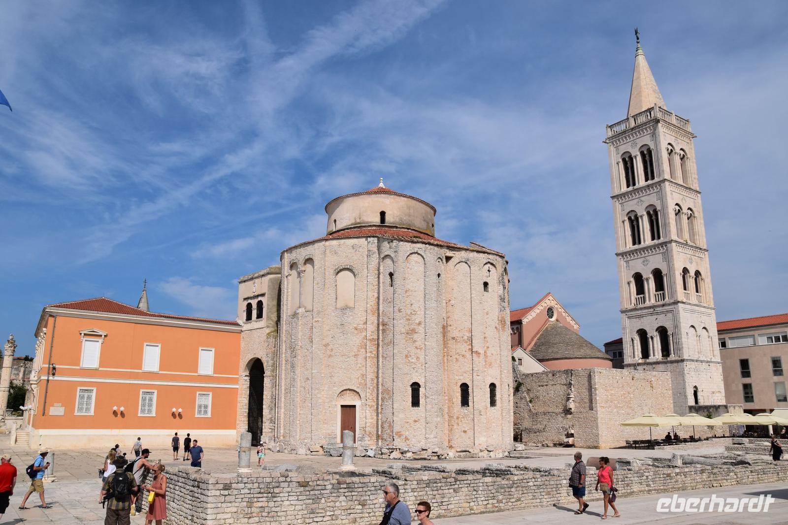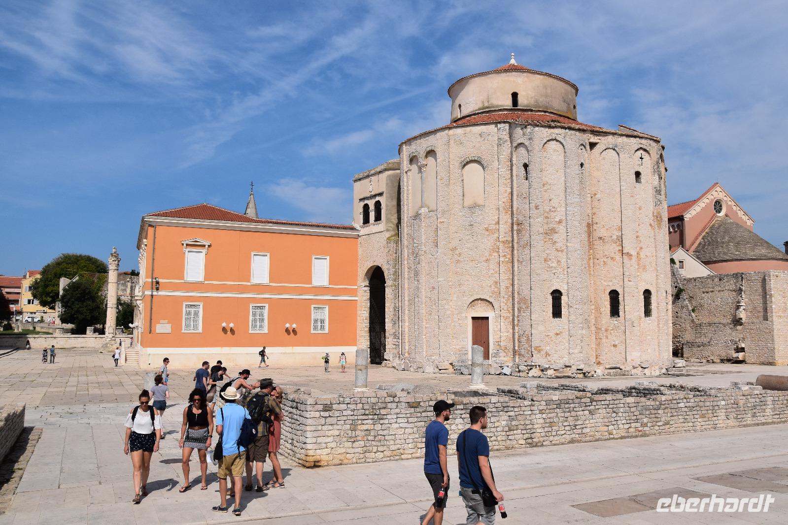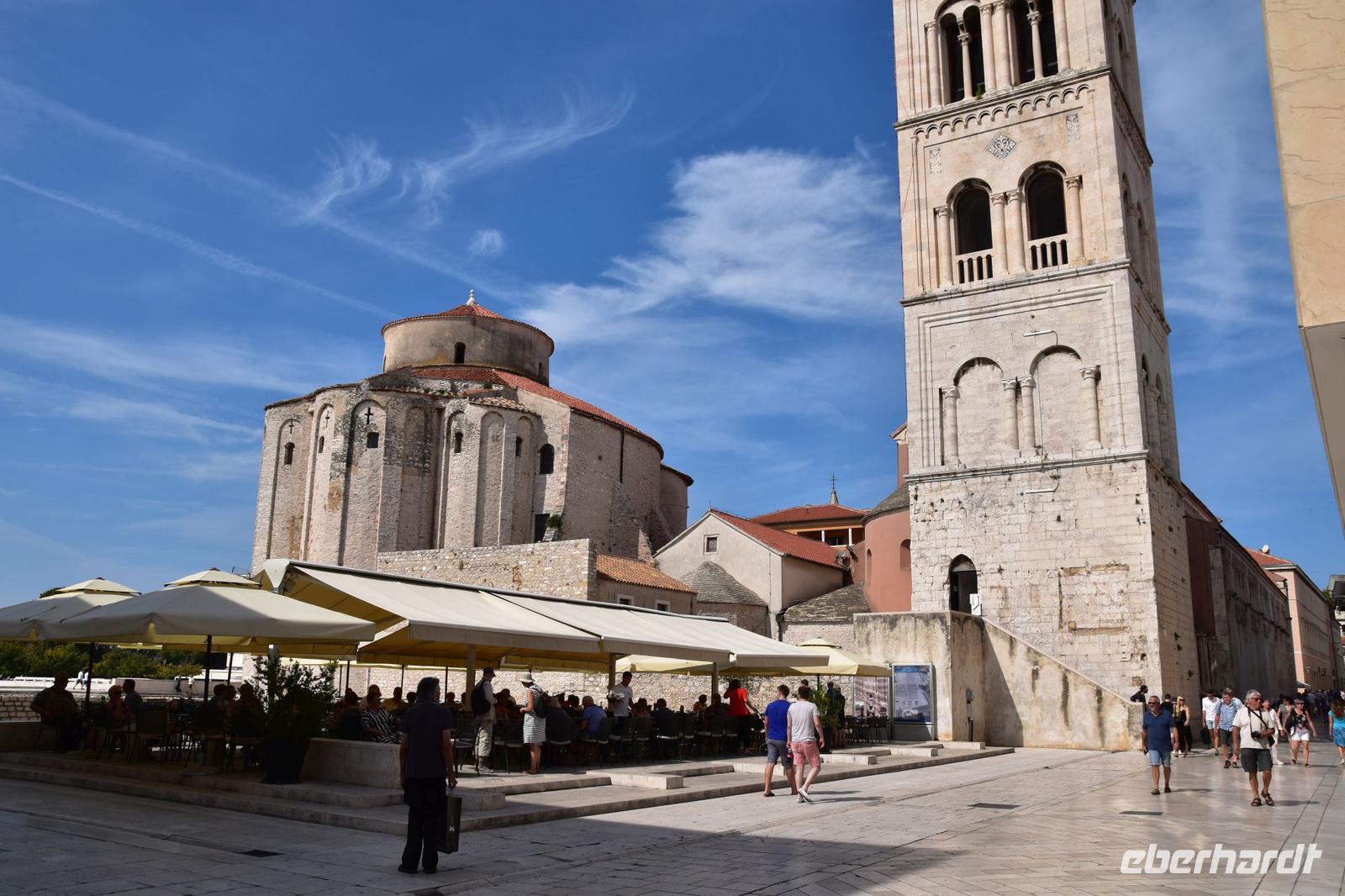 Nach ausgiebigem Frühstück fahren wir über die Küstenstraße in die nahe Stadt Zadar. Am Busparkplatz an der Stadtmauer empfängt uns die örtliche Reiseleiterin Meri, mit der wir die Stadtführung unternehmen - sehr schön, sehr interessant und auf unser Interessen zugeschnitten, zeigt uns Meri ihre Stadt. Wir spazieren zur Kathedrale, zum Forum mit dem römischen Tempel, weiter zu den modernen Sehenswürdigkeiten, wie dem Gruß an die Sonne und der Meeresorgel. Dann an der Riva entlang zur Donatuskirche, danach zum Benediktinerinnenkloster, durch die alten Gassen mit den venezianischen Palästen zum Fünf-Brunnen-Platz und von hier weiter zum Hauptplatz mit der Loggia, der Wache und dem Rathaus.