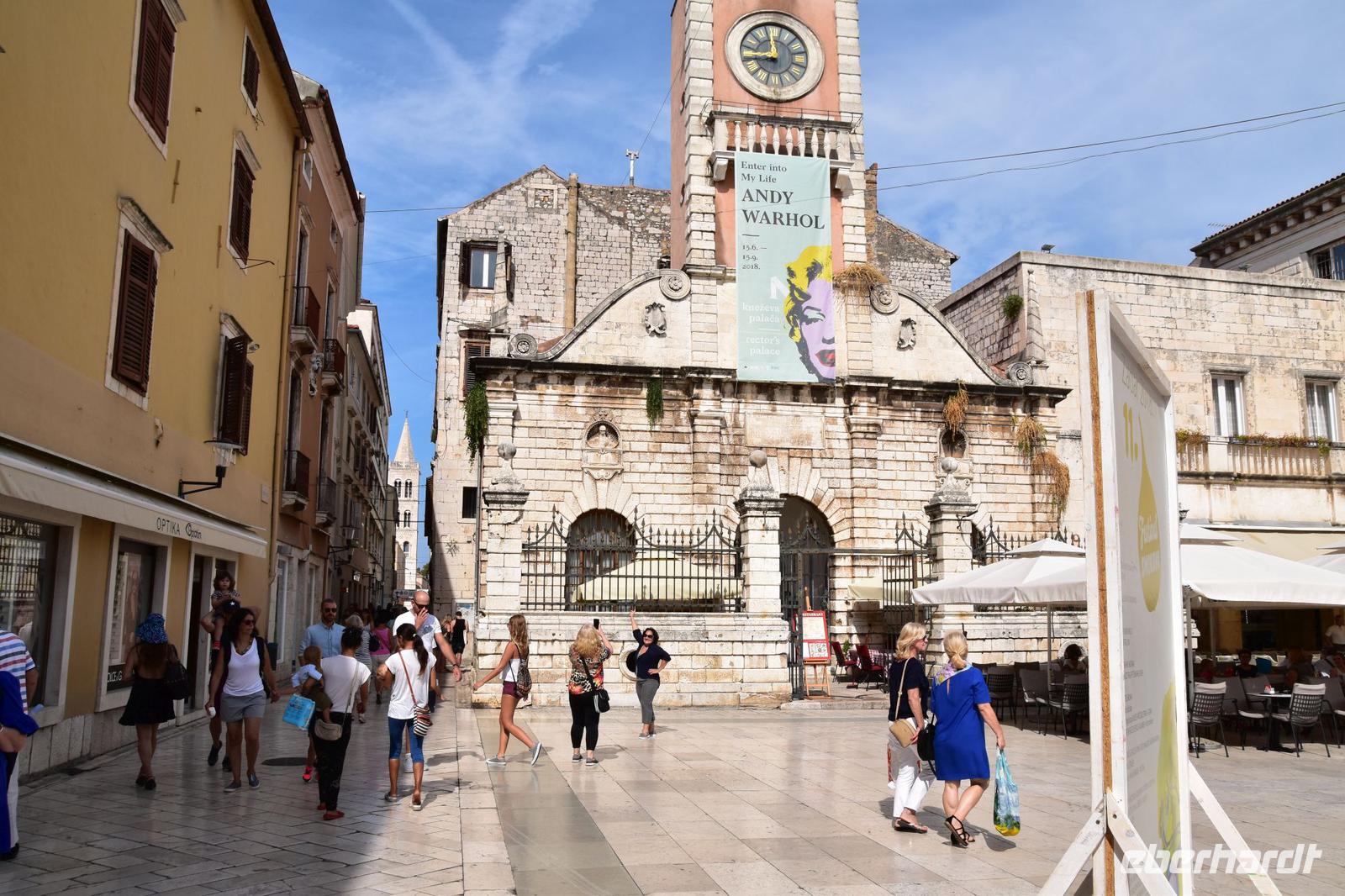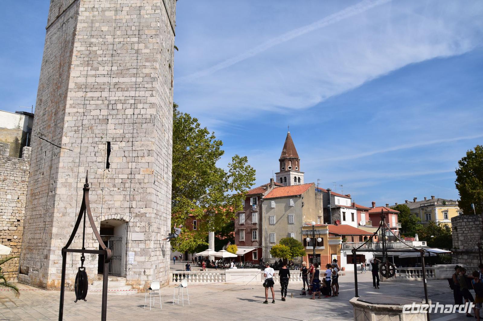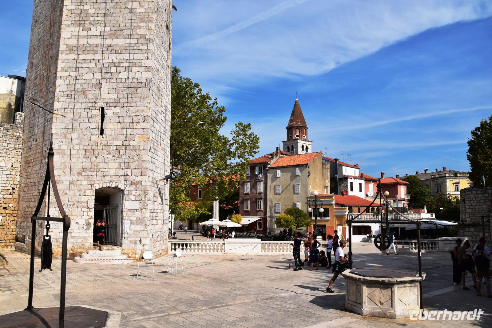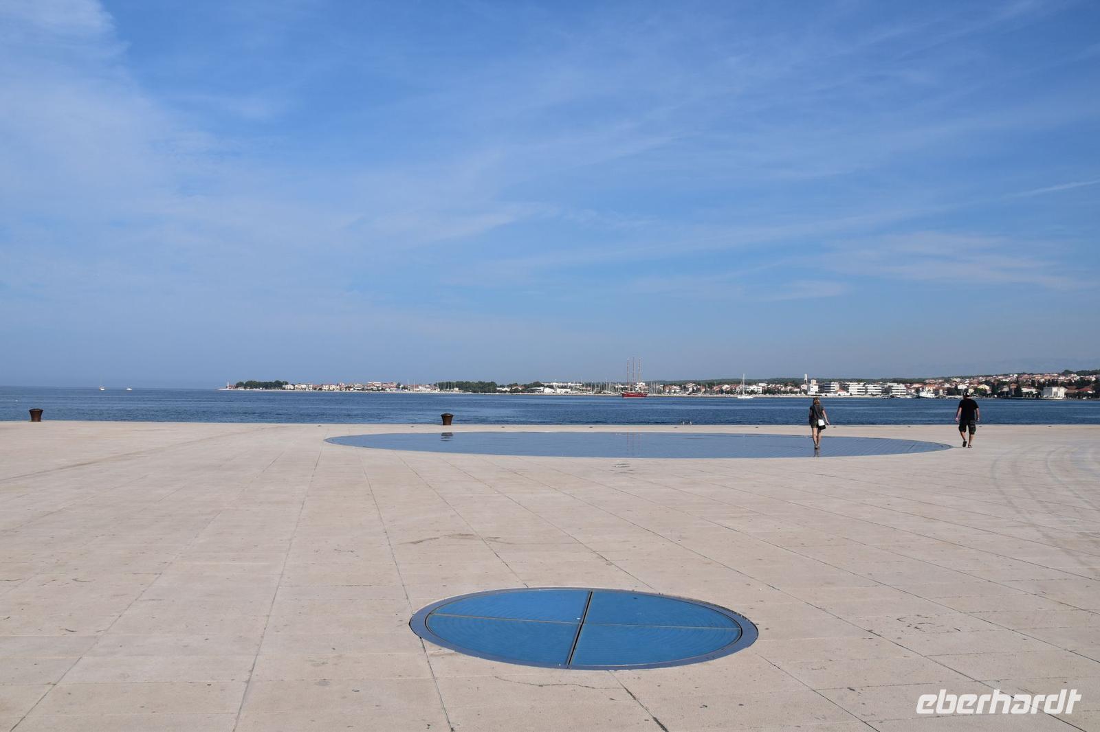 Nach ausgiebigem Frühstück fahren wir über die Küstenstraße in die nahe Stadt Zadar. Am Busparkplatz an der Stadtmauer empfängt uns die örtliche Reiseleiterin Meri, mit der wir die Stadtführung unternehmen - sehr schön, sehr interessant und auf unser Interessen zugeschnitten, zeigt uns Meri ihre Stadt. Wir spazieren zur Kathedrale, zum Forum mit dem römischen Tempel, weiter zu den modernen Sehenswürdigkeiten, wie dem Gruß an die Sonne und der Meeresorgel. Dann an der Riva entlang zur Donatuskirche, danach zum Benediktinerinnenkloster, durch die alten Gassen mit den venezianischen Palästen zum Fünf-Brunnen-Platz und von hier weiter zum Hauptplatz mit der Loggia, der Wache und dem Rathaus.