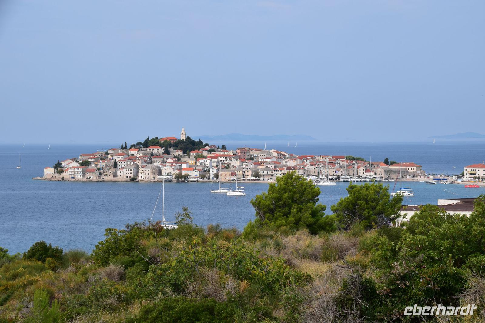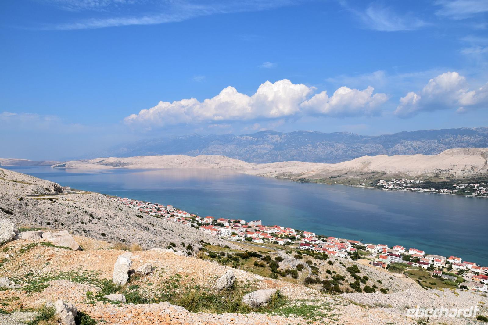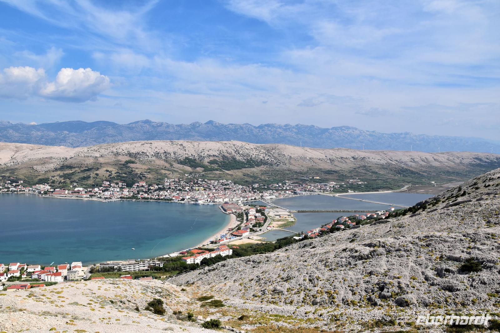 Vorbei an der Stadt Pag mit ihrer Saline, fahren wir bis zum Aussichtspunkt oberhalb von Pag und blicken von hier hinunter zur Stadt und nochmals in die faszinierende Landschaft, die deutlich die Wirkung des Bora in ihrer Kargheit erahnen lässt.